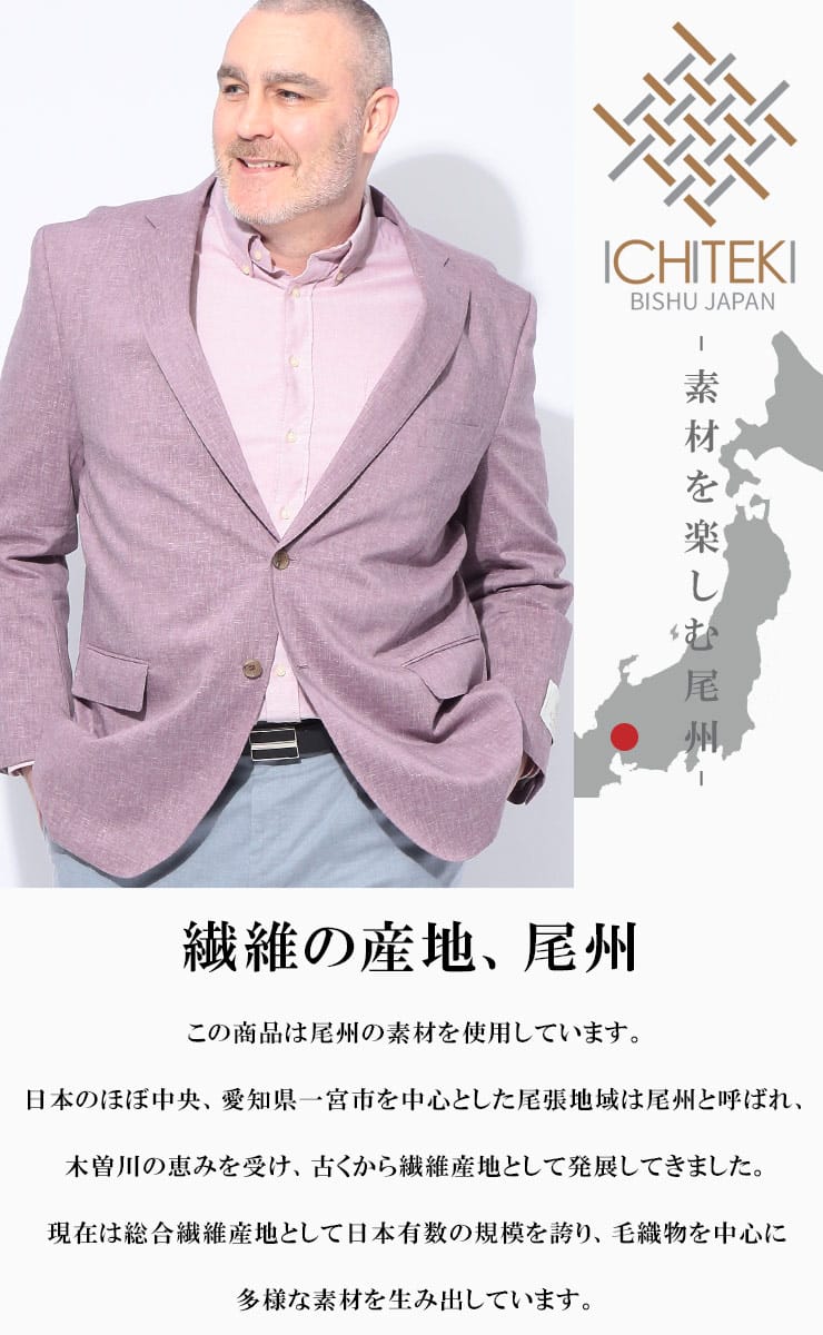 | that's ICHITEKI 日本屈指のテキスタイルメーカー「イチテキ」の高級生地を使用した、こだわり満載のテーラードジャケット。 ビジネスから休日のきれいめスタイルまで、羽織るだけで大人の品格を漂わせるこだわりの一着です。 >> ICHITEKIジャケット一覧はこちら |