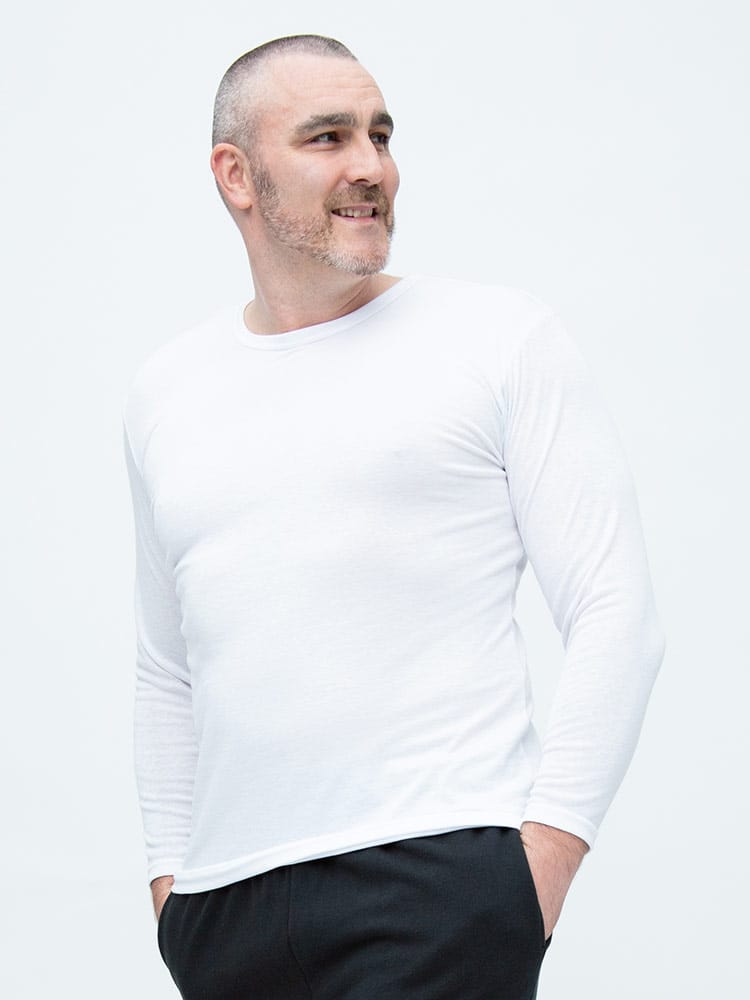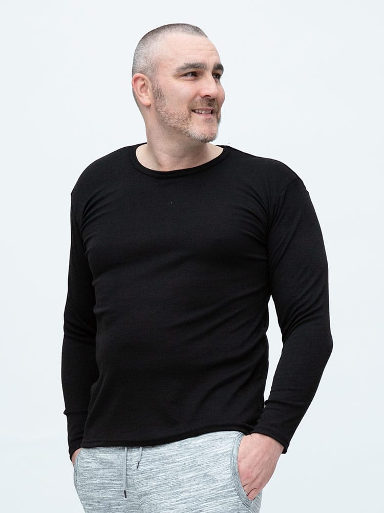 スグに発熱する「吸水発熱」で暖かな発熱 ストレッチ クルーネック 長袖 アンダーTシャツです。吸湿発熱、ストレッチ、ソフトタッチで快適な一枚。首元はベーシックなクルーネックデザイン。寒い日のビジネスシーンのアンダーウェアにおすすめです。