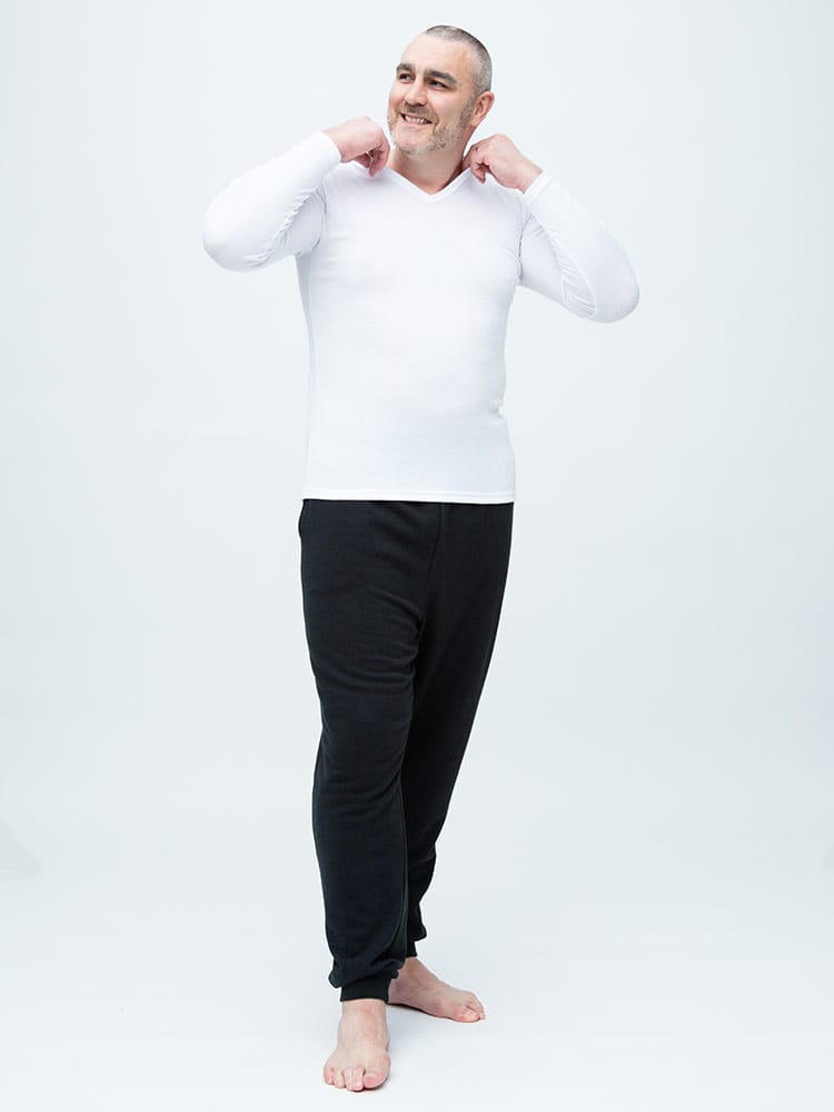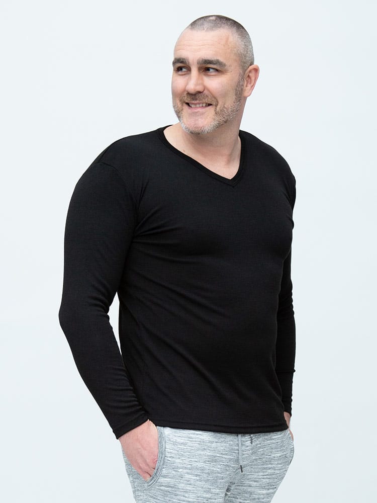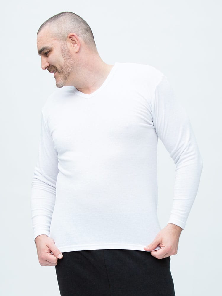 スグに発熱する「吸水発熱」で暖かな発熱 ストレッチ Vネック 長袖 アンダーTシャツです。吸湿発熱、ストレッチ、ソフトタッチで快適な一枚。首元はスッキリとしたVネックデザイン。寒い日のビジネスシーンのアンダーウェアにおすすめです。