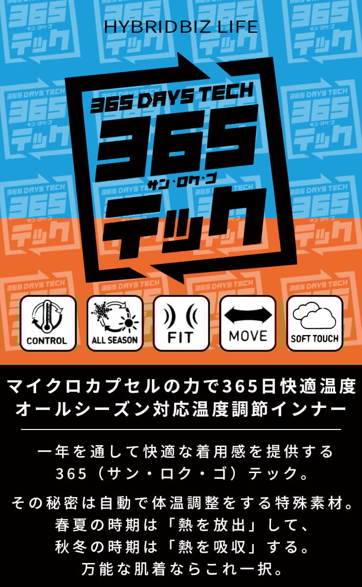 ![]() | 365日対応温度調整インナー マイクロカプセルの力で365日快適温度! オールシーズン対応の温度調節インナー『365テック』。温度を自動コントロールして常に快適な温度を保つ機能性インナーです。 >> 商品一覧はこちら |