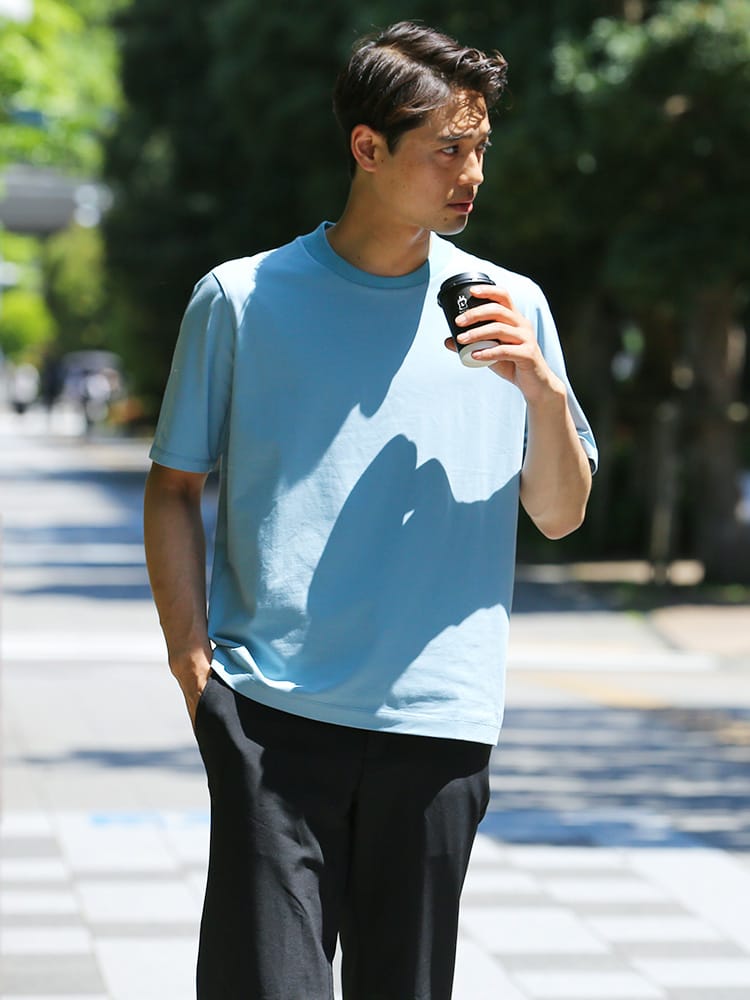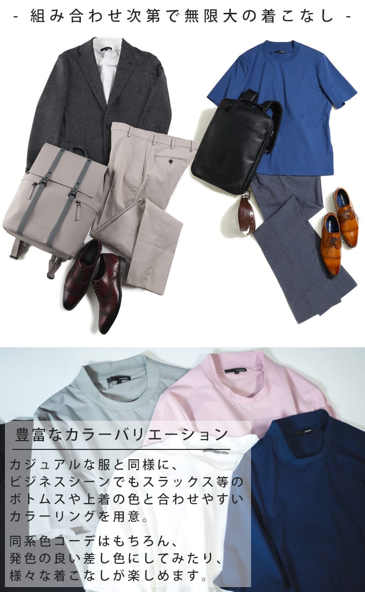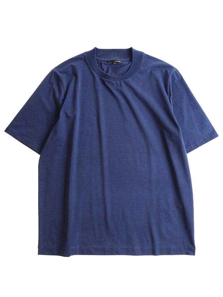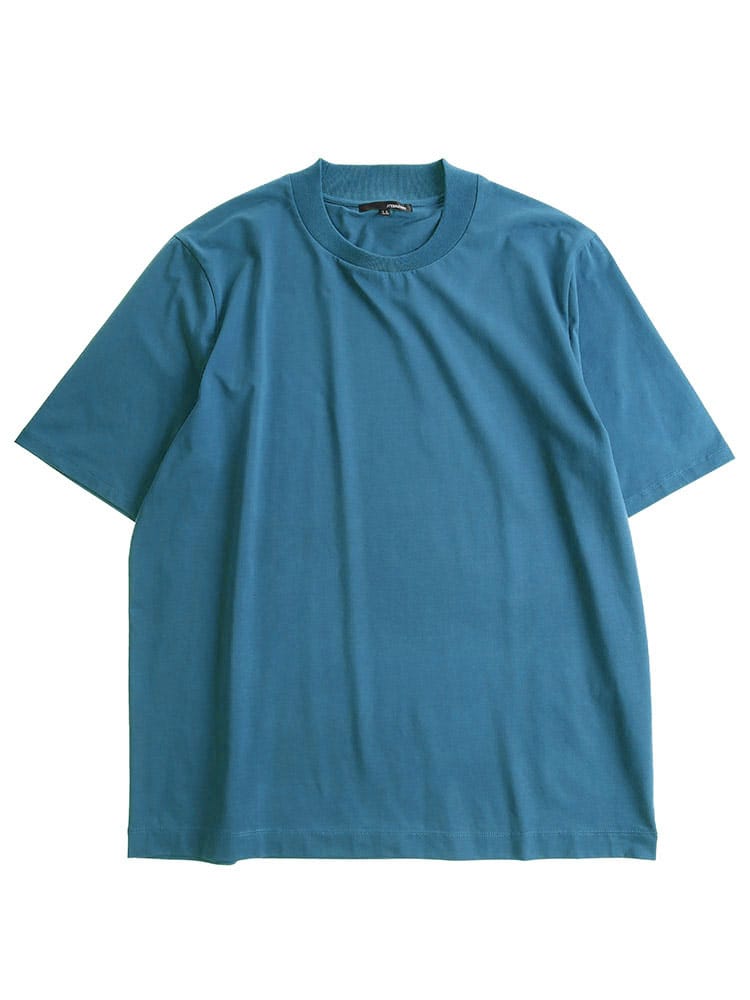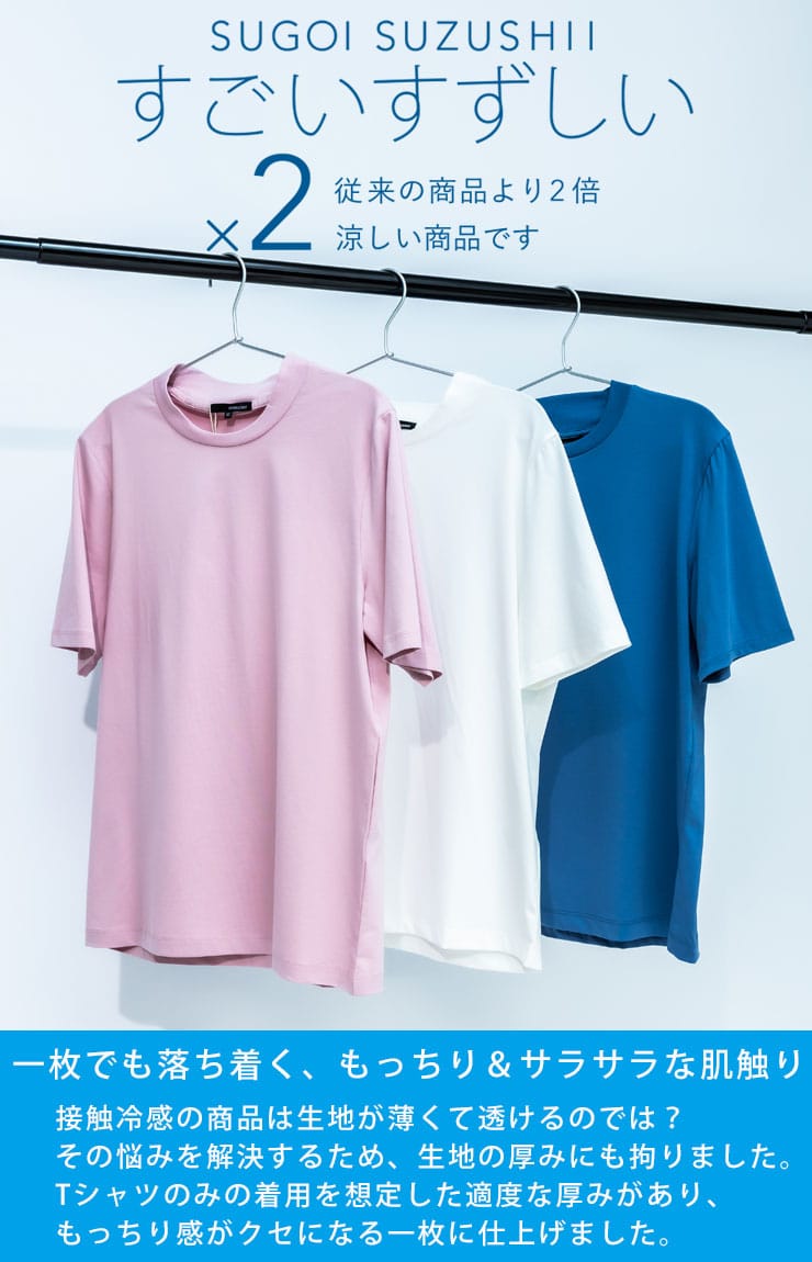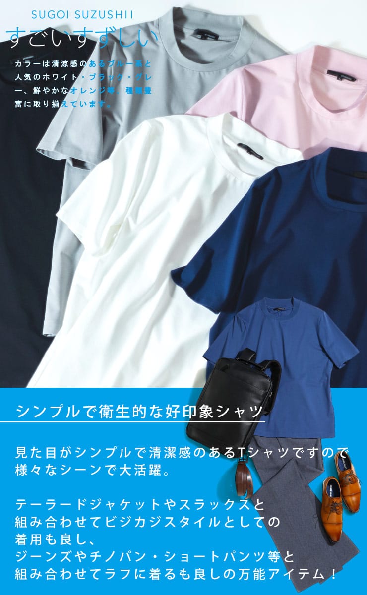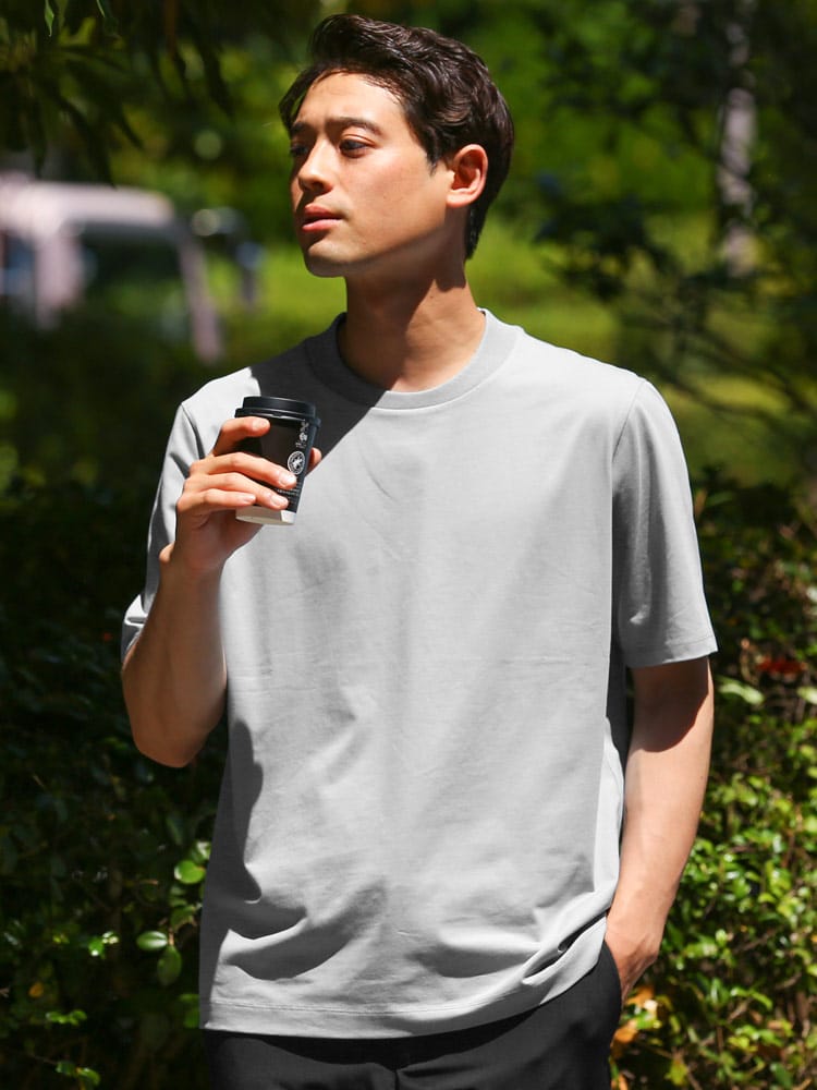 サラッとした生地感で触れた瞬間に涼しさを感じる無地のクルーネック 半袖 Tシャツです。少し光沢感のある生地を採用し、清涼感と上品さを兼ね備えた仕上がり。襟裏を高く設計することで、ジャケットの襟裏の汚れ防止になるつくりになっています。従来の商品に比べて2倍涼しさを感じられる仕上がりなので、清涼感を保ち、暑さからのストレスを軽減してくれます。無地のシンプルなデザインでオフィスカジュアルやテレワーク時のカジュアルスタイルにおすすめのアイテム。ジャケTシャツ/ジャケット専用Tシャツ/ジャケット専用カットソー