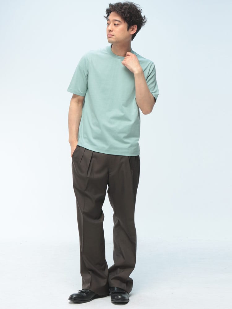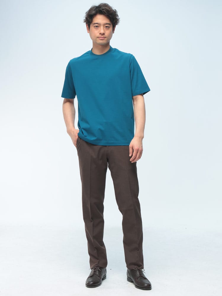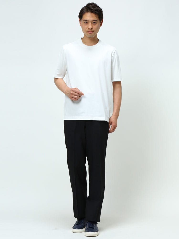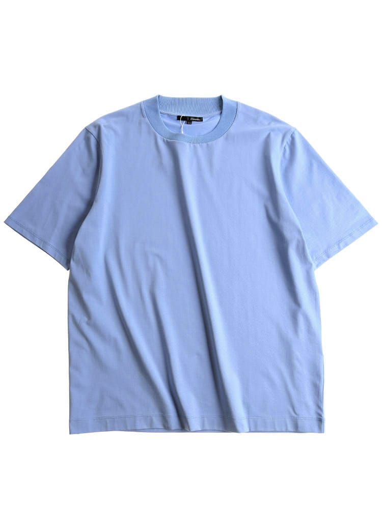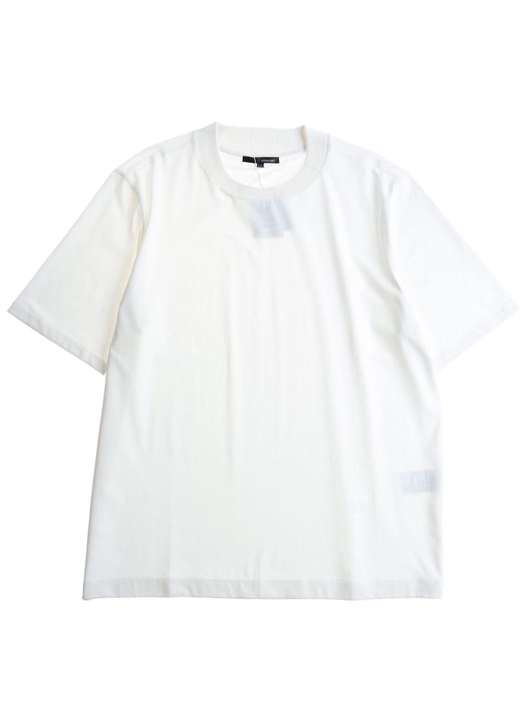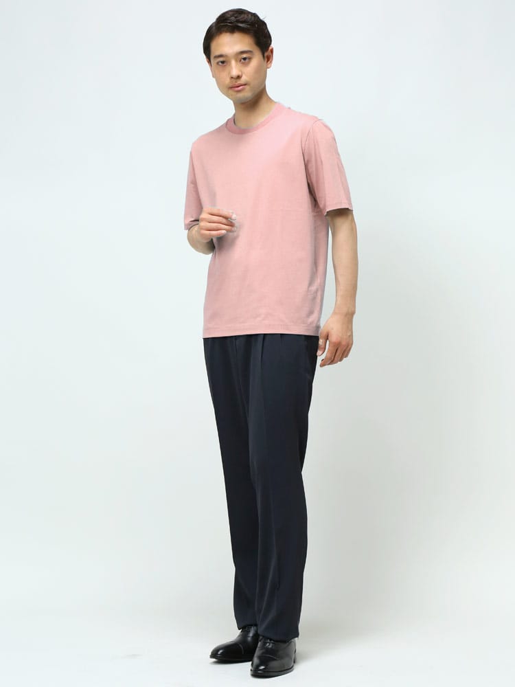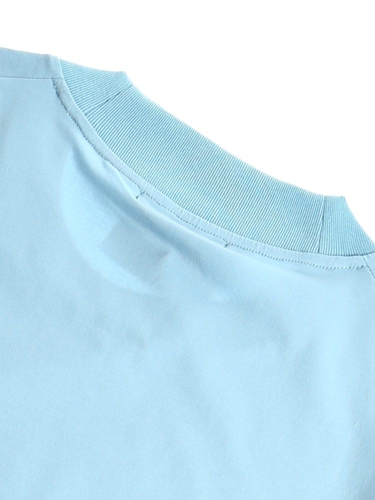 サラッとした生地感で触れた瞬間に涼しさを感じる無地のクルーネック 半袖 Tシャツです。少し光沢感のある生地を採用し、清涼感と上品さを兼ね備えた仕上がり。襟裏を高く設計することで、ジャケットの襟裏の汚れ防止になるつくりになっています。従来の商品に比べて2倍涼しさを感じられる仕上がりなので、清涼感を保ち、暑さからのストレスを軽減してくれます。無地のシンプルなデザインでオフィスカジュアルやテレワーク時のカジュアルスタイルにおすすめのアイテム。ジャケTシャツ/ジャケット専用Tシャツ/ジャケット専用カットソー