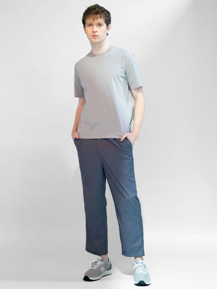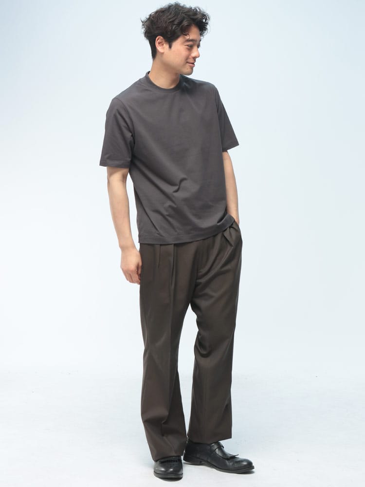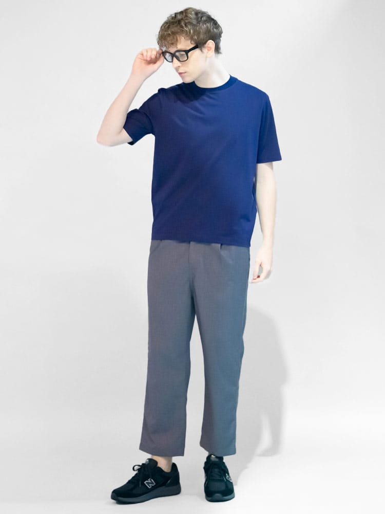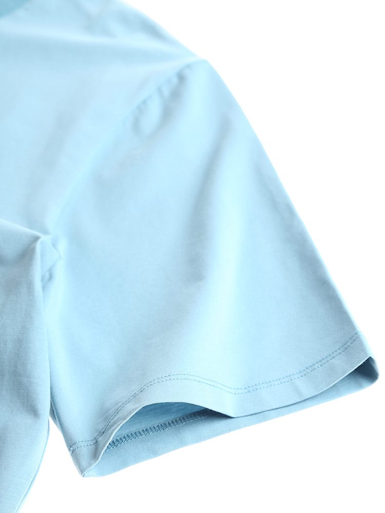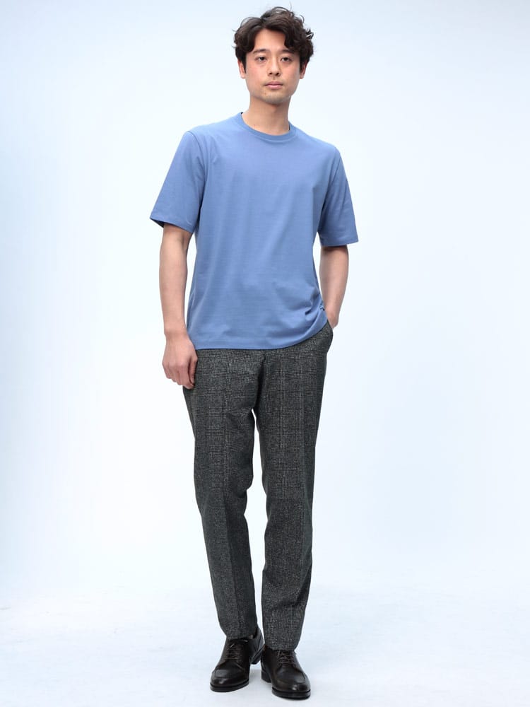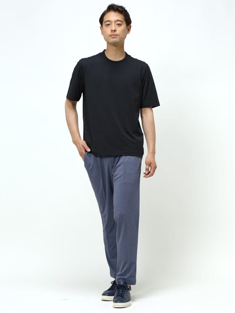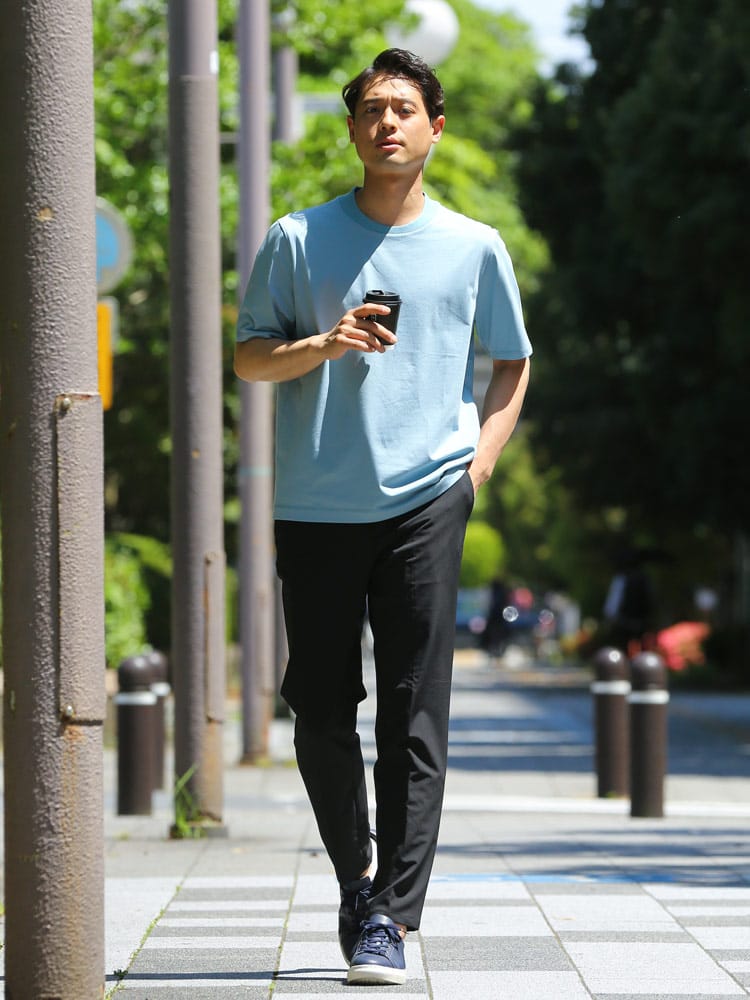サラッとした生地感で触れた瞬間に涼しさを感じる無地のクルーネック 半袖 Tシャツです。少し光沢感のある生地を採用し、清涼感と上品さを兼ね備えた仕上がり。襟裏を高く設計することで、ジャケットの襟裏の汚れ防止になるつくりになっています。従来の商品に比べて2倍涼しさを感じられる仕上がりなので、清涼感を保ち、暑さからのストレスを軽減してくれます。無地のシンプルなデザインでオフィスカジュアルやテレワーク時のカジュアルスタイルにおすすめのアイテム。ジャケTシャツ/ジャケット専用Tシャツ/ジャケット専用カットソー