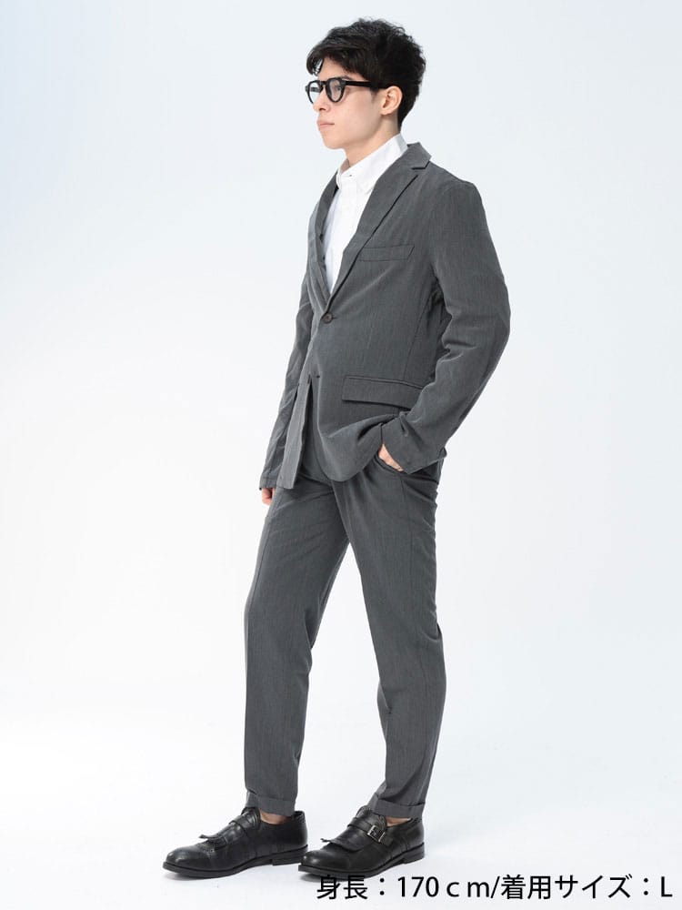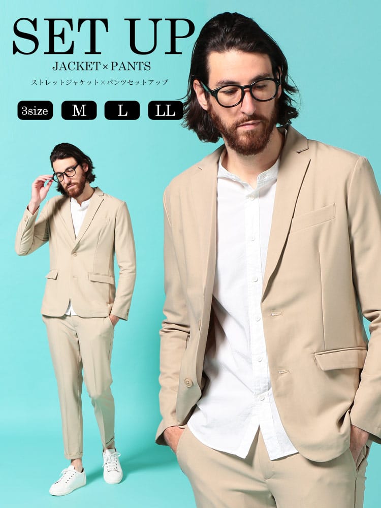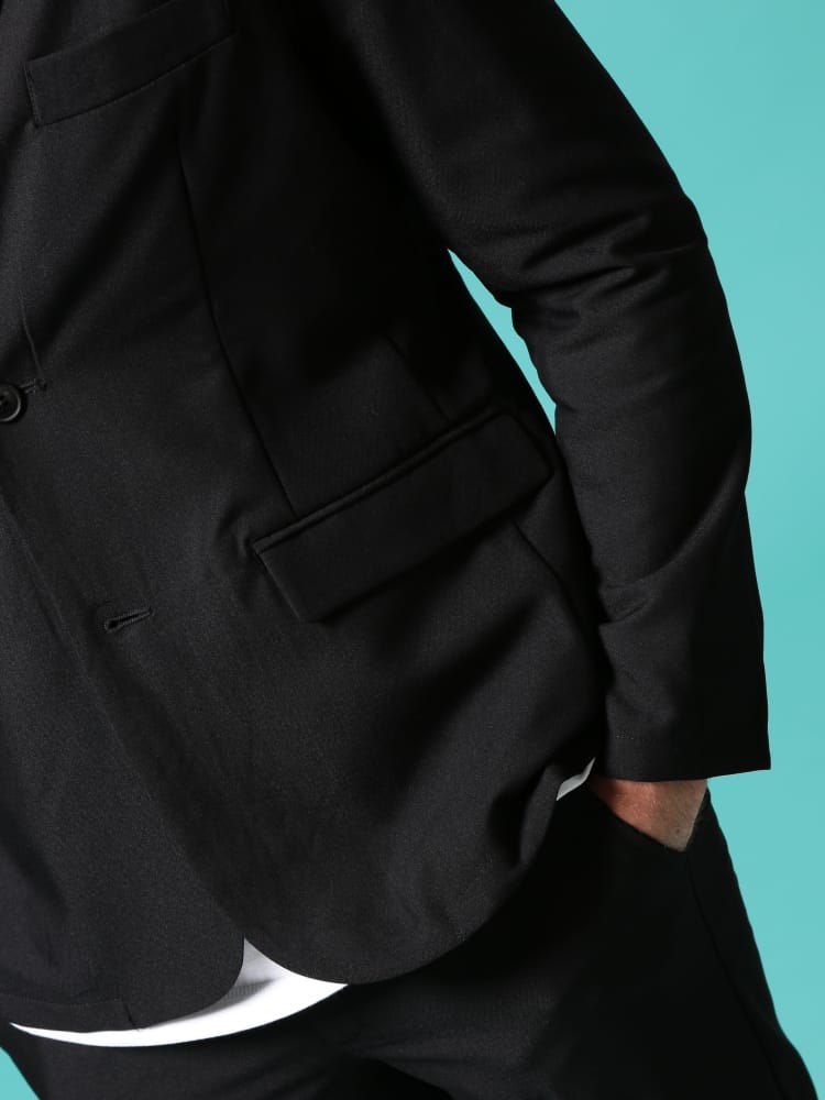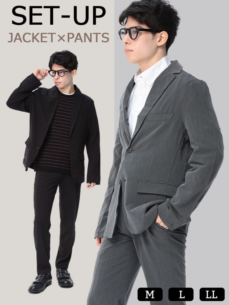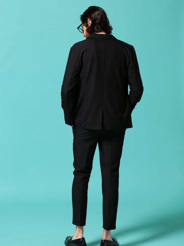 無地のシンプルなデザインのテーラードジャケットとノータックパンツのセットアップ。無駄を削ぎ落した品のあるデザインにストレッチ性のある生地を使用したデザイン性と機能性を両立した一着。一着あればお洒落に決まるおすすめのアイテムです。※こちらの商品はデザインの都合上、裾上げ不可となります。