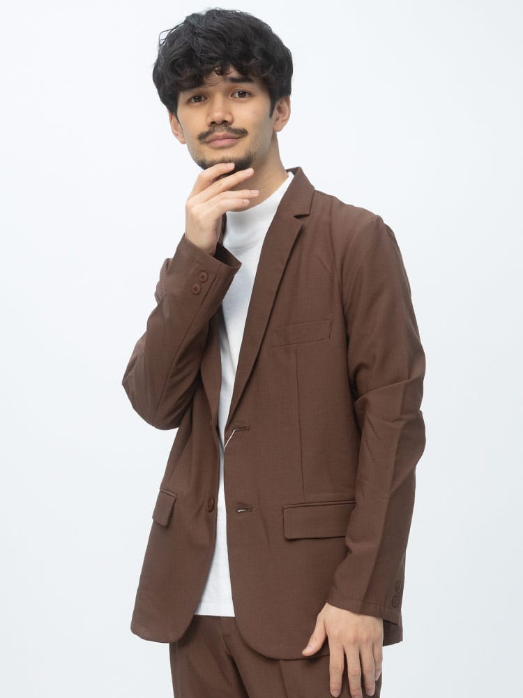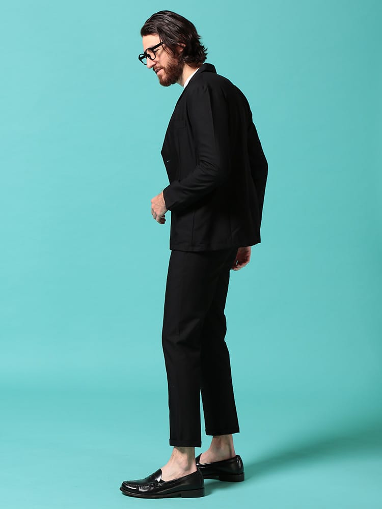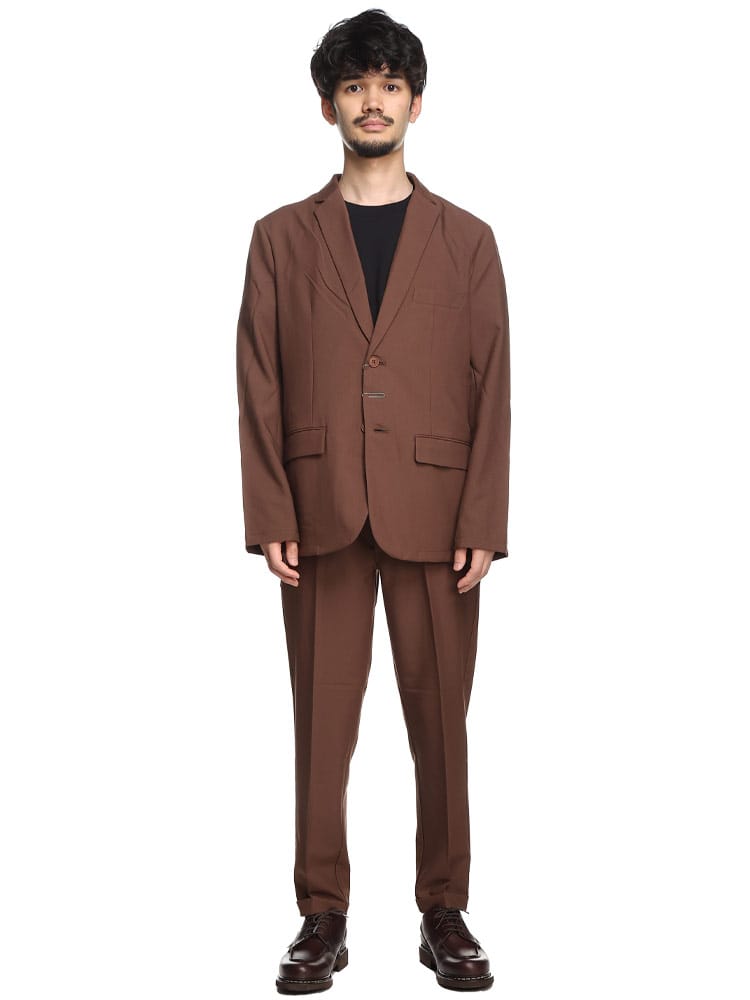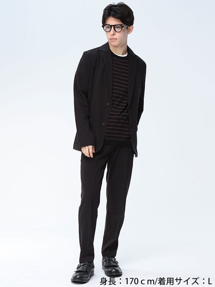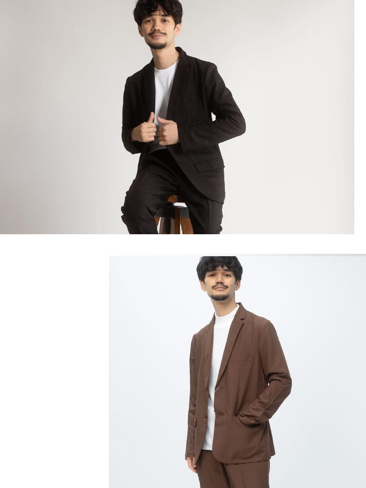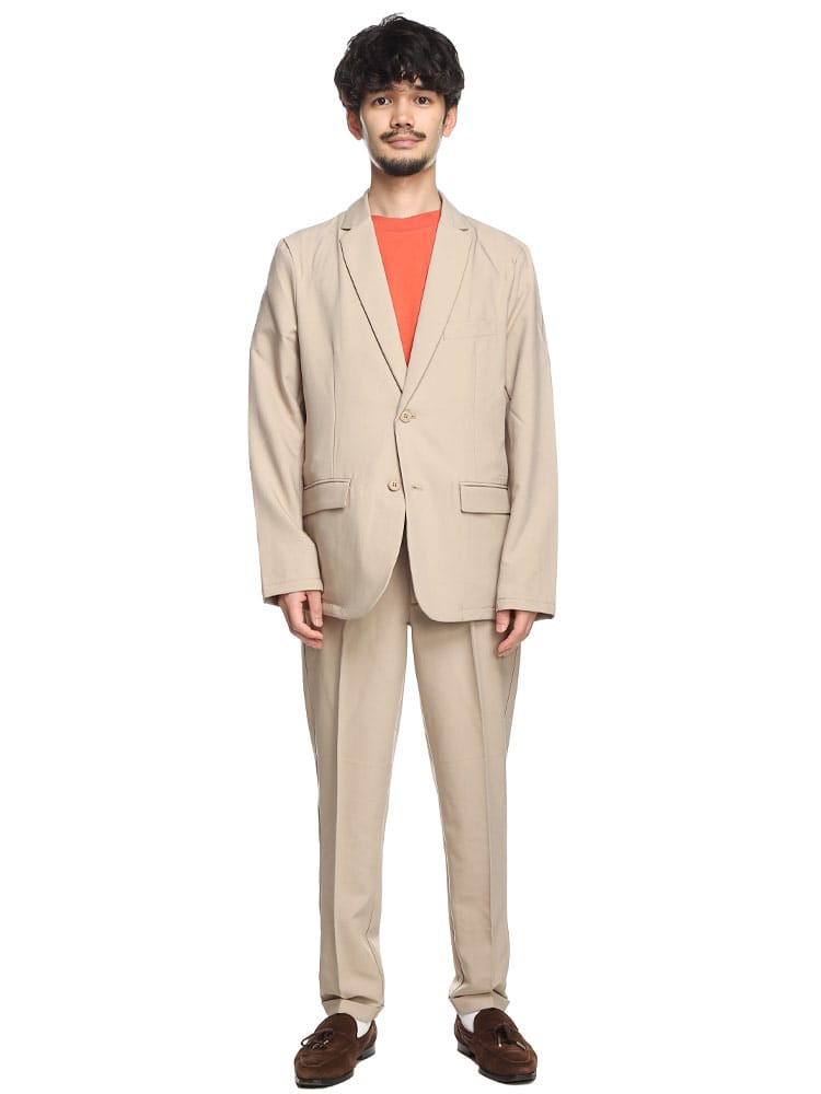 無地のシンプルなデザインのテーラードジャケットとノータックパンツのセットアップ。無駄を削ぎ落した品のあるデザインにストレッチ性のある生地を使用したデザイン性と機能性を両立した一着。一着あればお洒落に決まるおすすめのアイテムです。※こちらの商品はデザインの都合上、裾上げ不可となります。