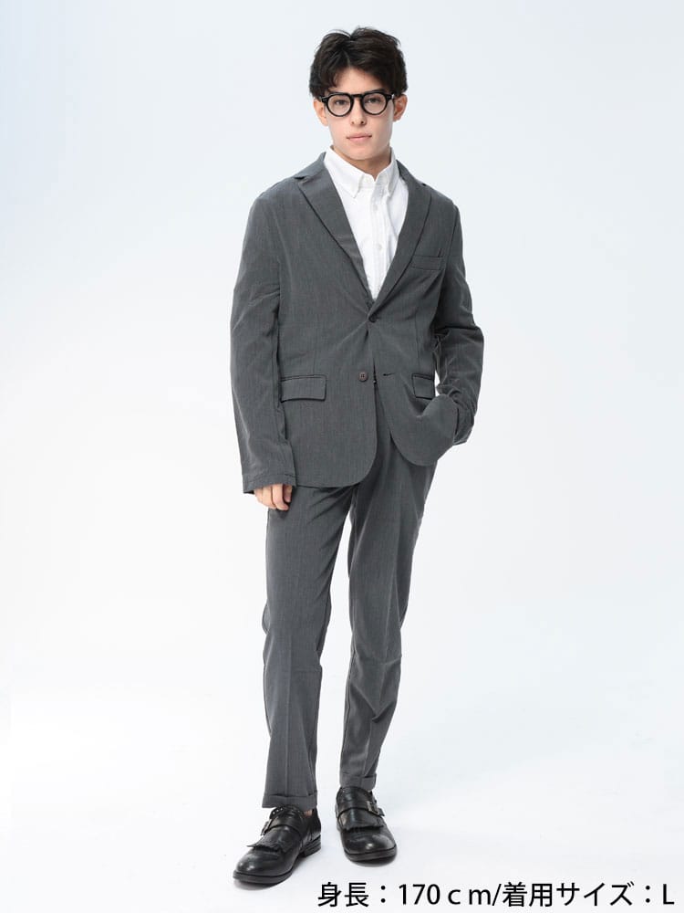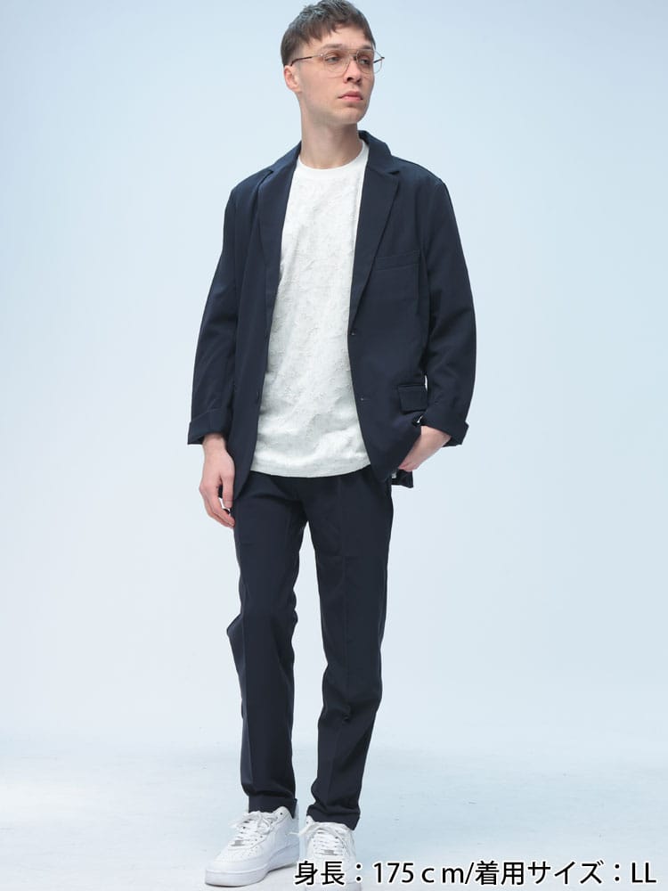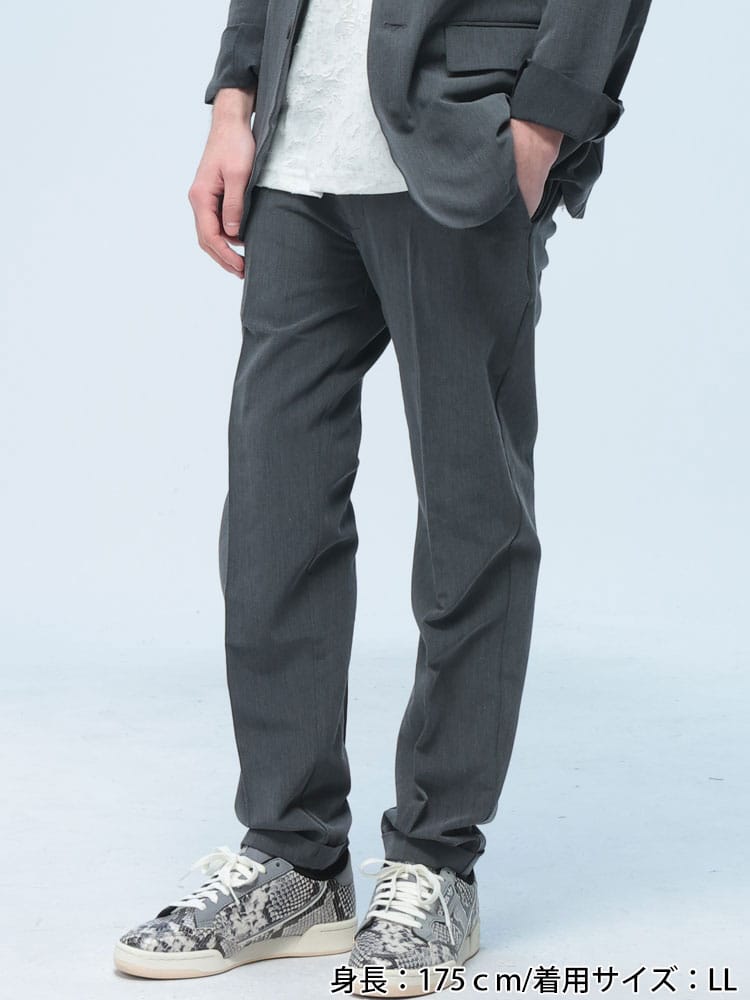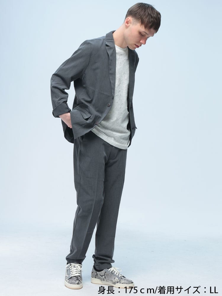 無地のシンプルなデザインのテーラードジャケットとノータックパンツのセットアップ。無駄を削ぎ落した品のあるデザインにストレッチ性のある生地を使用したデザイン性と機能性を両立した一着。一着あればお洒落に決まるおすすめのアイテムです。※こちらの商品はパンツの裾デザインがダブル仕上げの都合上、裾上げ不可となります。