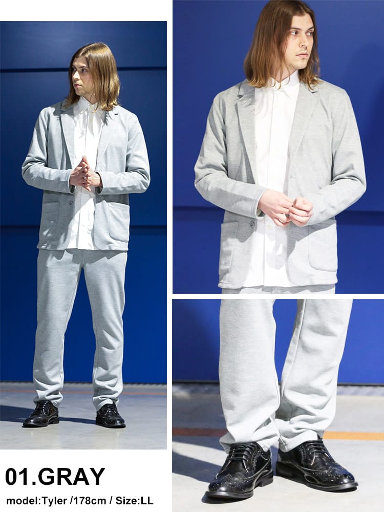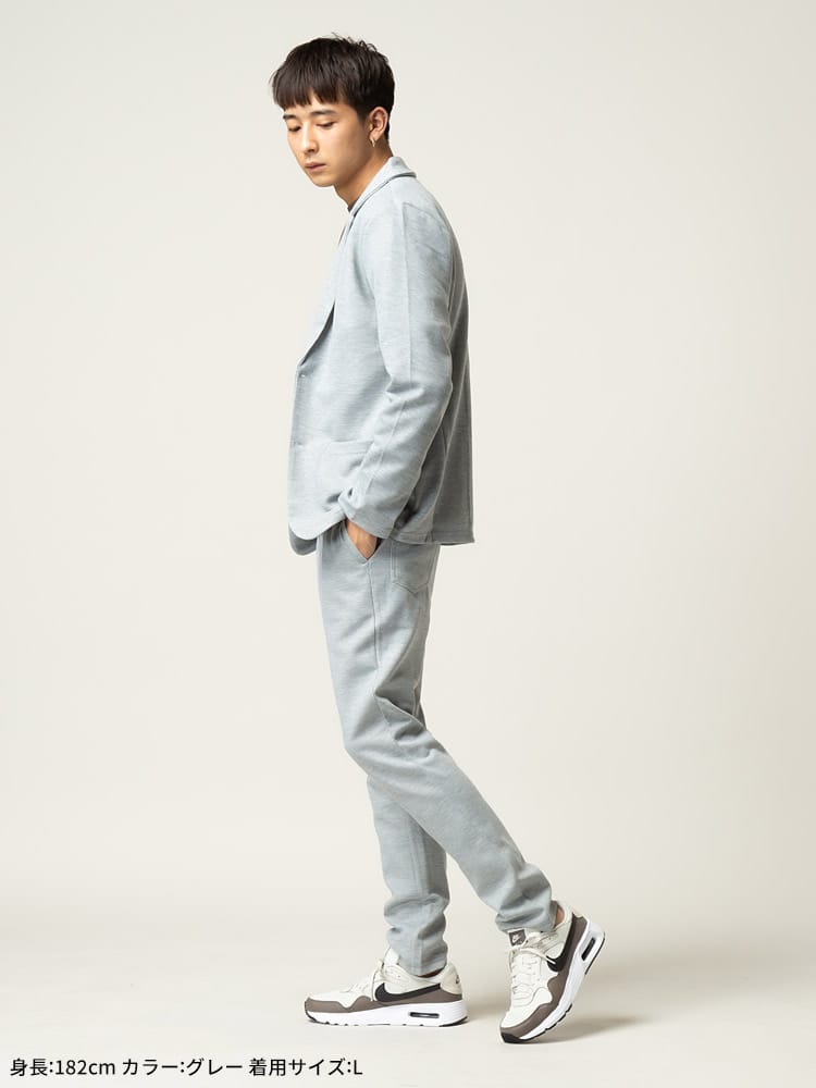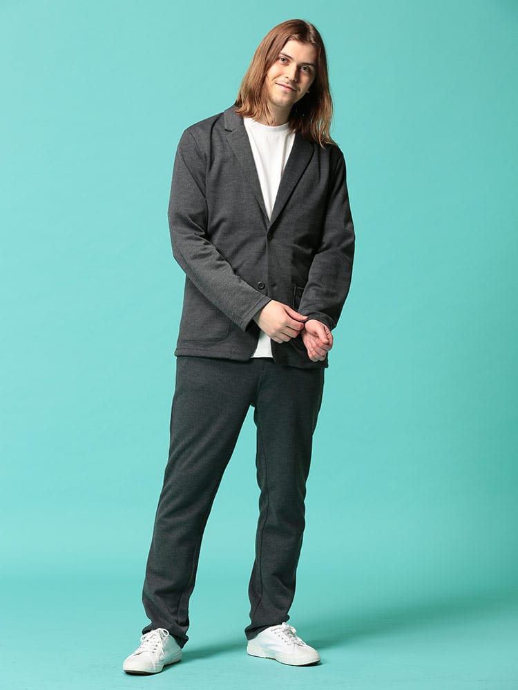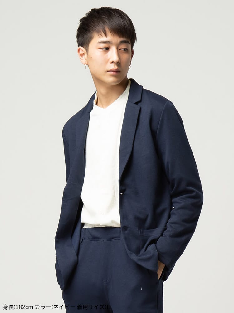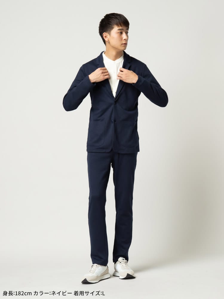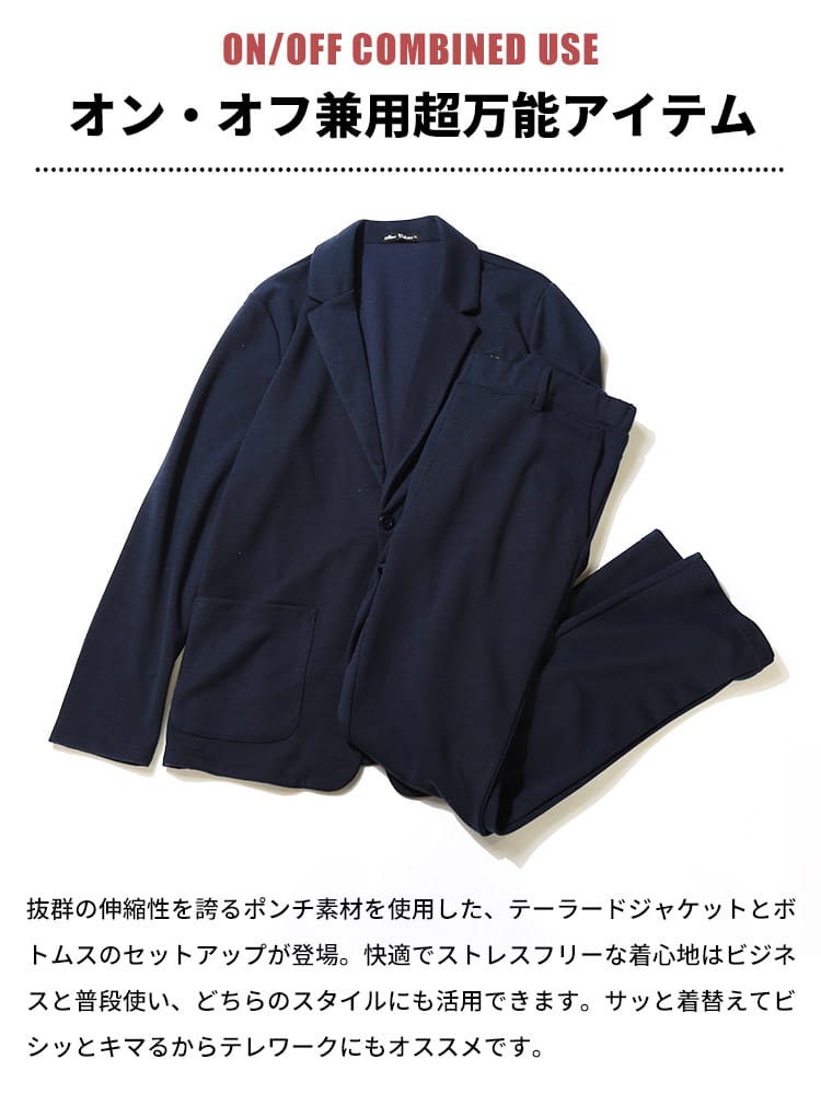肌触りの良いポンチ素材で仕上げたテーラードジャケットとパンツのセットアップです。無地のシンプルなデザインでどんなシーンにもマッチします。ジャケットはシングル2つボタン。パンツのウエストはゴムとドローコード付きでサイズ調整が出来ます。キチンと感があるアイテムでオンオフで着ていただける一着です。