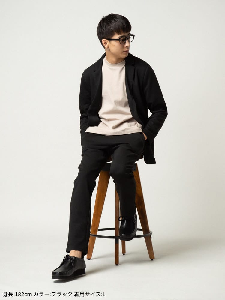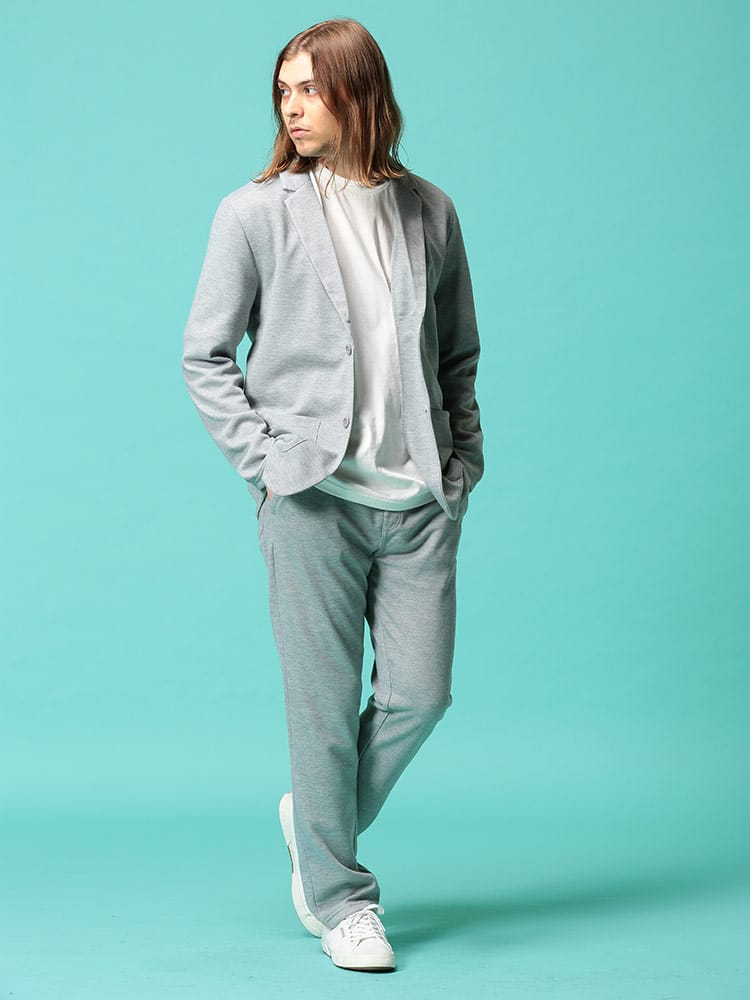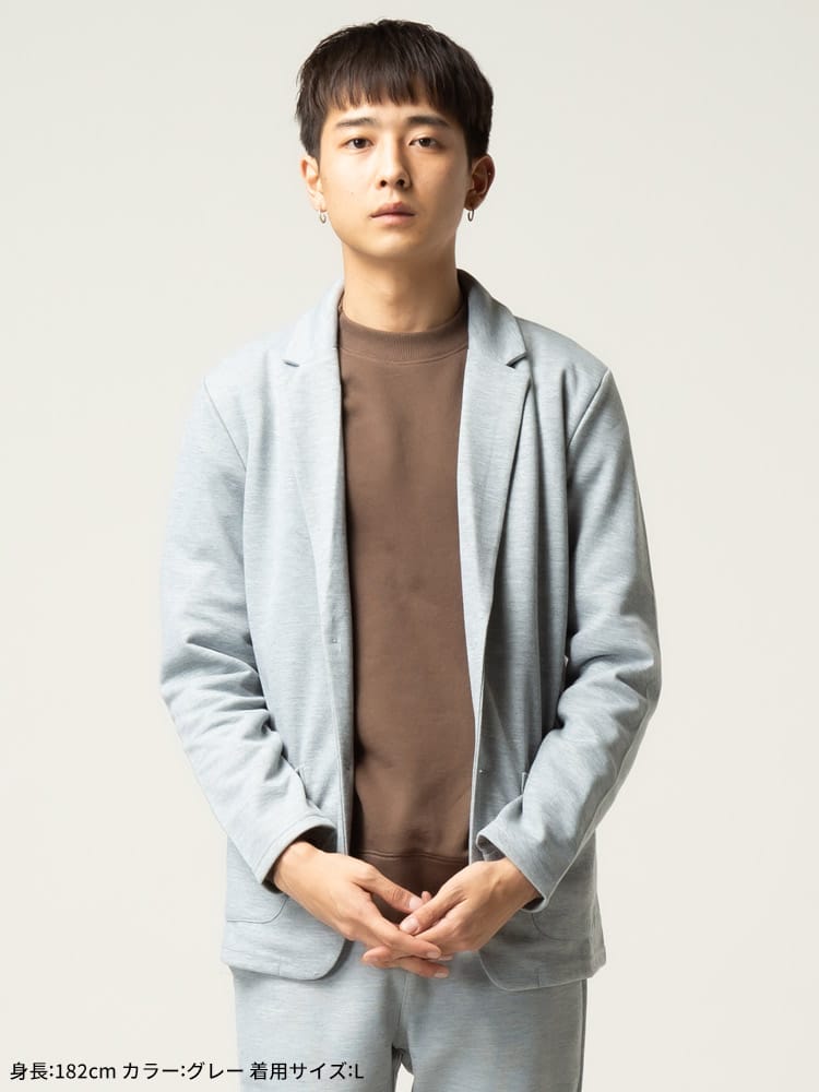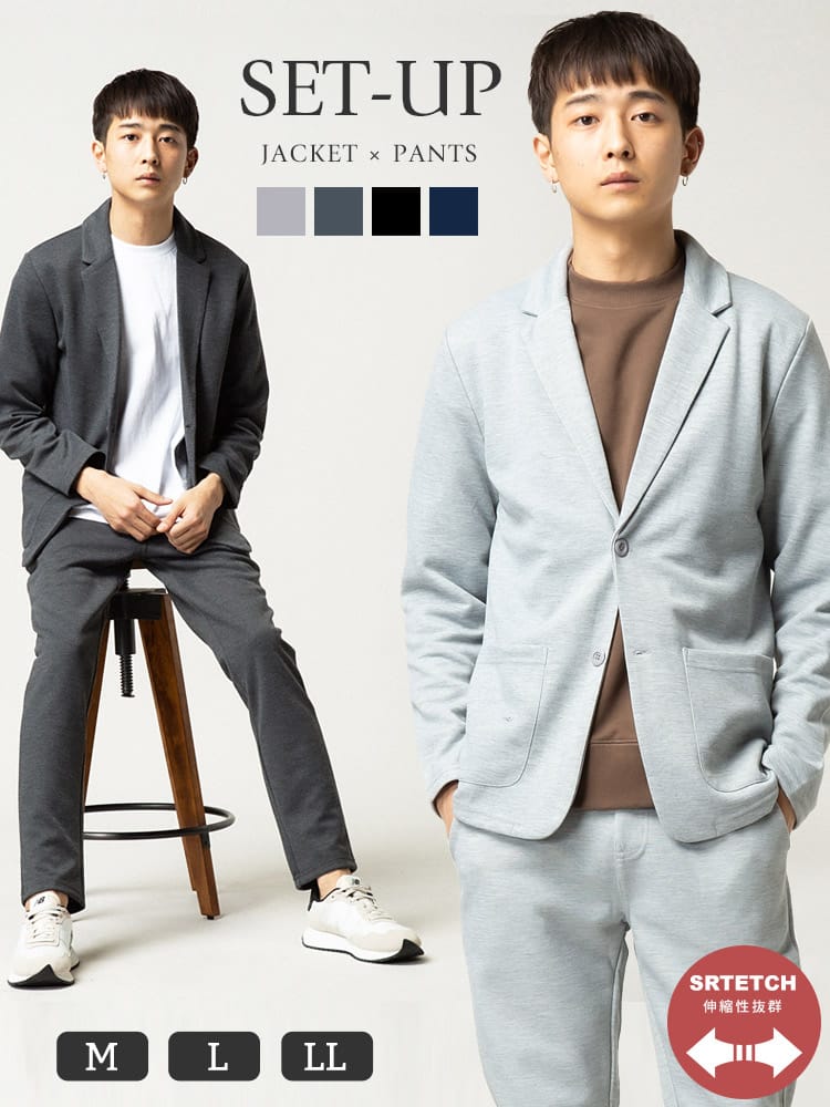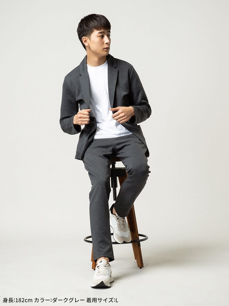 肌触りの良いポンチ素材で仕上げたテーラードジャケットとパンツのセットアップです。無地のシンプルなデザインでどんなシーンにもマッチします。ジャケットはシングル2つボタン。パンツのウエストはゴムとドローコード付きでサイズ調整が出来ます。キチンと感があるアイテムでオンオフで着ていただける一着です。