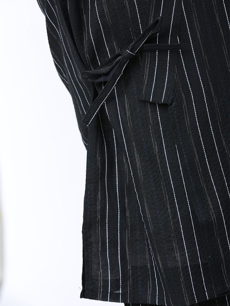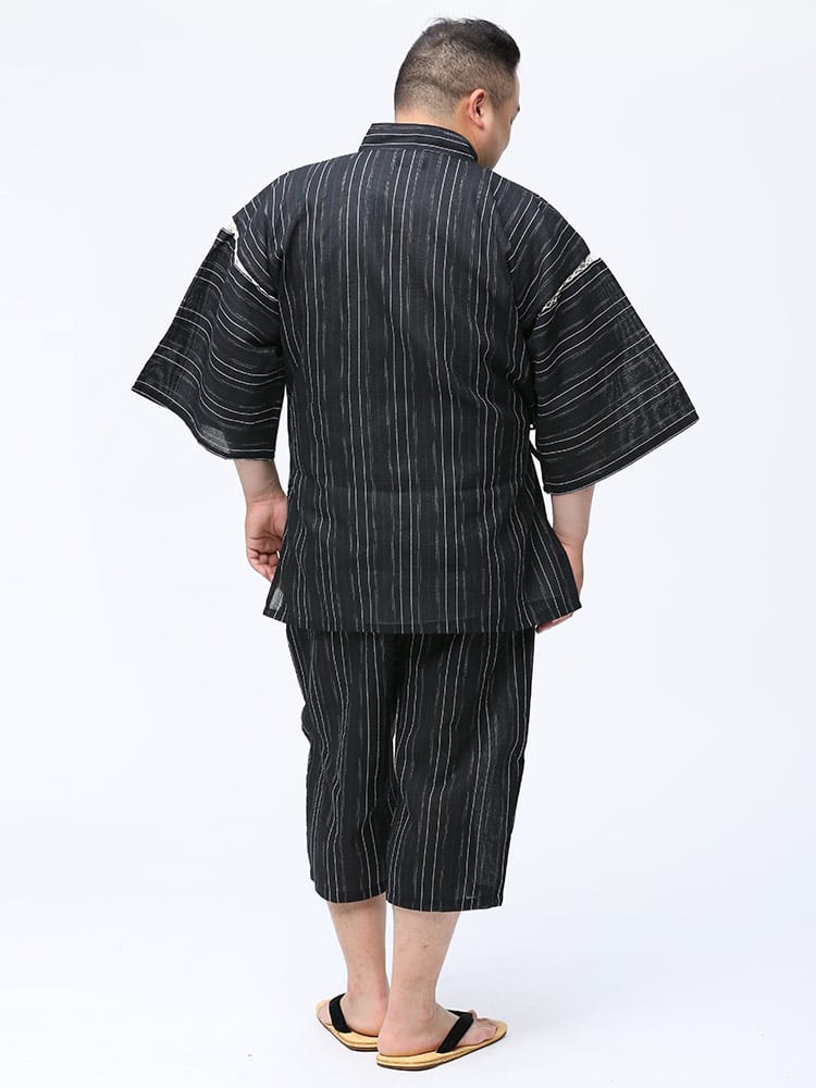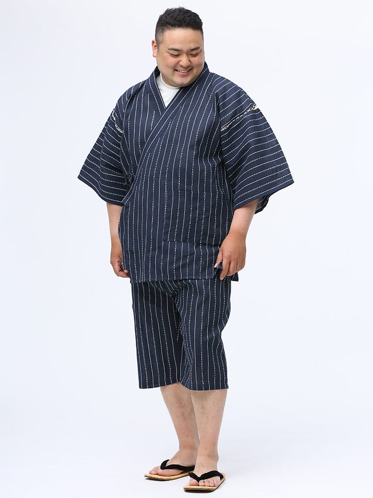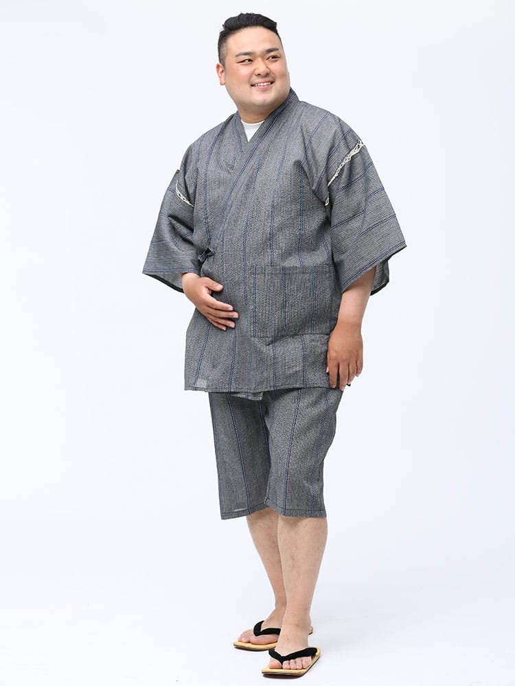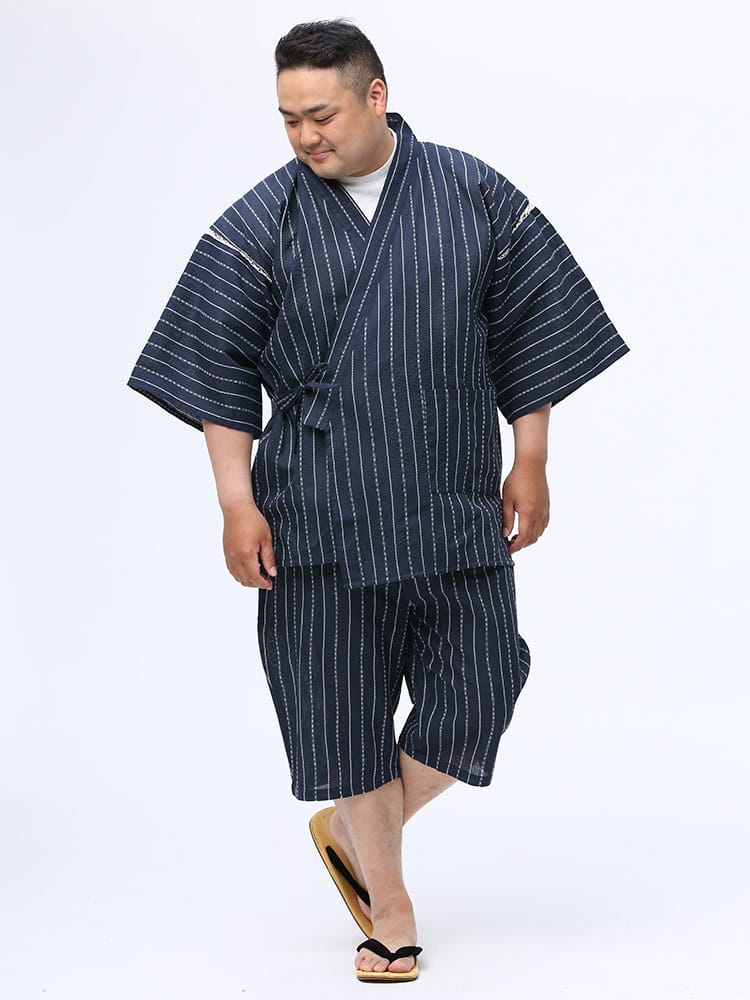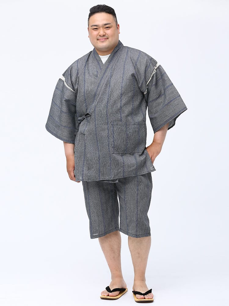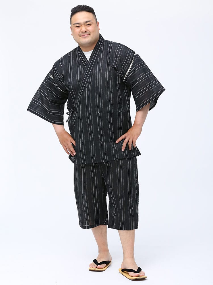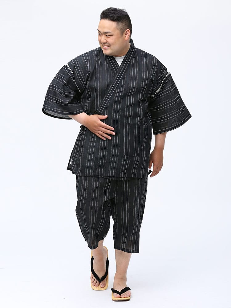 しじら織で仕上げた本格的な縞柄 甚平 上下セット。夏のイベントやリラックスタイムにおすすめしたいアイテム。薄手の生地で清涼感抜群。パンツのウエストはゴムとドローコード付きでサイズ調整出来ます。パンツはボタンフライタイプ。
