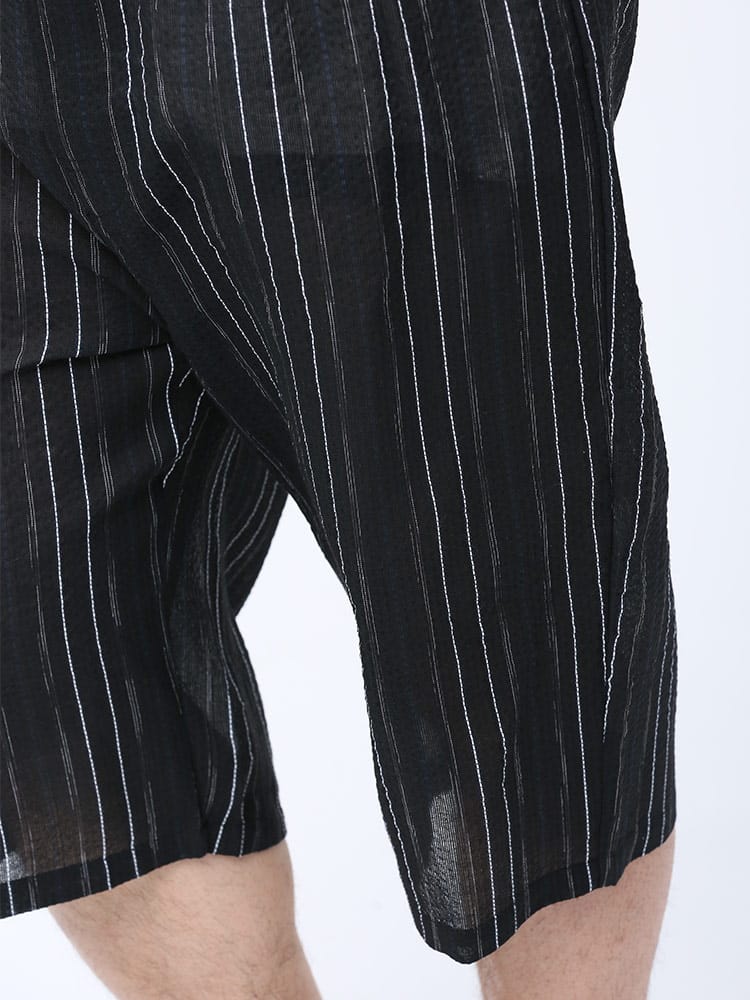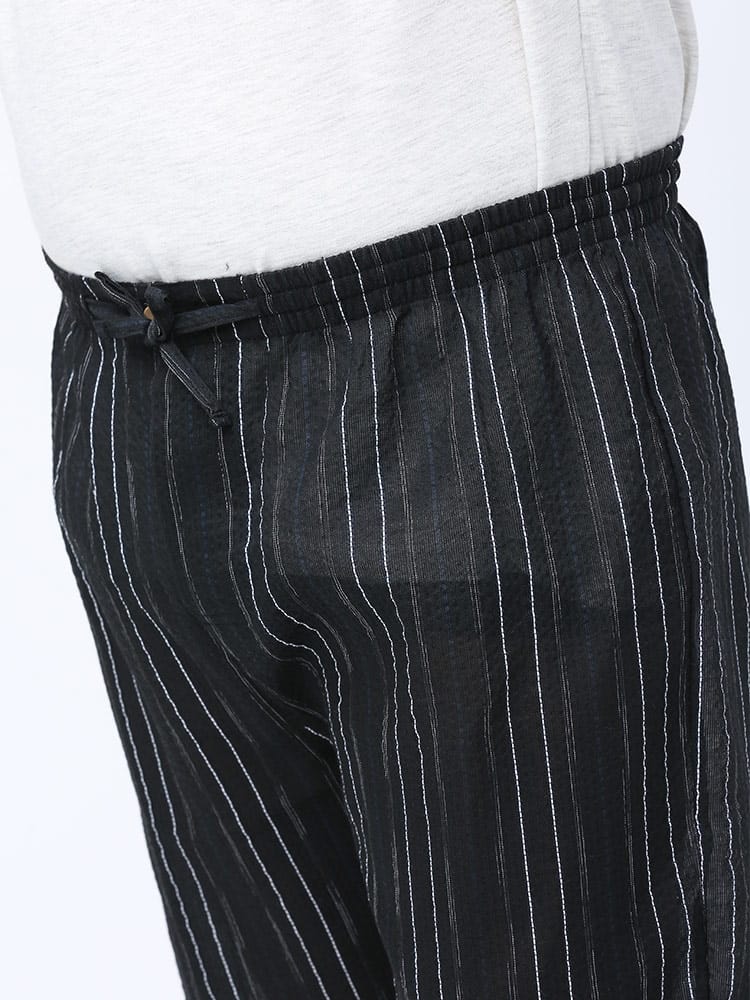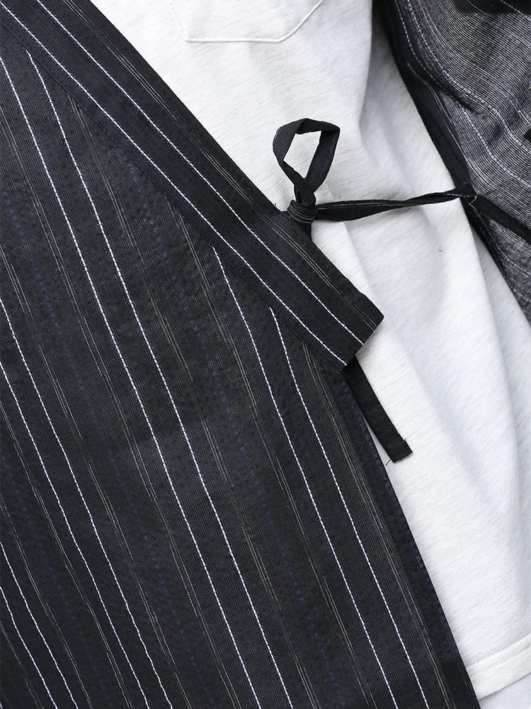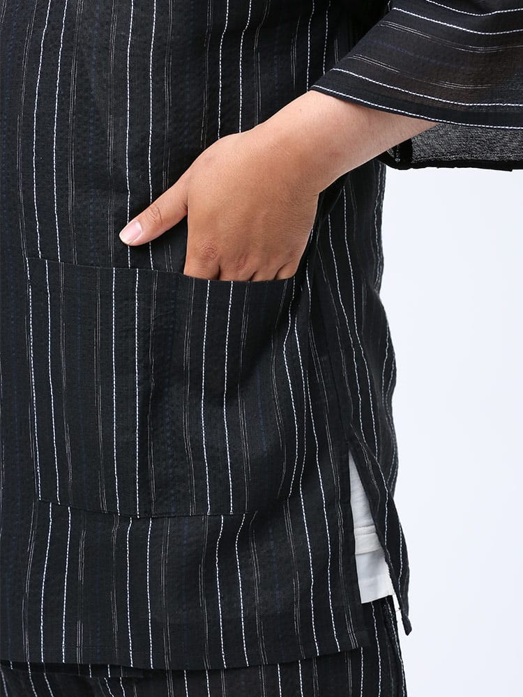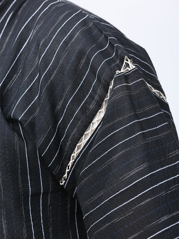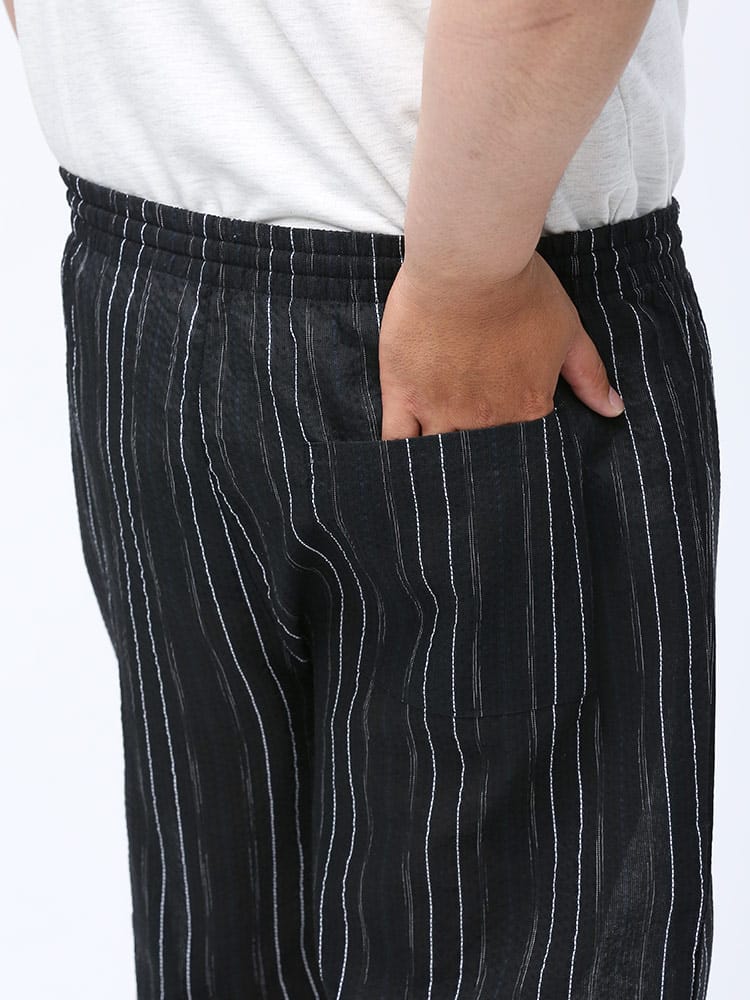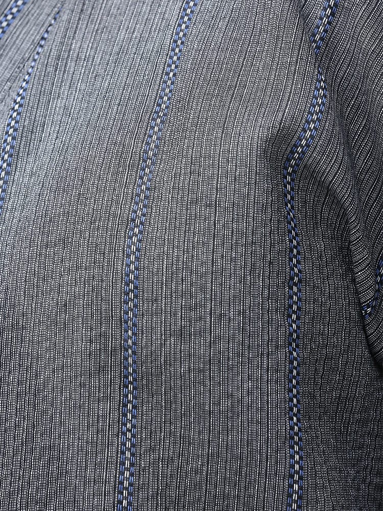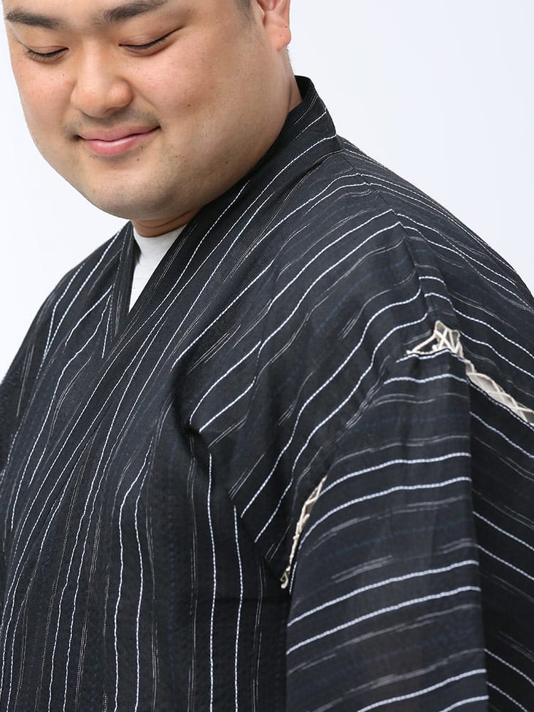 しじら織で仕上げた本格的な縞柄 甚平 上下セット。夏のイベントやリラックスタイムにおすすめしたいアイテム。薄手の生地で清涼感抜群。パンツのウエストはゴムとドローコード付きでサイズ調整出来ます。パンツはボタンフライタイプ。