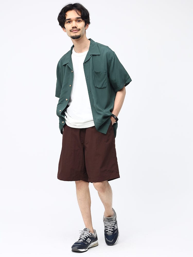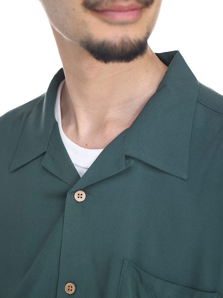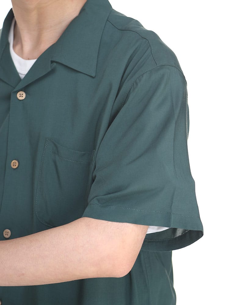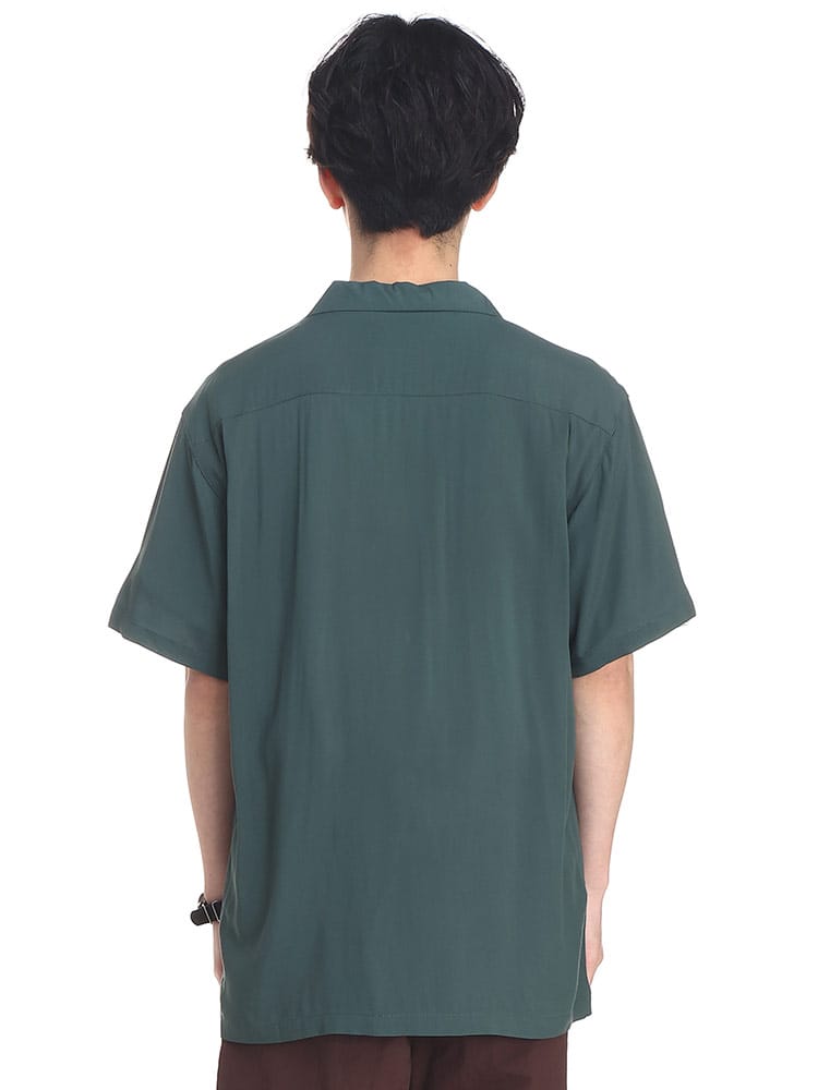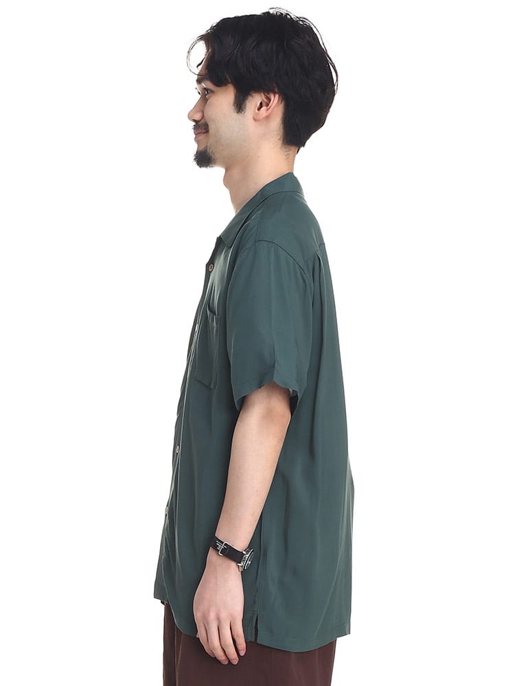 barcedos moderateのレーヨン 無地 オープンカラー 半袖 シャツです。シルクのように滑らかなレーヨンの手ざわりが心地よい半袖シャツです。オープンカラーなのでリラックスした着用感が楽しめる、暑い季節にはピッタリなカジュアルシャツとなっています。