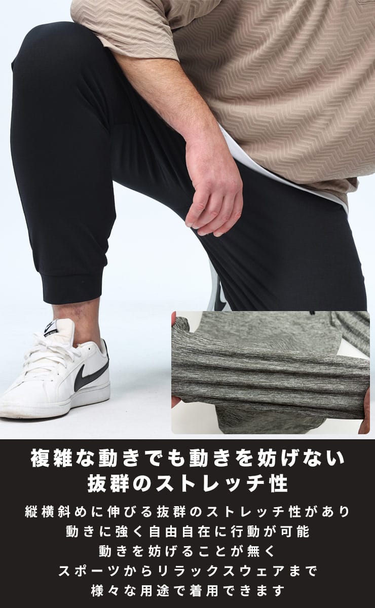 縦横斜めに伸びる抜群のストレッチ性があり、自由自在に動けるので普段使いだけでなく、スポーツやリラックスウェアとしても最適です。