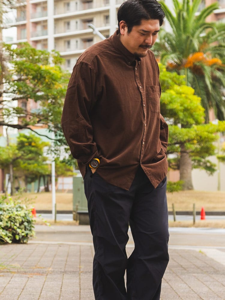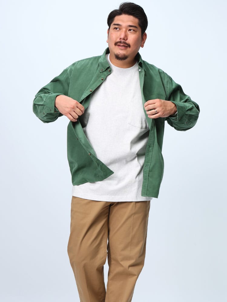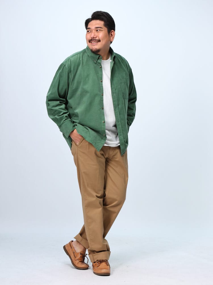 無地のコーデュロイは、どんなボトムスとも相性が良く、スタイリングの幅を広げてくれます。