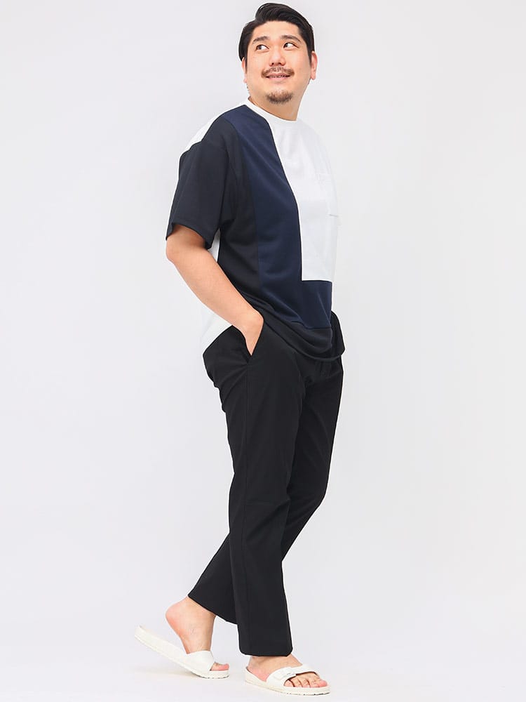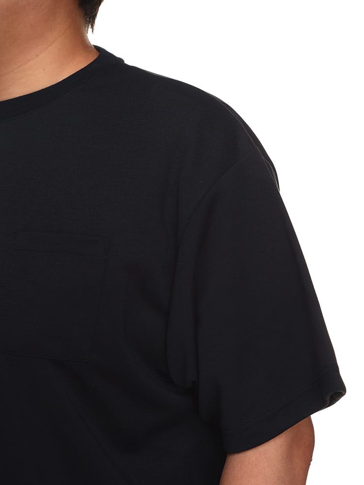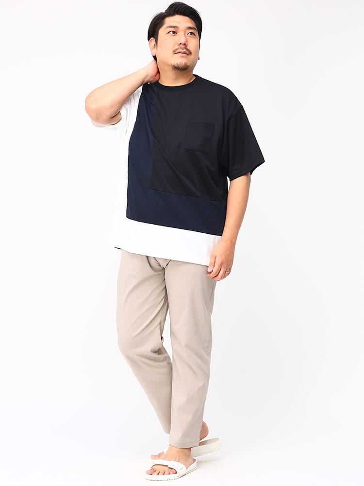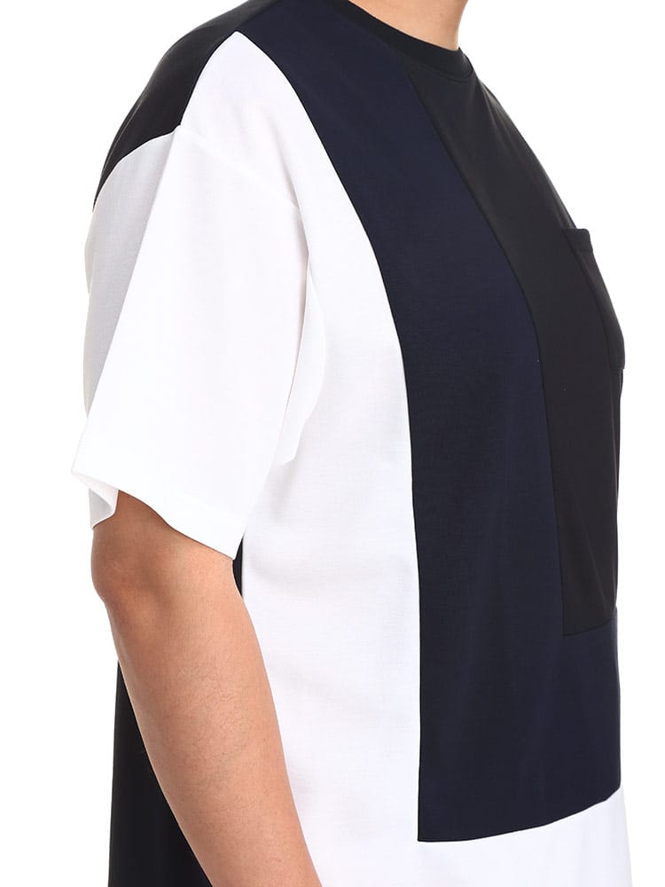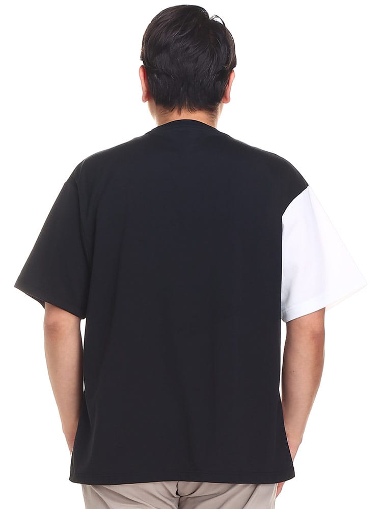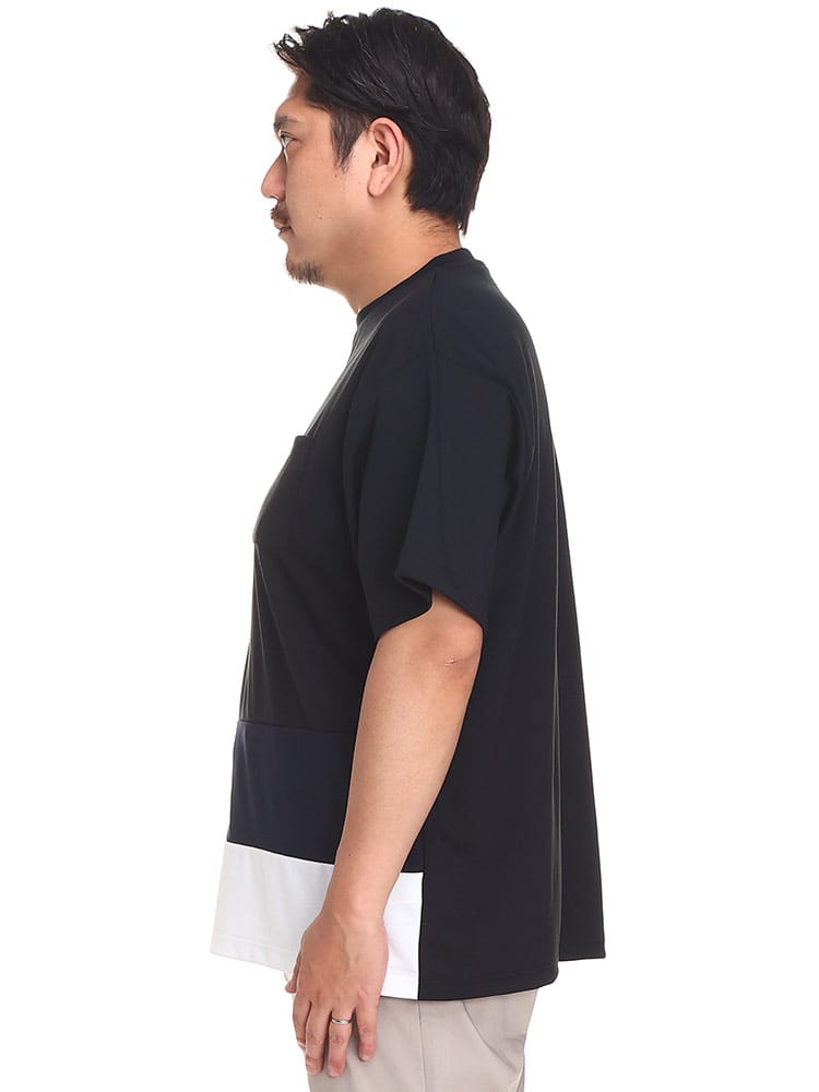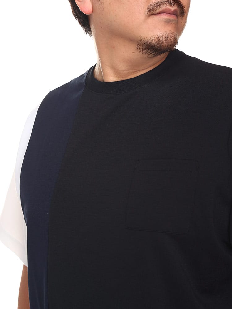 B&T CLUBのL字切り替え ポケット クルーネック 半袖 Tシャツです。非常にしっかりとした生地感と滑らかな質感が特徴的な半袖Tシャツ。L字切り替えによるアシンメトリーな配色が独特なシルエットとなっています。