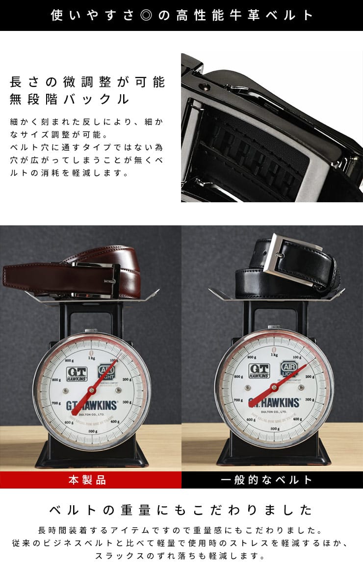 このビジネスベルトは、高品質の牛革を使用し、超軽量で設計されています。繊細な質感と耐久性を兼ね備え、長時間の使用にも快適さを提供します。独自のアジャスター機能により、サイズ調整が簡単にでき、ピッタリとしたフィット感を実現します。シンプルで洗練されたデザインは、ビジネスシーンはもちろん、カジュアルな装いにもマッチ。毎日の装いに上質なアクセントを加える、実用性とスタイルを兼ね備えたベルトです。