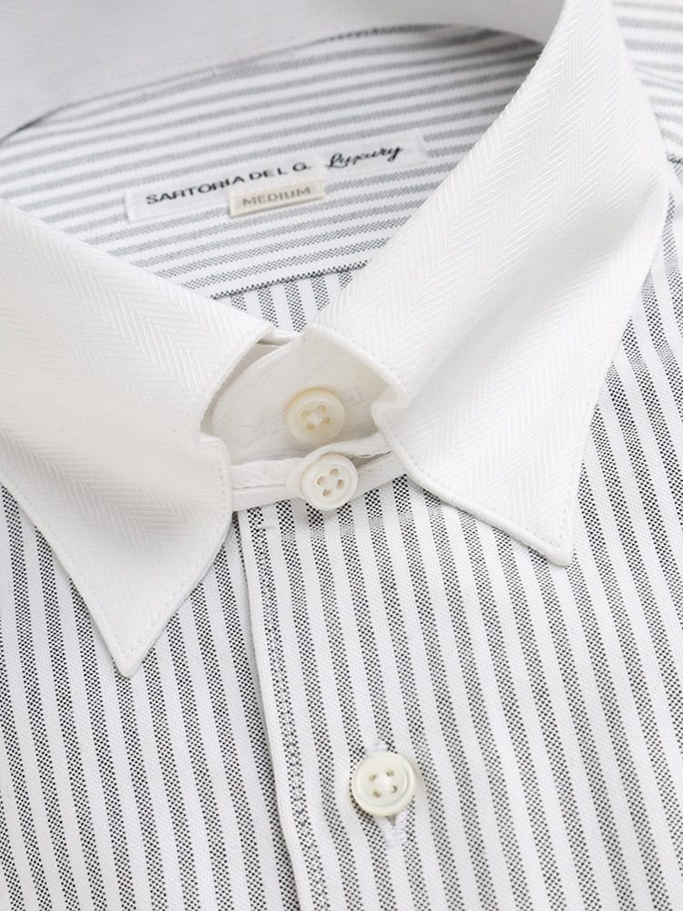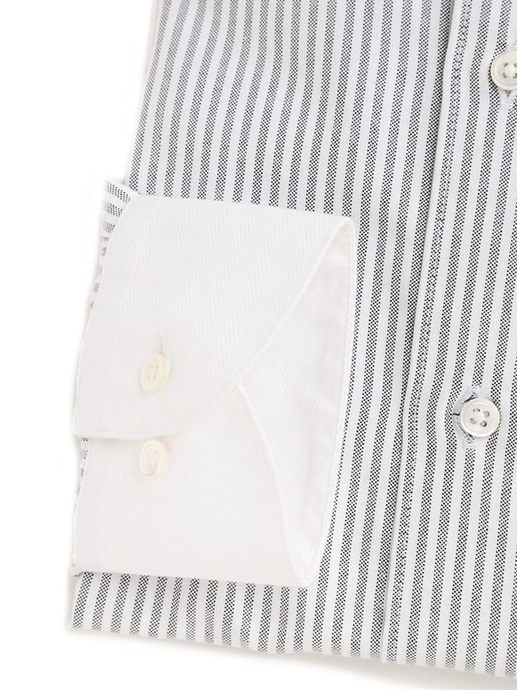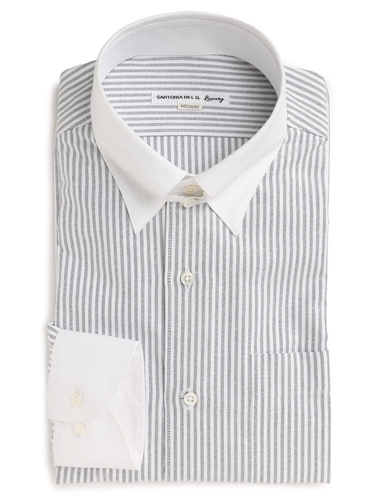 SARTORIA DEL GROSSOの日本製ラルフクレリック長袖ワイシャツは、クラシックなループタブカラーとコントラストの効いたクレリックデザインが特徴です。80番手以上の高級糸を使用し、柔らかで肌触りの良い素材感を提供。細部へのこだわりが光る本貝釦を採用し、上品なアクセントをプラス。独特な折り柄がオシャレで、ビジネスからカジュアルまで多様なシーンで活躍します。日本の職人による丁寧な仕立てで、長く愛用できる品質と洗練されたスタイルを両立した一着です。