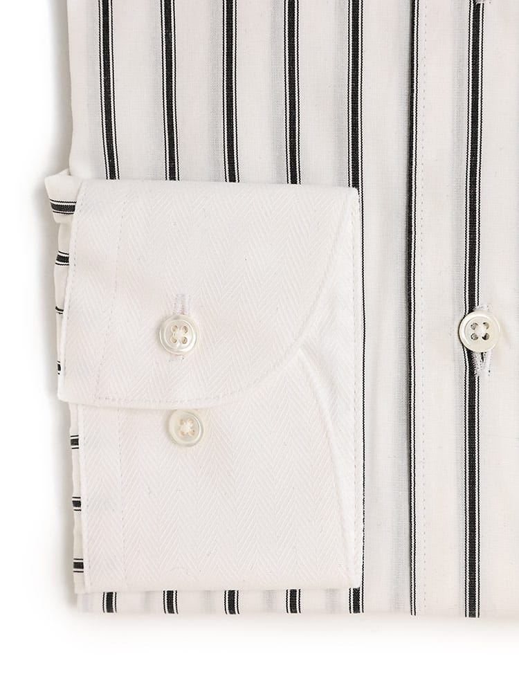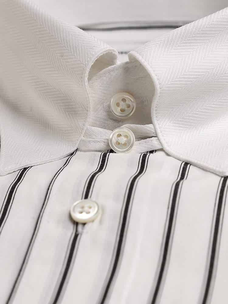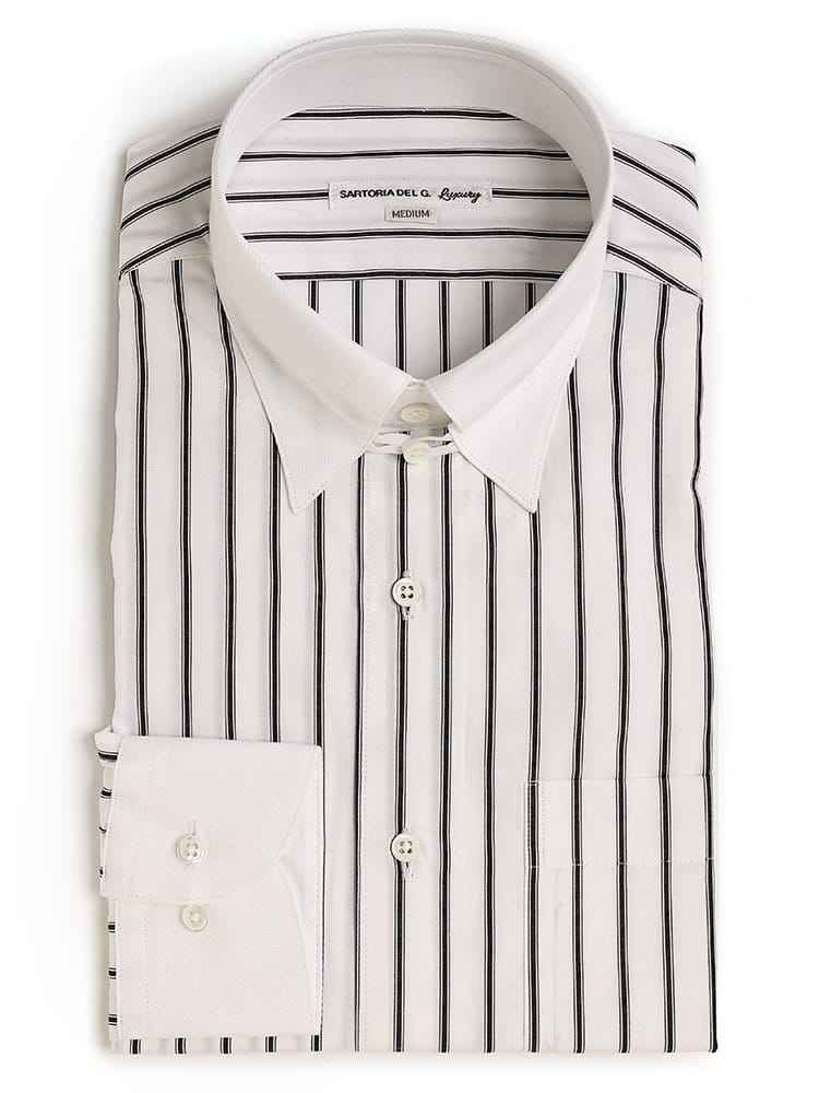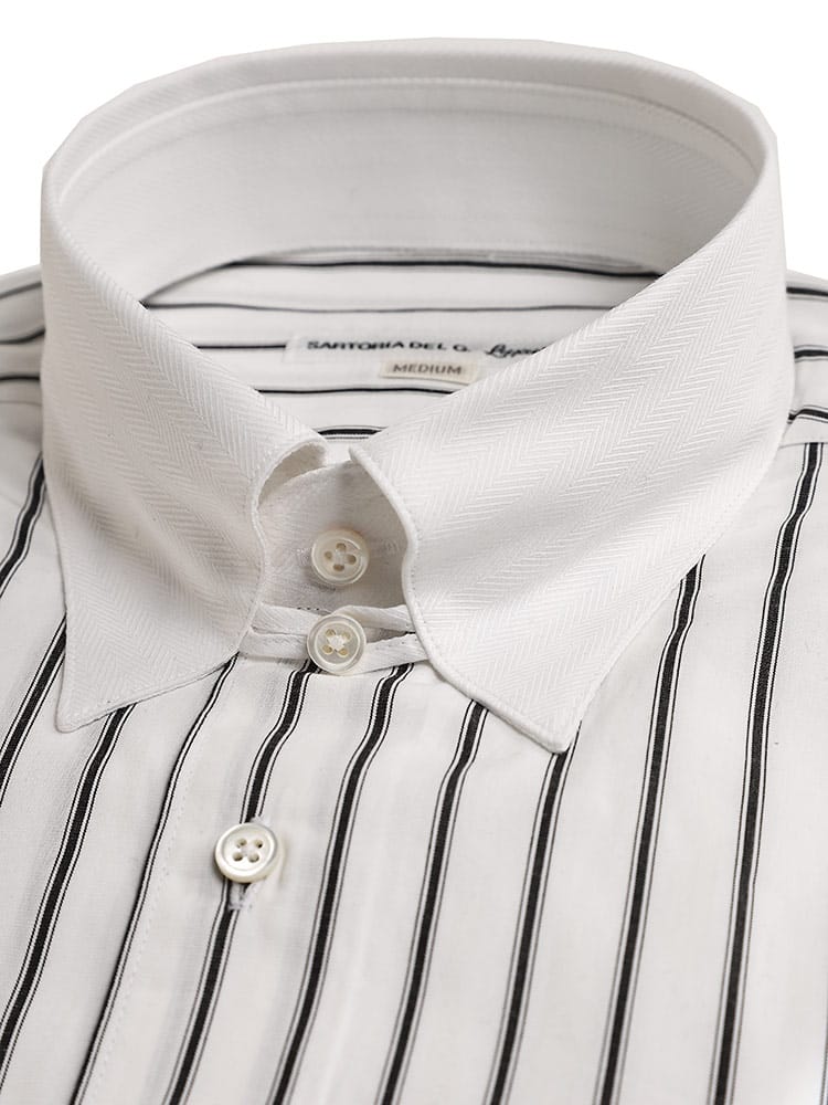 SARTORIA DEL GROSSOの日本製ラルフクレリック長袖ワイシャツは、クラシックなループタブカラーとコントラストの効いたクレリックデザインが特徴です。80番手以上の高級糸を使用し、柔らかで肌触りの良い素材感を提供。細部へのこだわりが光る本貝釦を採用し、上品なアクセントをプラス。メリハリのあるストライプ柄がオシャレで、ビジネスからカジュアルまで多様なシーンで活躍します。日本の職人による丁寧な仕立てで、長く愛用できる品質と洗練されたスタイルを両立した一着です。