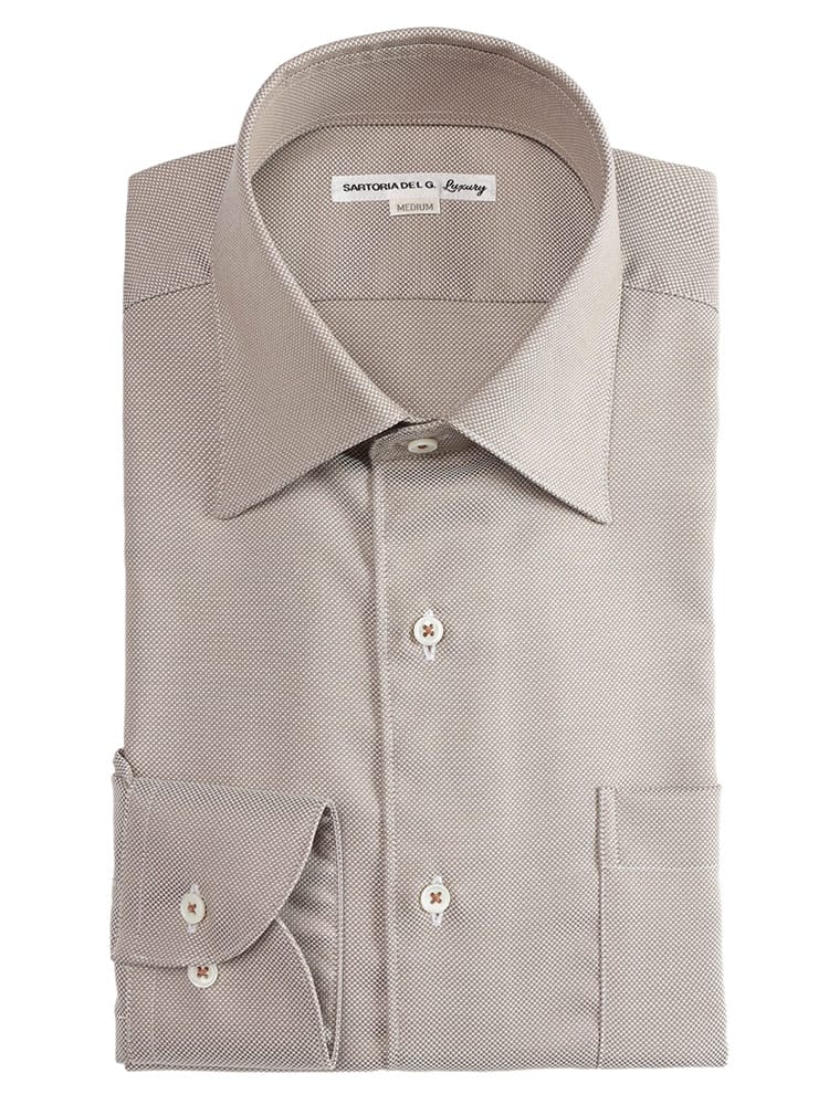 SARTORIA DEL GROSSO(サルトリアデルグロッソ)の綿100%テラコッタワイドカラー長袖ワイシャツです。上質なコットン素材の柔らかな着心地と、温かみのあるテラコッタカラーが魅力。顔周りをすっきりと見せるワイドカラーはエレガントな印象を与え、ビジネスカジュアルから華やかなシーンまで幅広く活躍します。イタリアンテイスト漂う洗練されたスタイルを演出する一着です。