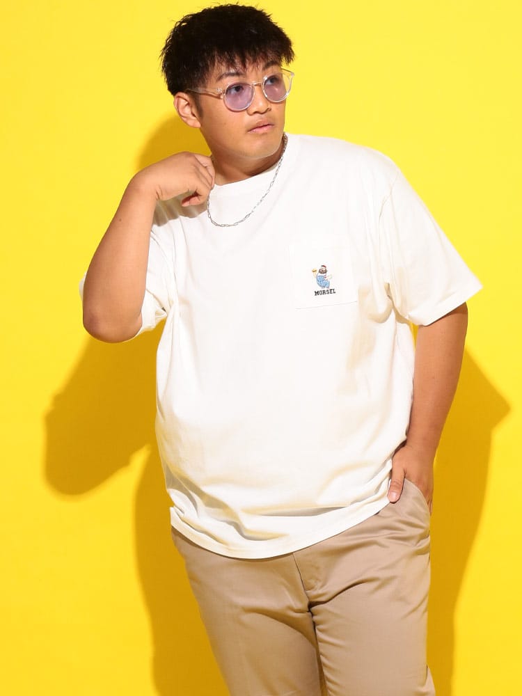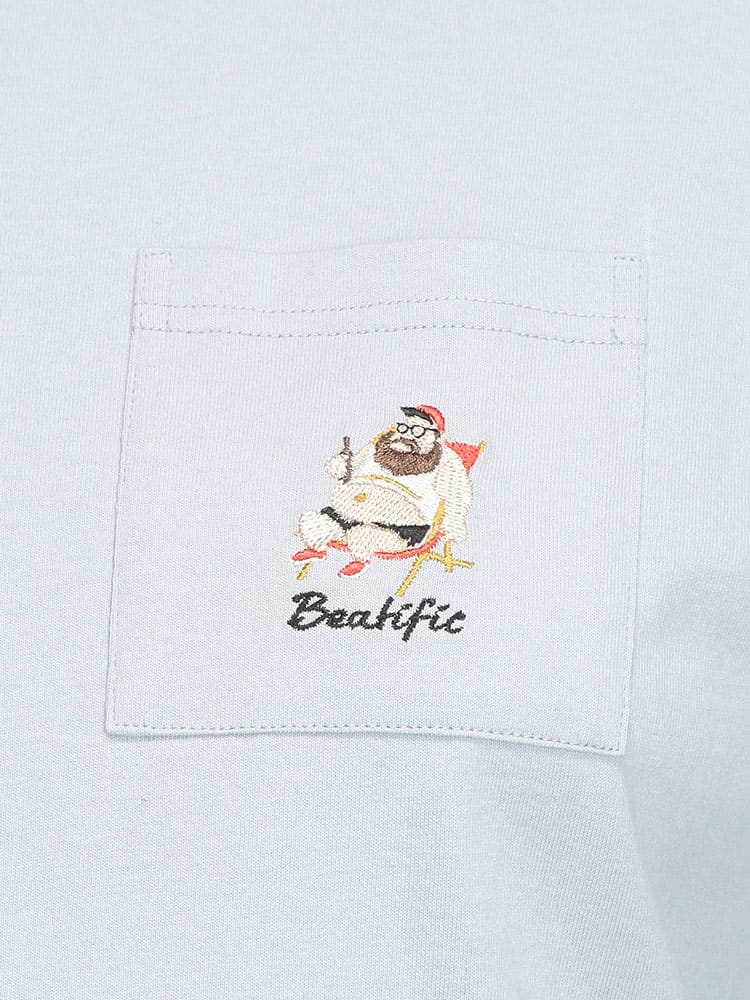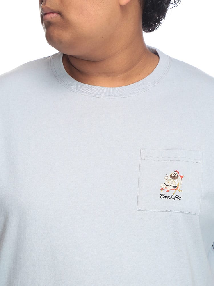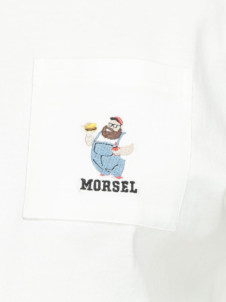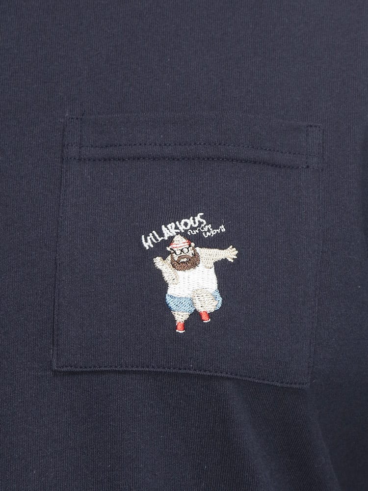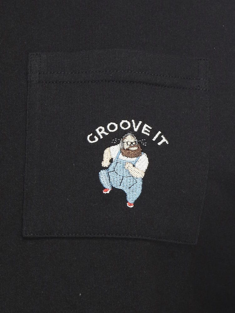 シンプルなデザインながら、胸元のポケットに施されたおじさんの刺繍がアクセントになっています。