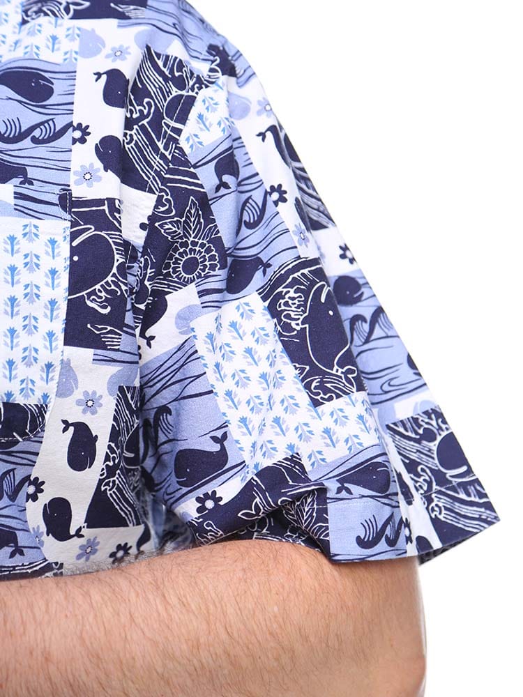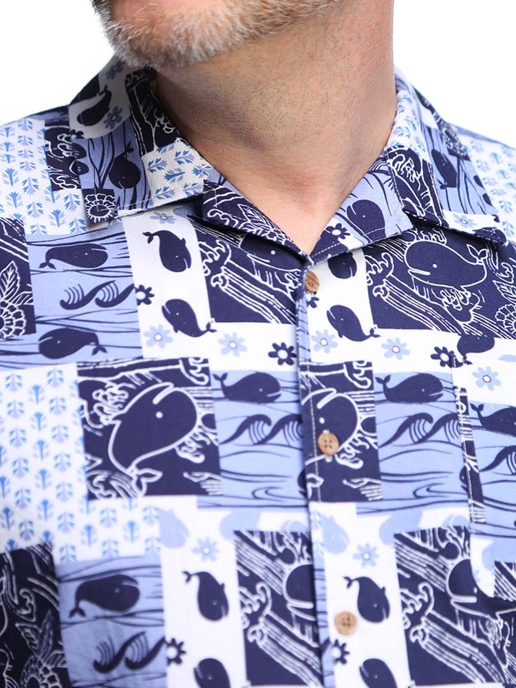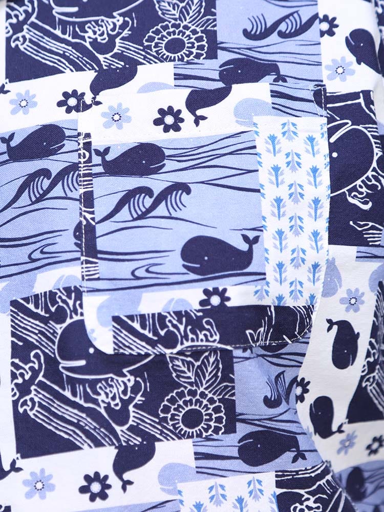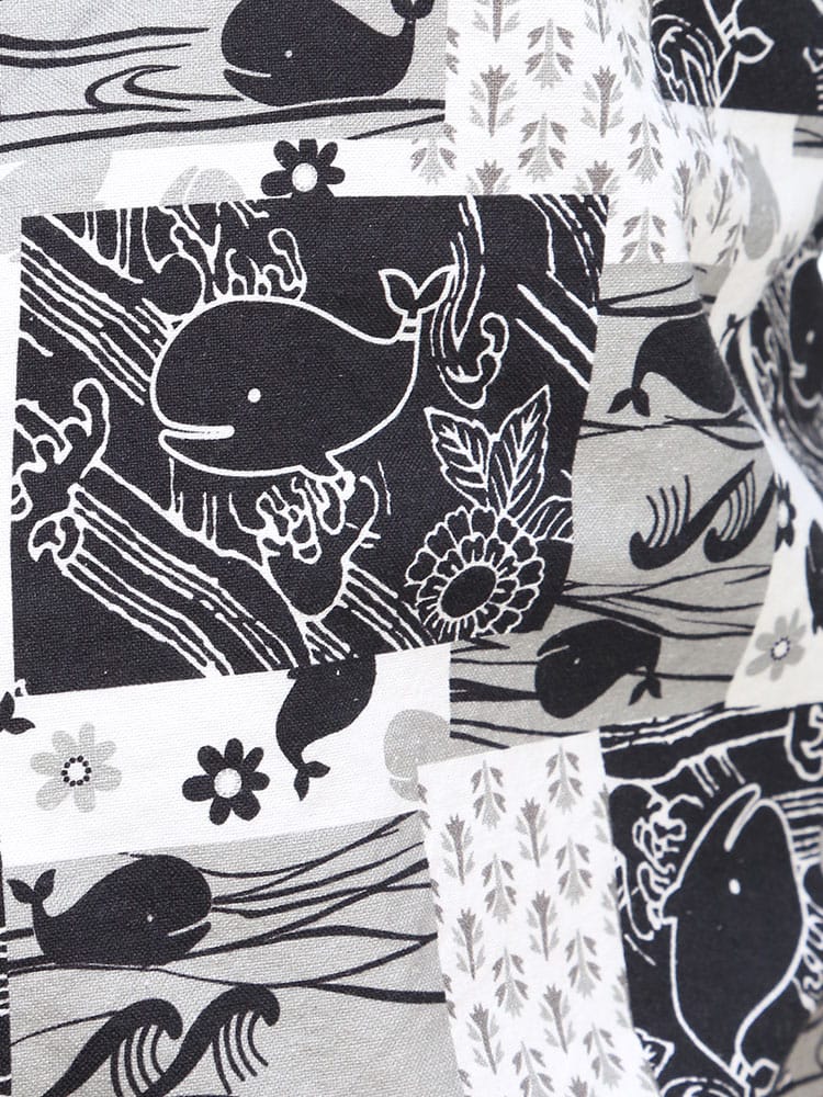 コットン生地で仕上げたクジラ パッチワーク風 オープンカラー 半袖 シャツです。クジラのパッチワークデザインがポップなアイテム。フロントにポケット付き。生地には肌触りの良いコットン生地を使用しています。カジュアルスタイルにおすすめの一枚です。