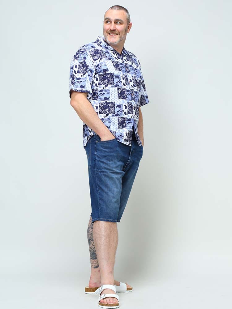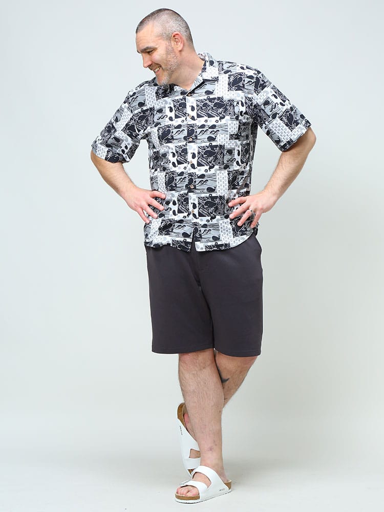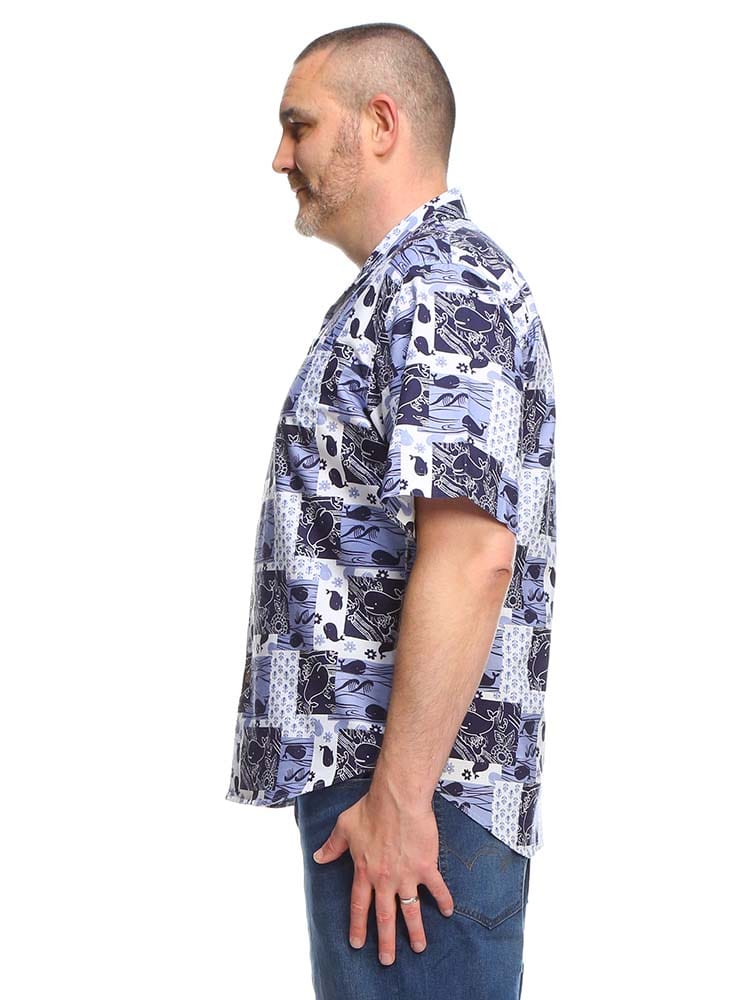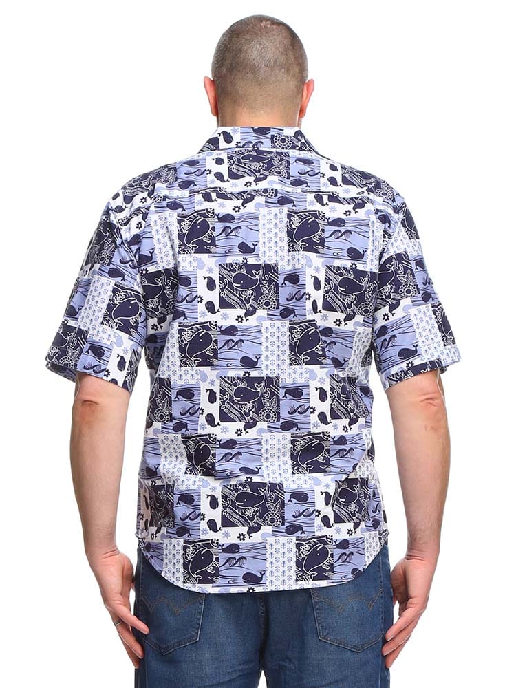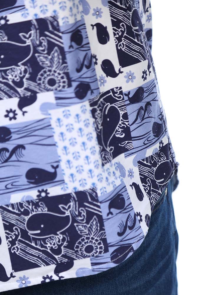コットン生地で仕上げたクジラ パッチワーク風 オープンカラー 半袖 シャツです。クジラのパッチワークデザインがポップなアイテム。フロントにポケット付き。生地には肌触りの良いコットン生地を使用しています。カジュアルスタイルにおすすめの一枚です。