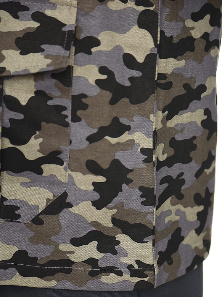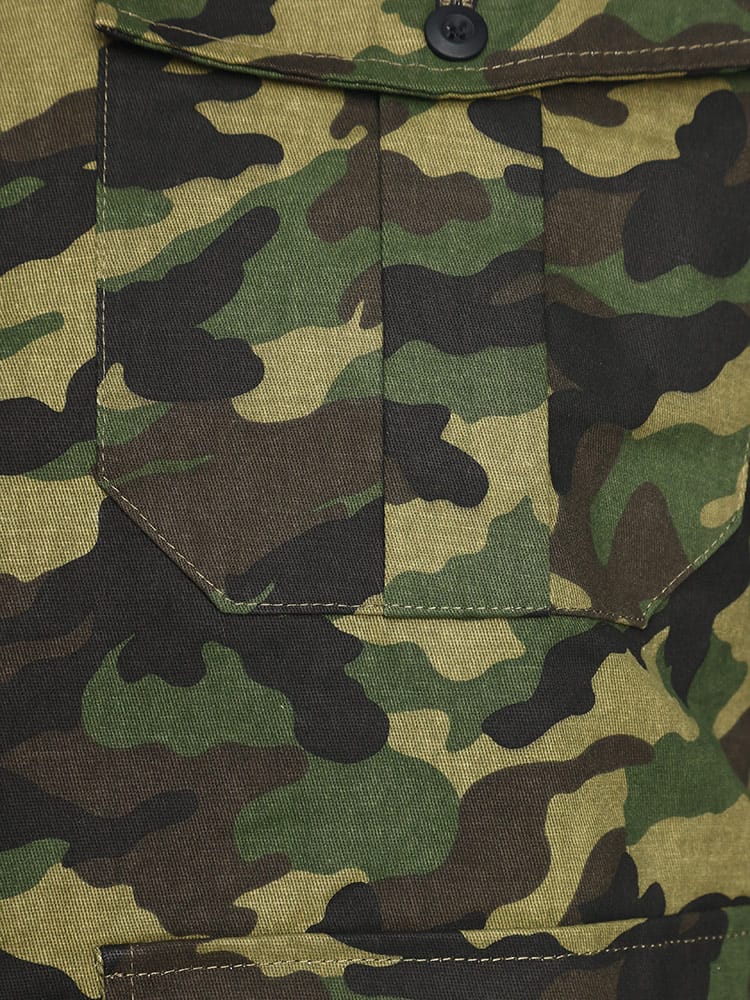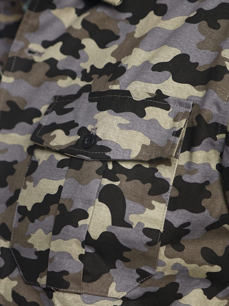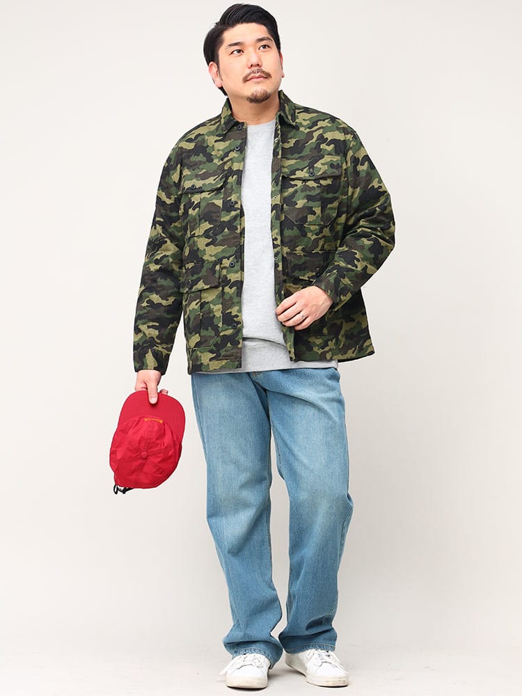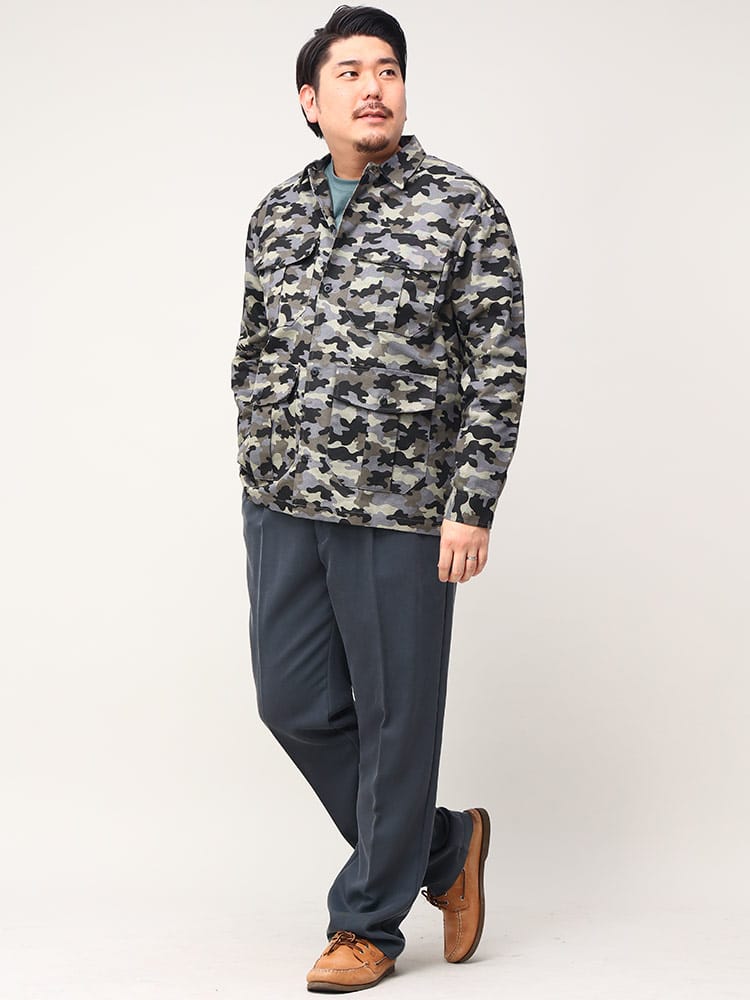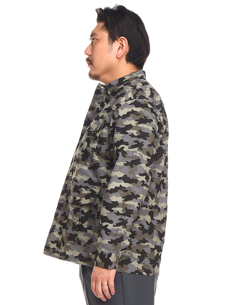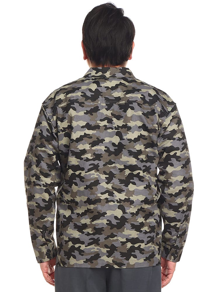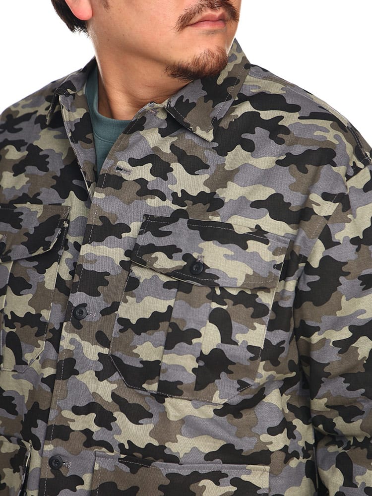 ミリタリーテイスト漂うカモフラージュ長袖シャツです。しっかりとした厚手のコットンを使用し、春先にはトップスとしても活躍してくれそうな一枚。フロントに配された4つのポケットは実用性も高く、ミリタリーな雰囲気をアップしてくれるポイントに。