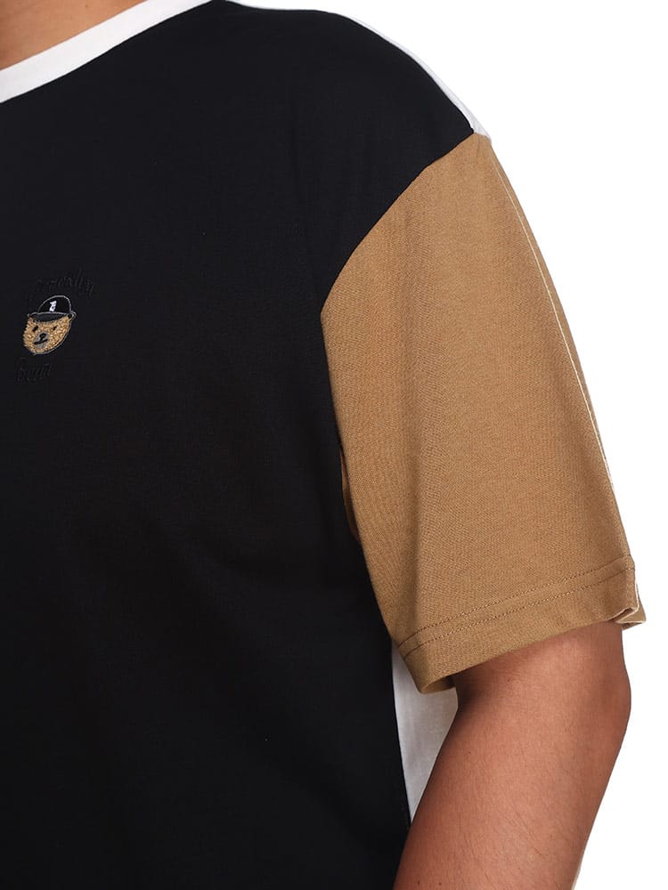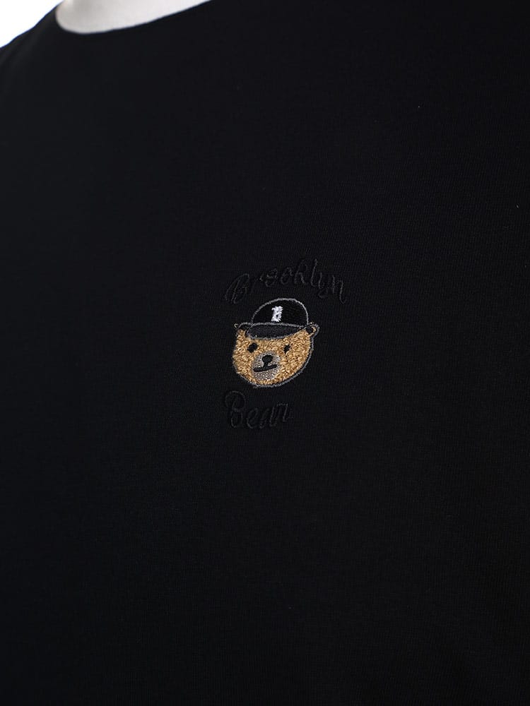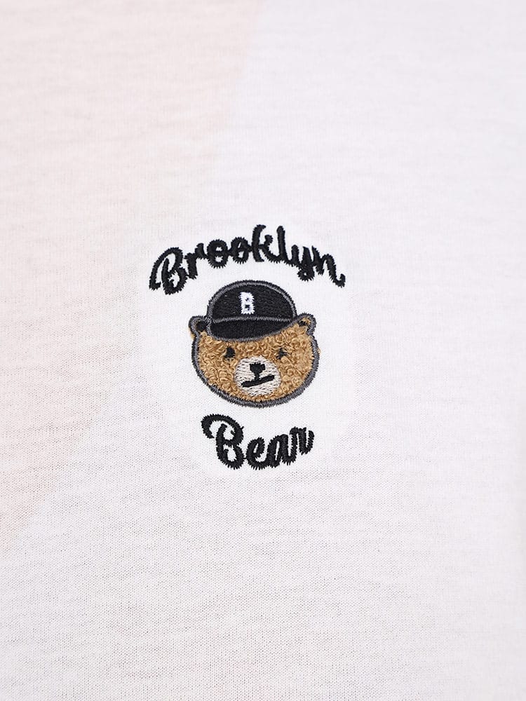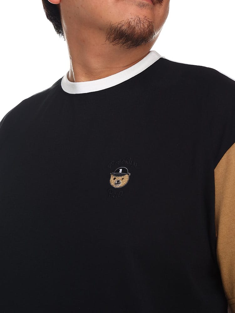 B&T CLUBのBROOKLYN BEAR サガラ刺繍 クルーネック 半袖 Tシャツ。胸元に小さくサガラ刺繍で描かれたかわいらしいクマがワンポイント。フロント、バック、袖と、切り替えによって色の違う生地をしたポップな印象の一着です。