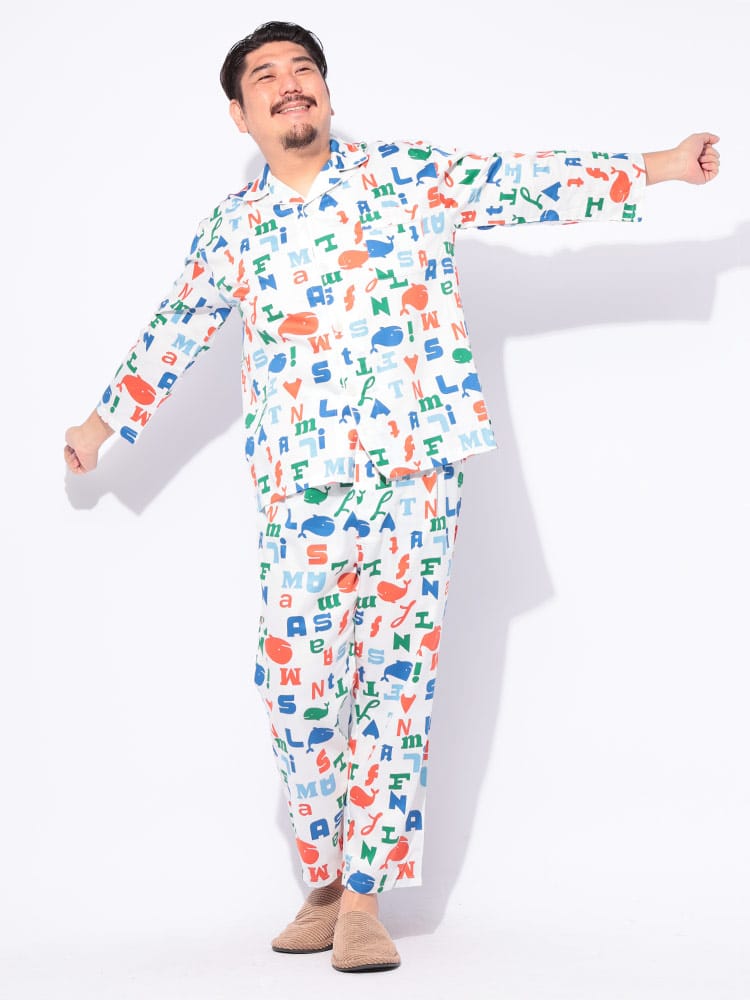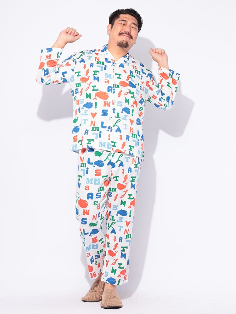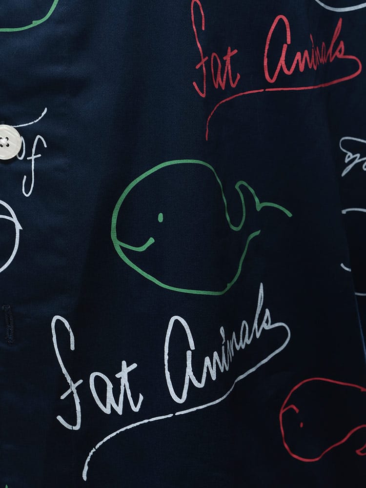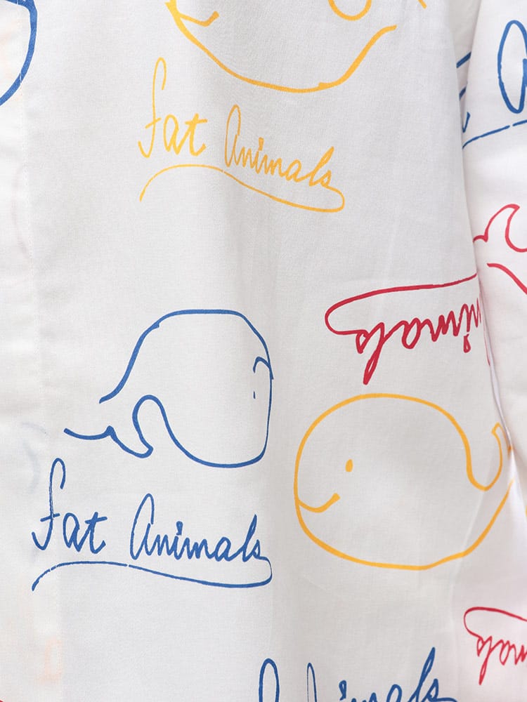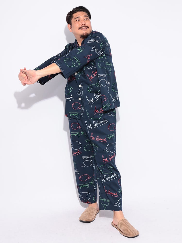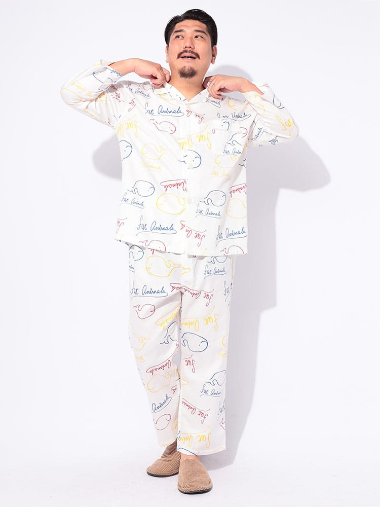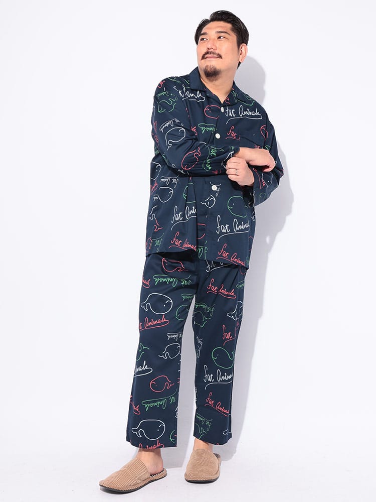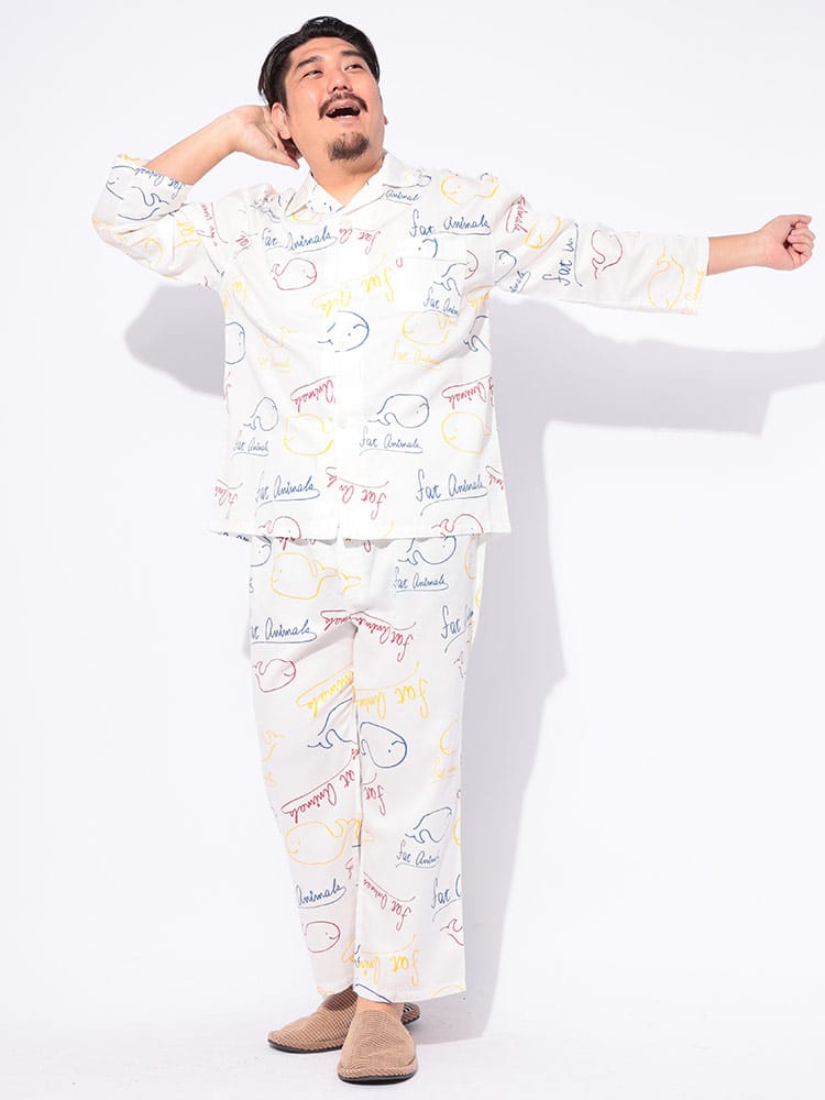 ゆったりくつろぐ夜にぴったり!FAT ANIMALS 総柄パジャマ。思わず笑顔になるぽっちゃりアニマルの総柄が可愛らしく、肌触りの良い素材で快適な着心地です。前開きタイプで着脱も楽々。おうち時間を最高にハッピーにしてくれる、とっておきのルームウェアです。