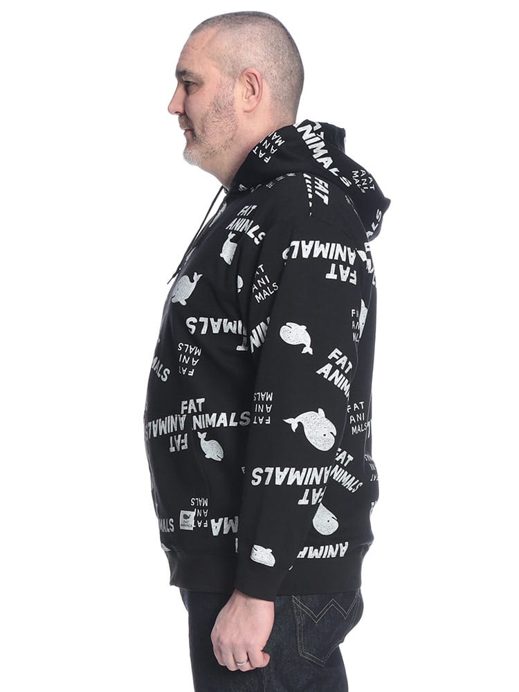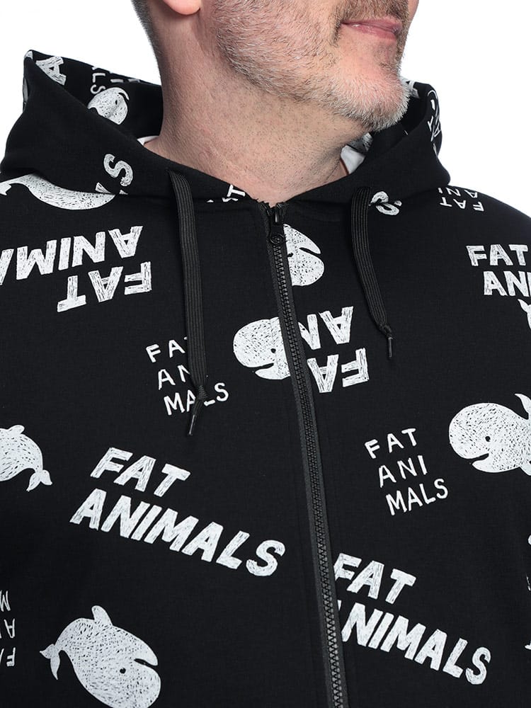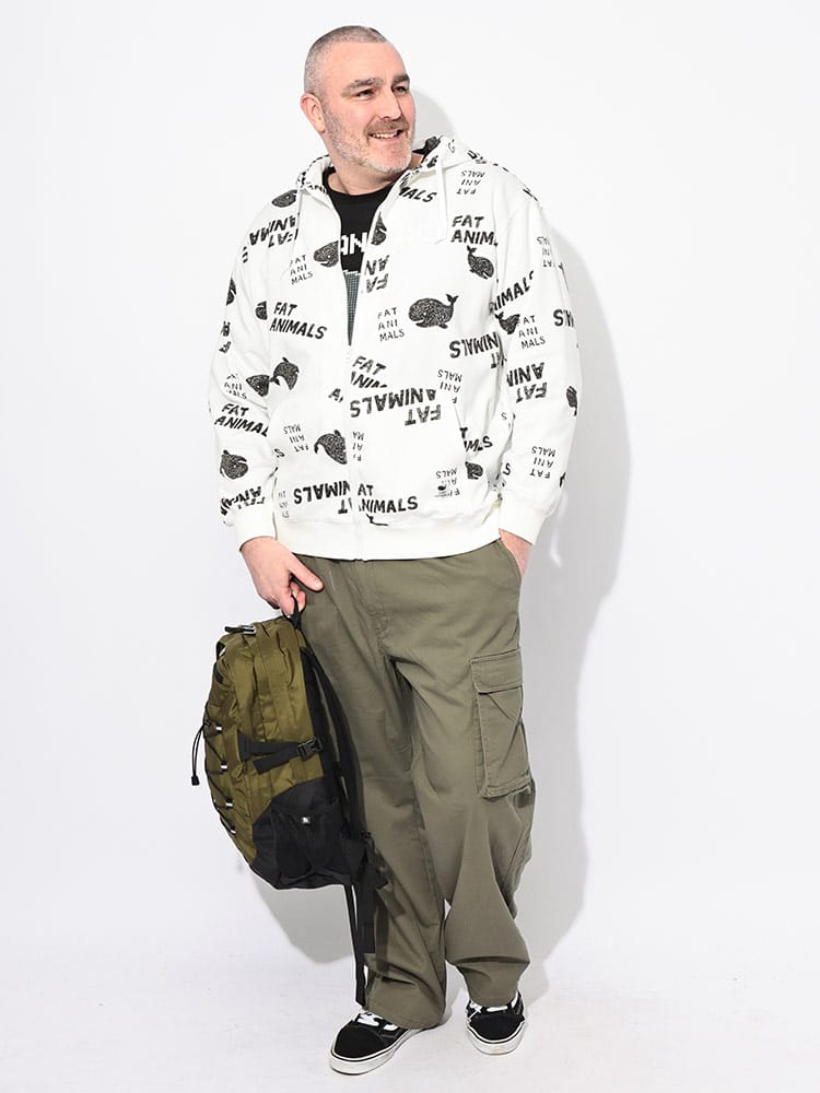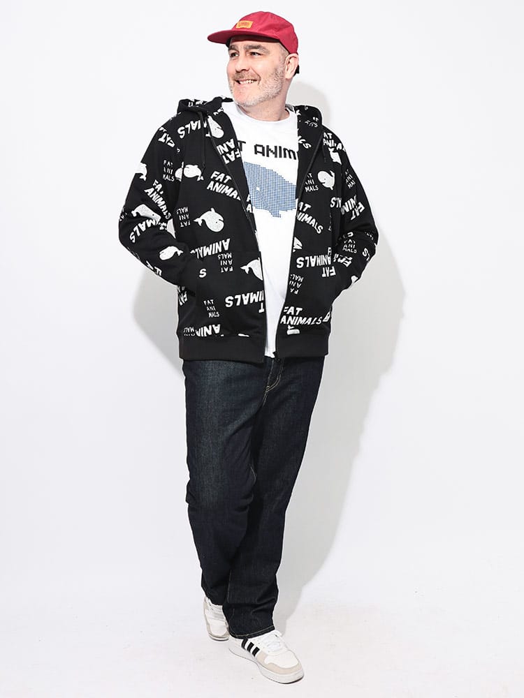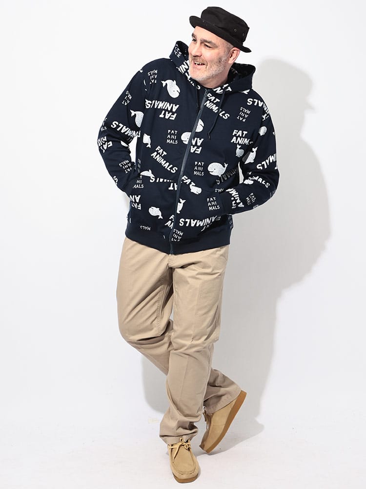 B&T CLUBの「FAT ANIMALS」シリーズから、愛嬌たっぷりのクジラたちが目を引くフルジップパーカーが登場。遊び心溢れる総柄デザインが、カジュアルな着こなしにポップなアクセントをプラスします。着脱がスムーズなジップアップ仕様と、ゆったりとした大きいサイズ設計で、リラックスタイムや外出時の羽織りとして大活躍。柔らかな肌触りで着心地も良く、周りと差がつく個性的で楽しいスタイリングを叶える一着です。