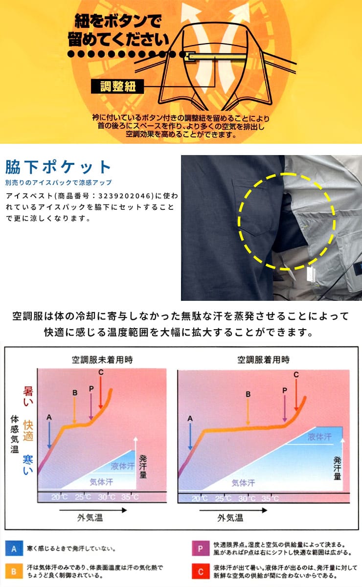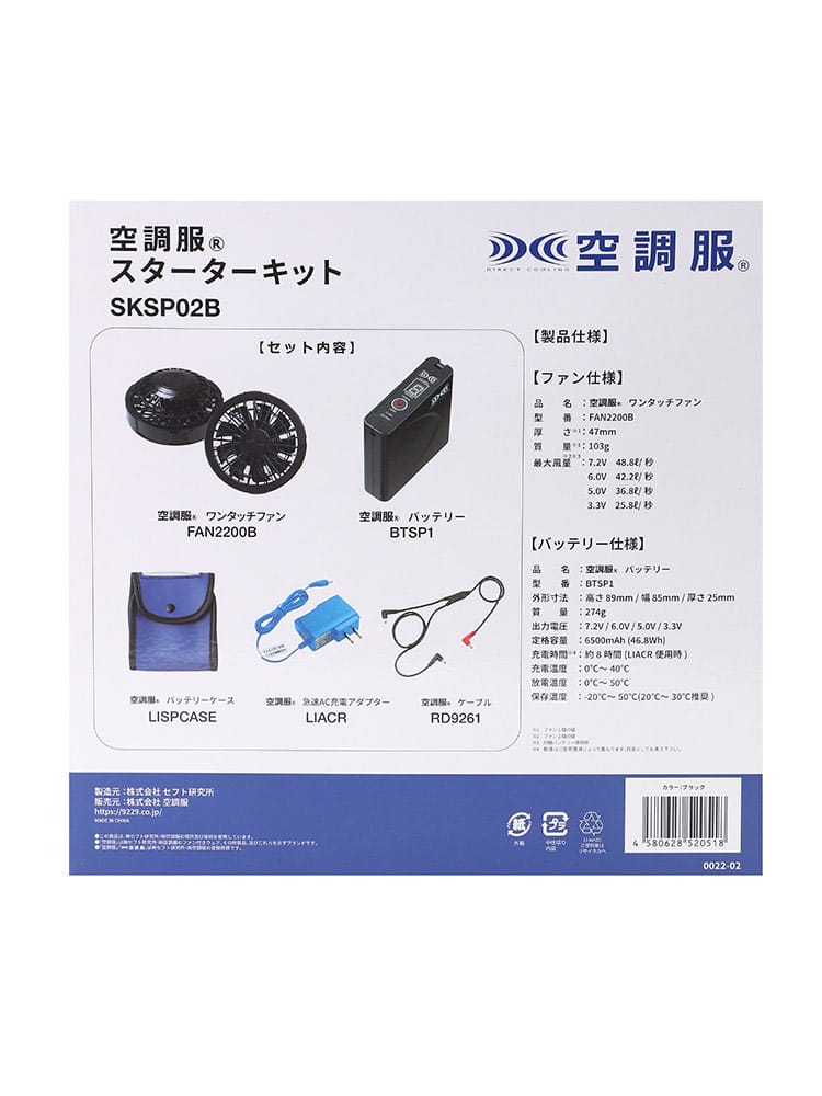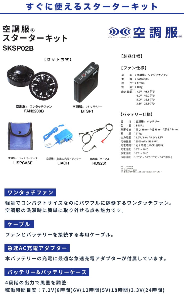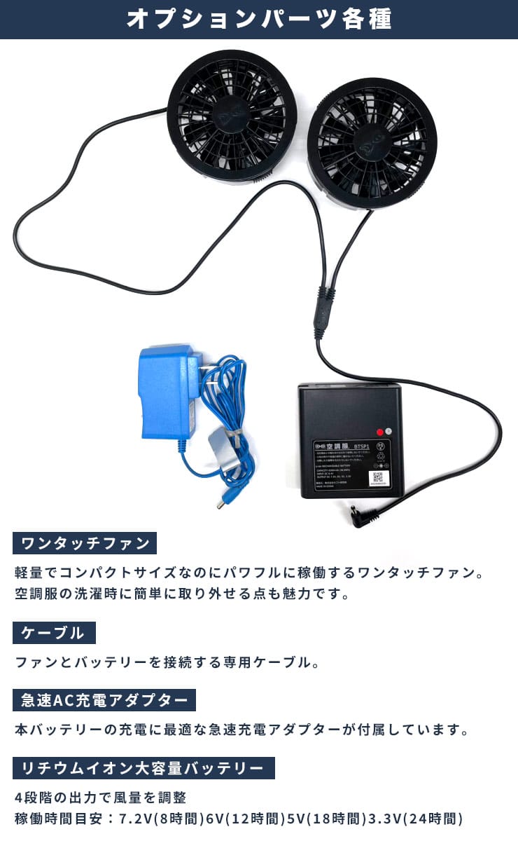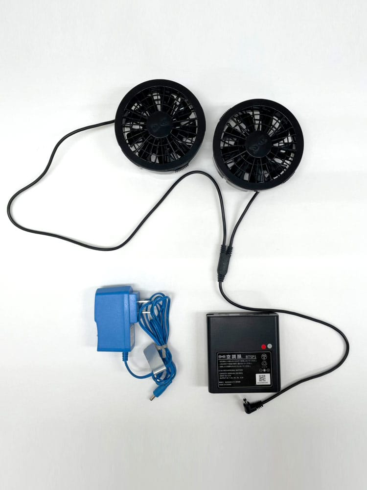 仕様 :外側ポケット数×3つ / シングルジップ / 撥水加工 / 脇に保冷剤ポケット付き / 反射材使用 / バッテリー274g / ファン103g / 充電時間8時間