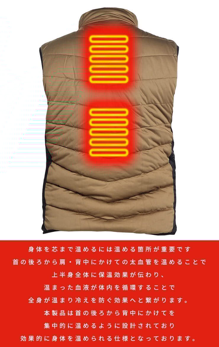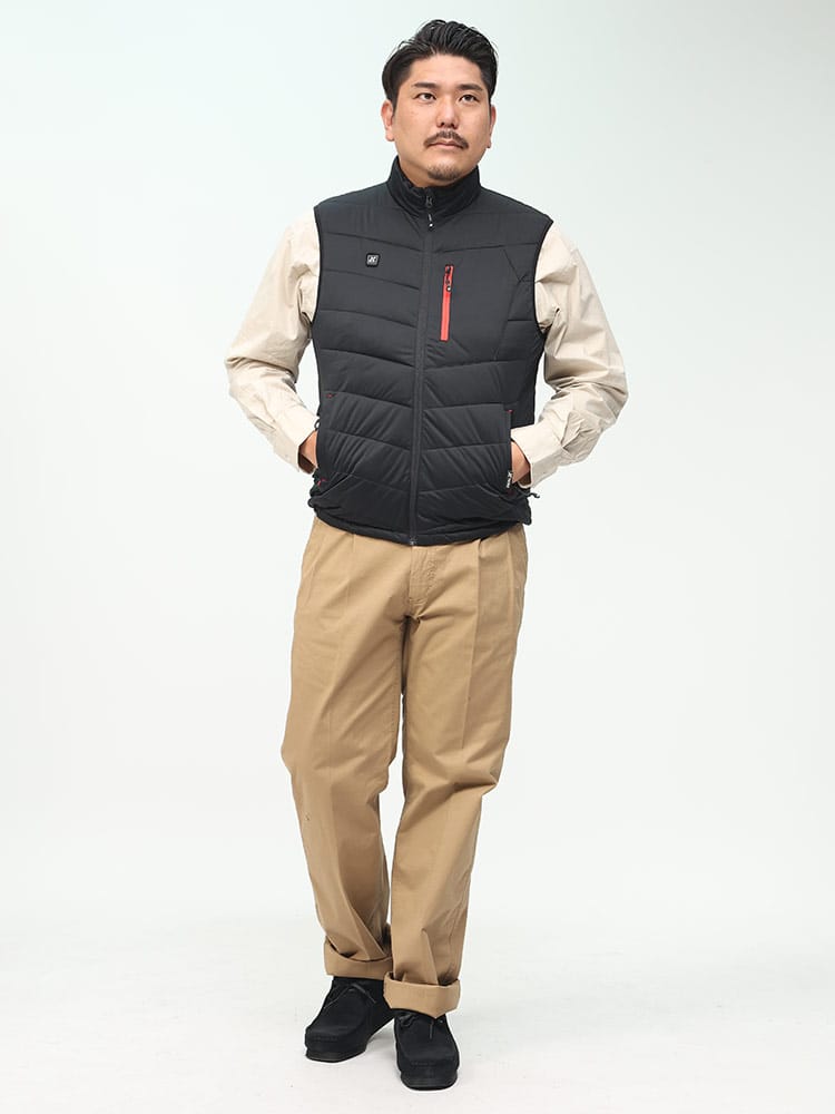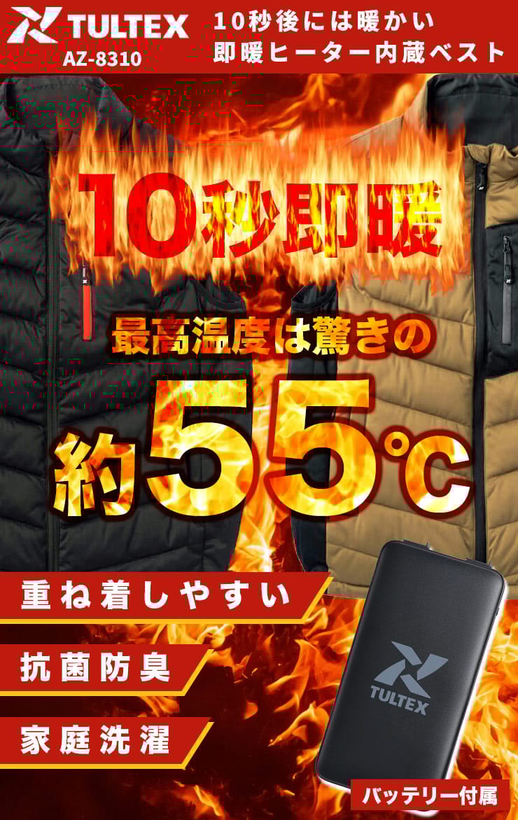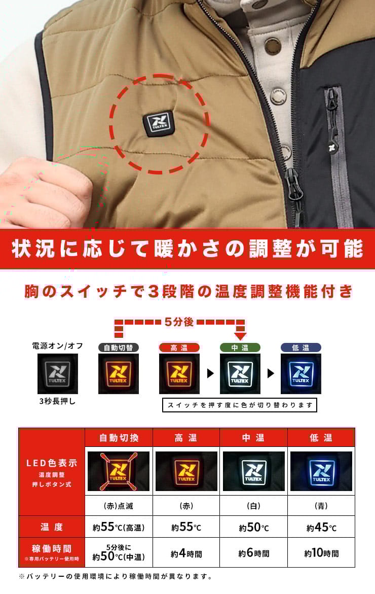 TULTEXのヒーター内臓インナーベストは、寒い日に温かさを持続させるために最大約55℃まで加熱可能です。抗菌防臭技術により、清潔感を長時間維持します。このベストは防風ニット素材を使用しており、冷たい風の侵入を効果的に阻止。さらに、ストレッチ性が高いため、身動きがしやすく、日常の活動やアウトドアでの動きを制限しません。軽量でシンプルなデザインは、他の衣服との重ね着にも適しています。