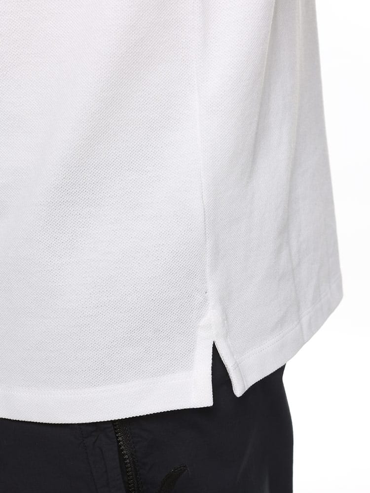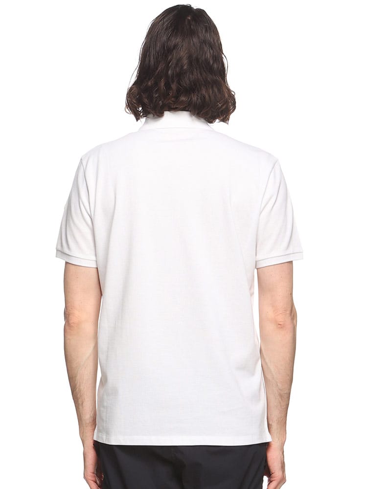 メンズウェアのクラシックなアイテムである、コットンピケ素材を使用したポロシャツです。ブランドロゴはミニマルに抑えられ、ボタン留めに沿ってエンボス加工のロゴがあしらわれています。。コットンピケ素材を使用。ニットの襟と袖口。マザーオブパールのボタンでクローズ。半袖。エンボス加工のレタリングロゴ入り。