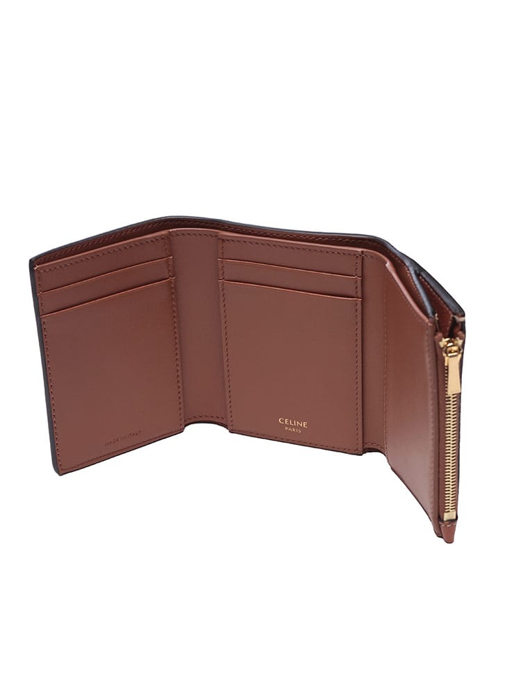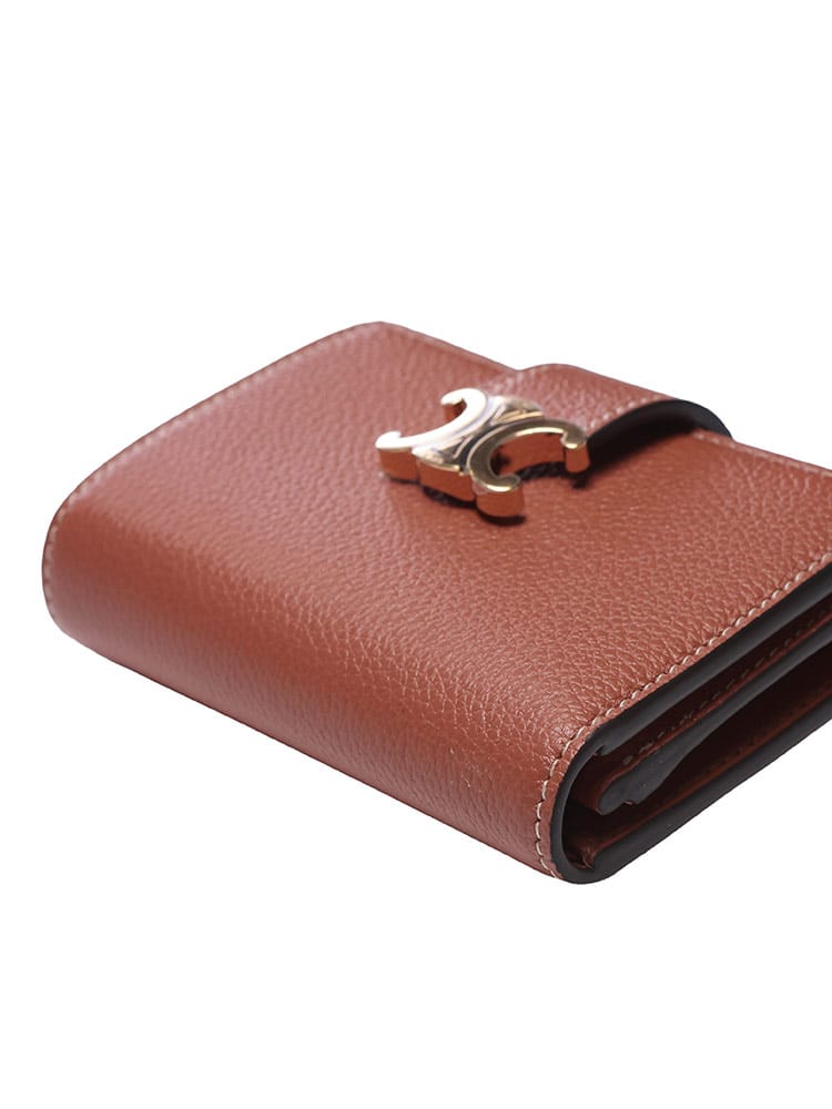 上質なレザーを使用した三つ折り財布。アイコニックな「トリオンフ」のメタリックスナップボタンが、ミニマルなデザインに華やかなアクセントを添えます。コンパクトながらも札入れ、小銭入れ、複数のカードスロットを備え、機能性も優秀。バッグを選ばないサイズ感とエレガントなルックスで、日常を格上げする逸品です。