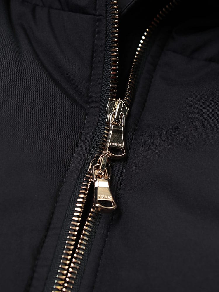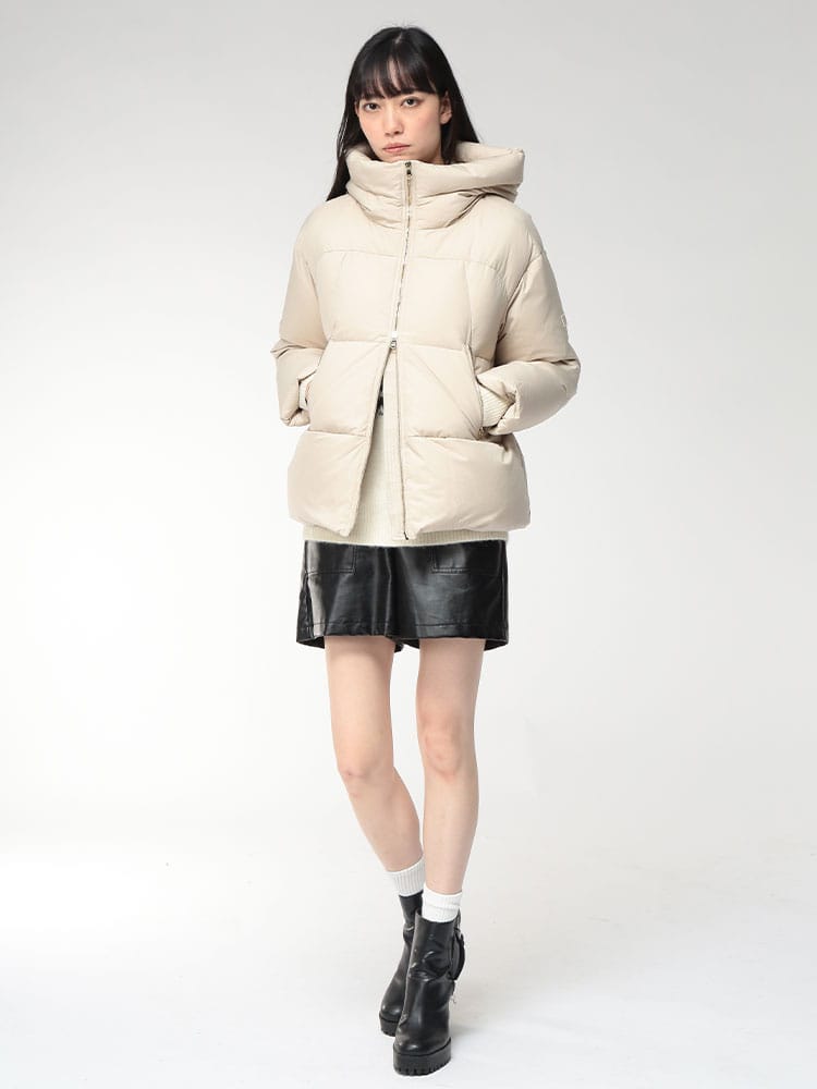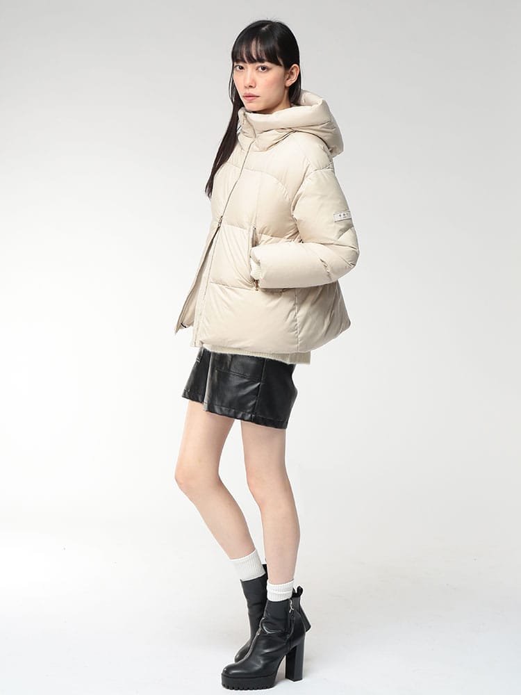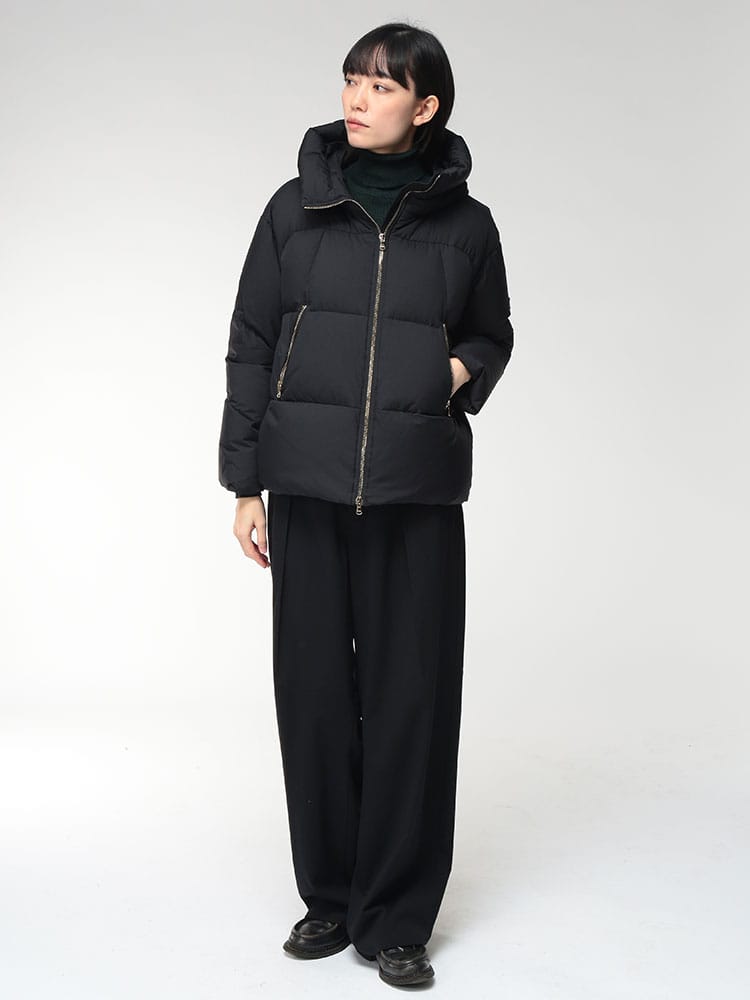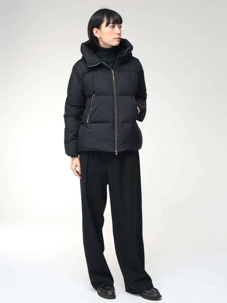 「GIGI(ジジ)」は、ゆったりとしたAラインシルエットが特徴のダウンジャケットです。顔周りを包み込むような立体的なフードと、目を引くメタリックのフルジップが上品でモダンな印象。マットな質感のナイロン生地と上質なダウン&フェザーで、軽さと高い保温性を両立し、カジュアルながらもエレガントに着こなせる一着です。