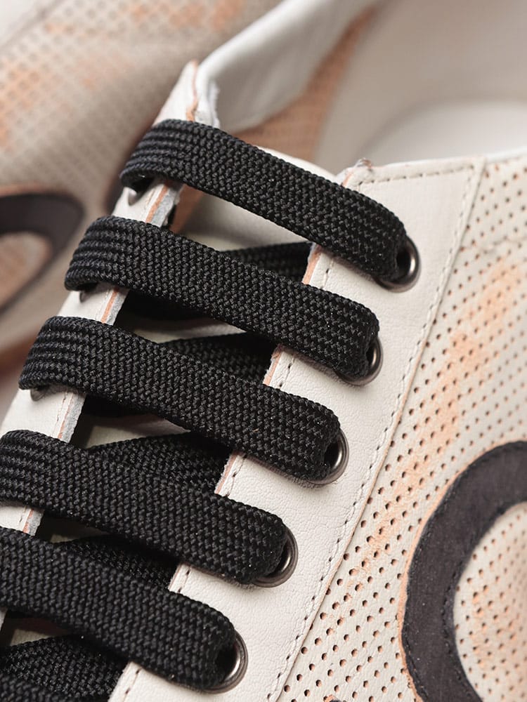 「Thailandia」スニーカーは、上質なカンガルーレザーを使用したレースアップシューズです。過去のアーカイブを再解釈したデザインが特徴で、サイドにあしらわれたロゴのようなパンチングディテールが、洗練されたモダンなアクセント。快適な履き心地とラグジュアリーな素材感が融合した、エッジの効いた一足です。