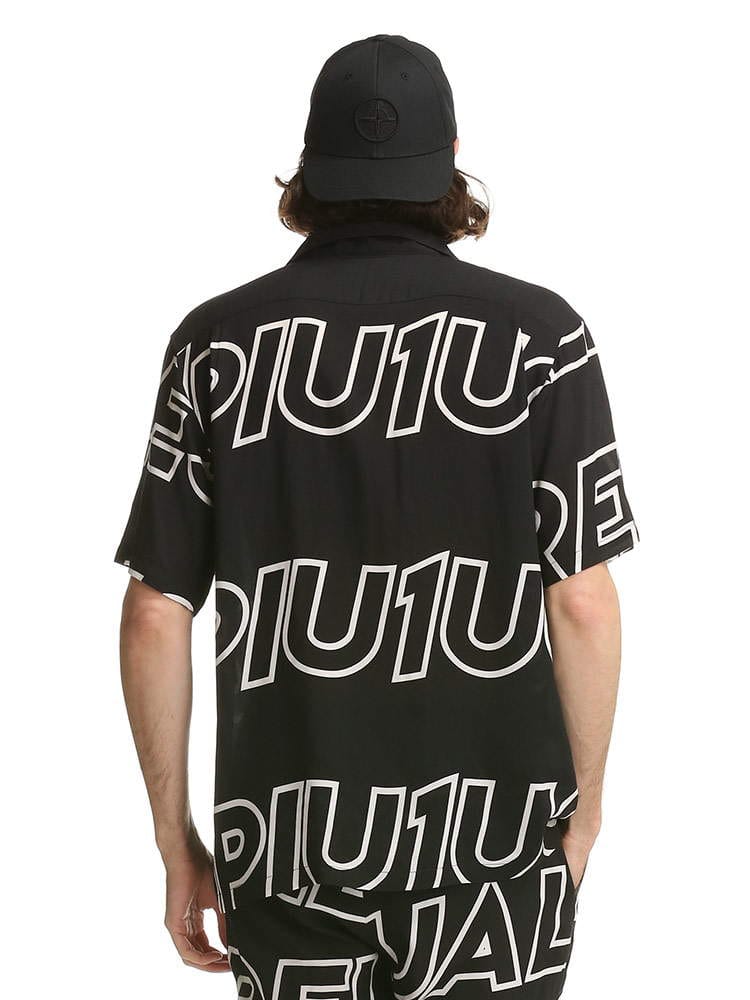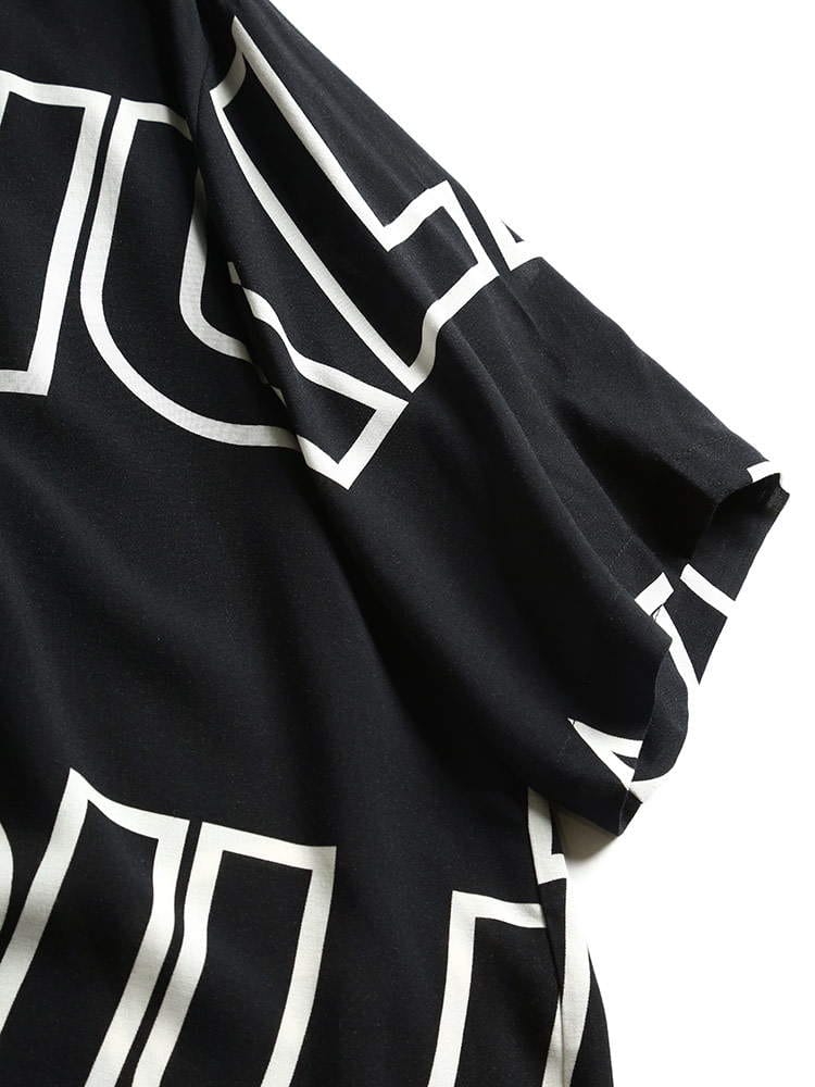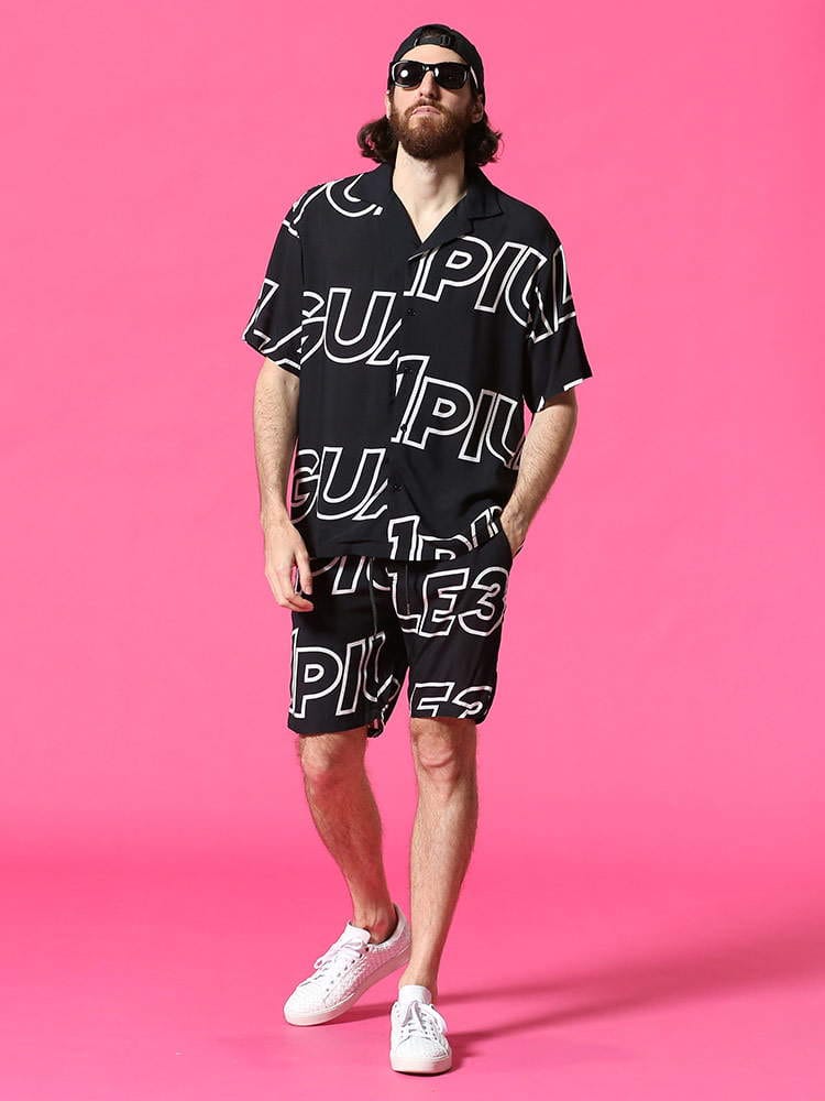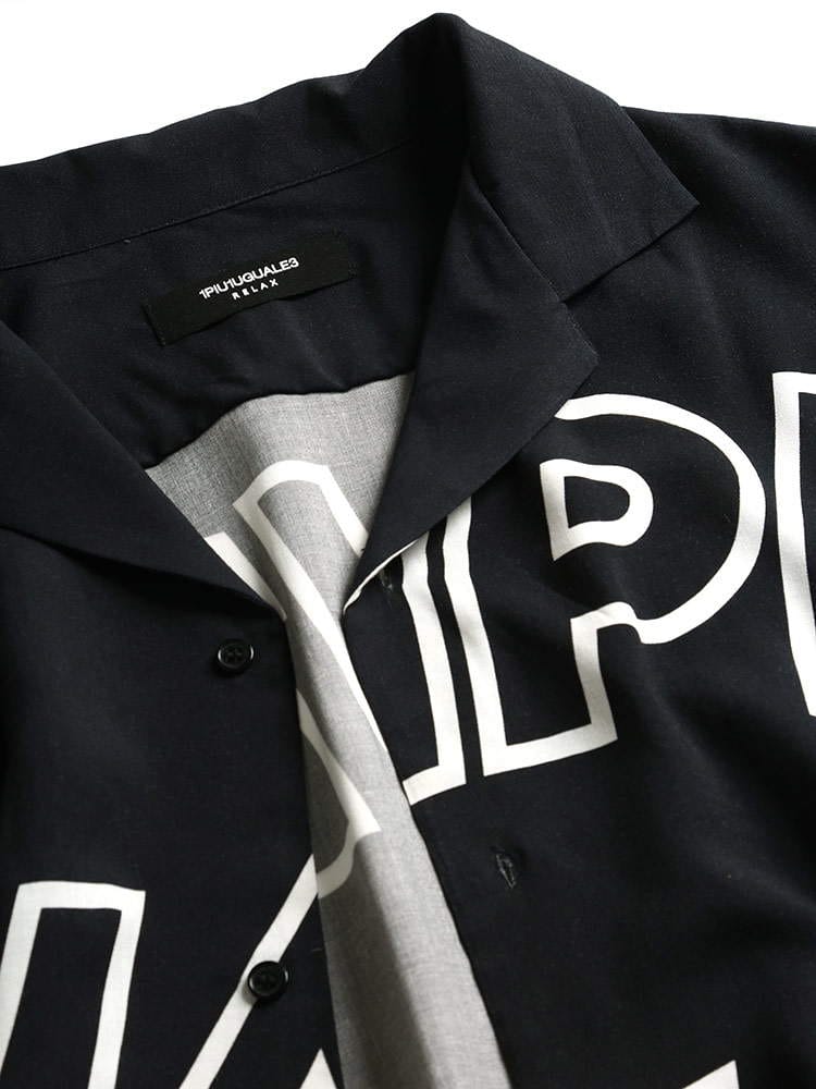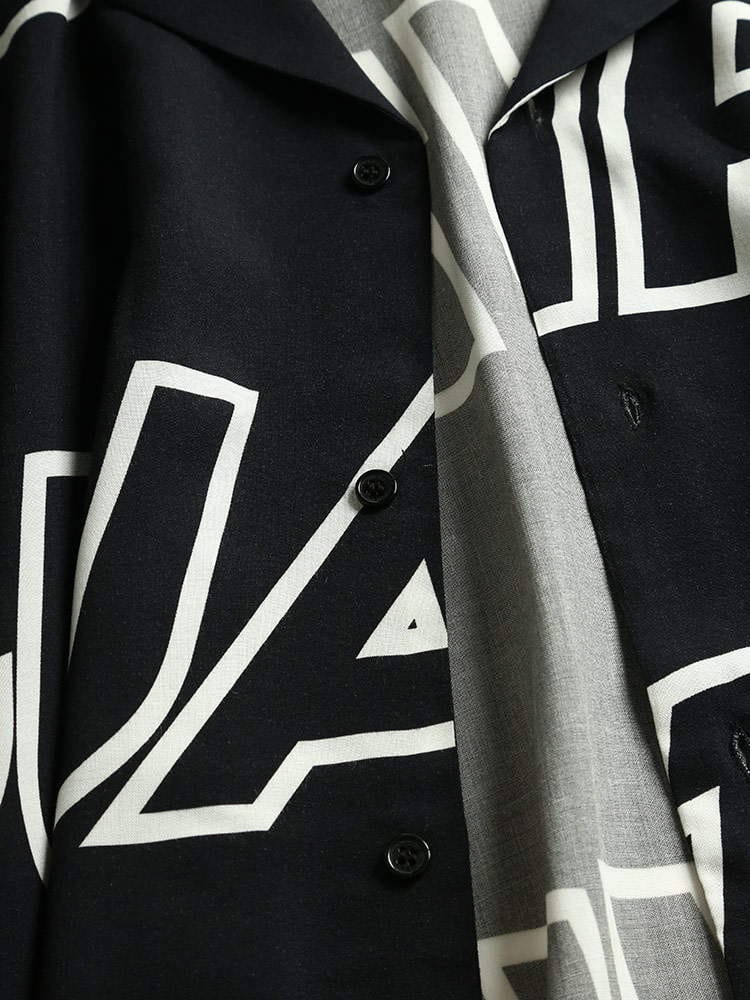 グラフィックロゴが目を引くオープンカラー 半袖 アロハシャツ。テロっとしたレーヨン生地を使用し、着心地にも優れています。