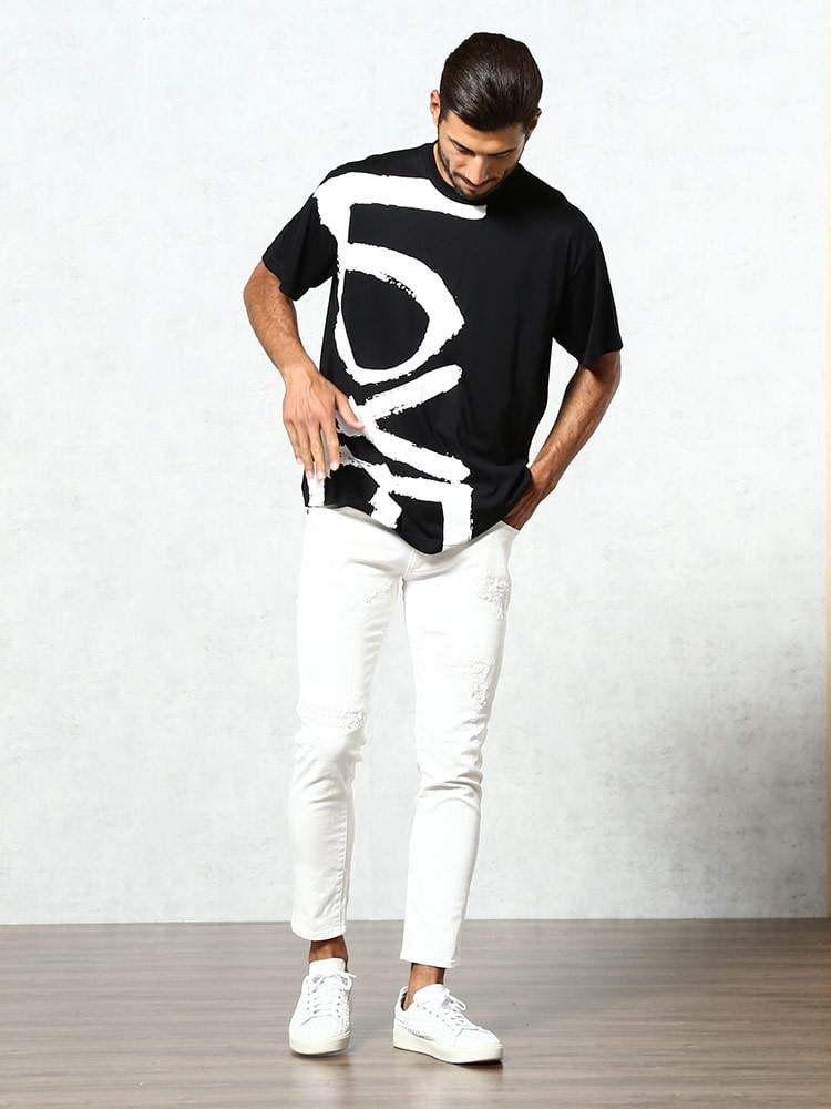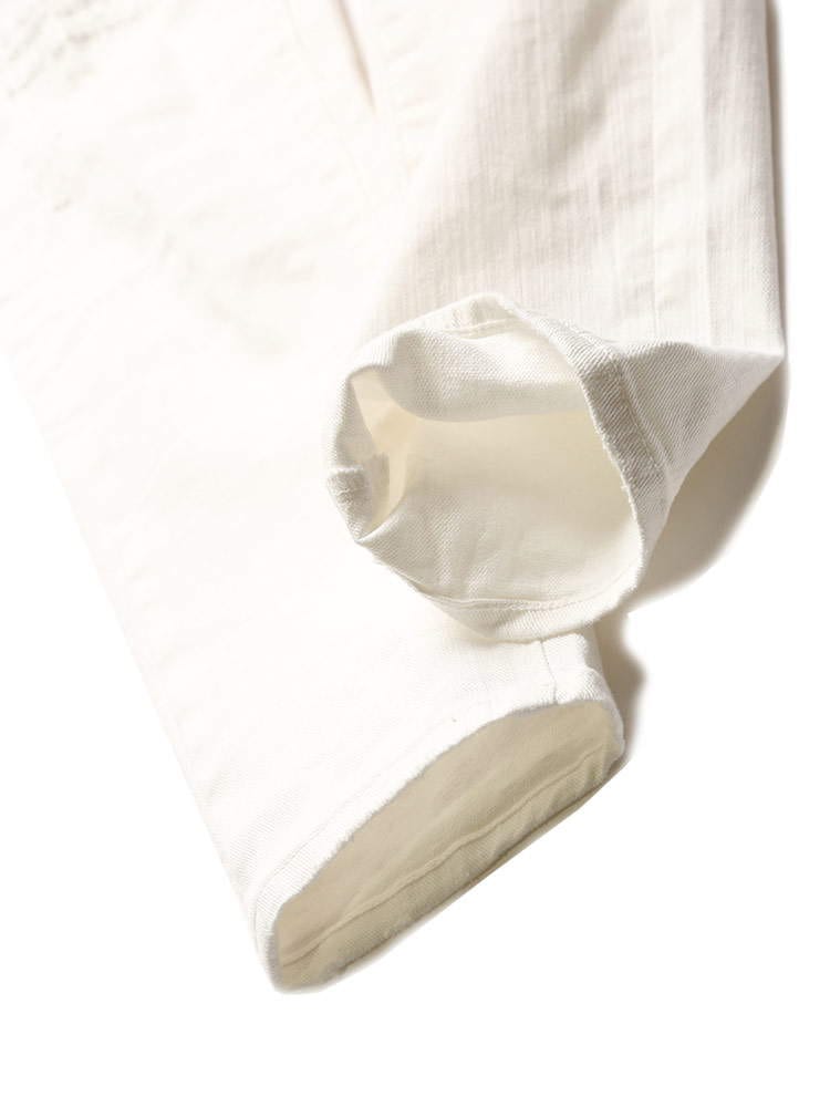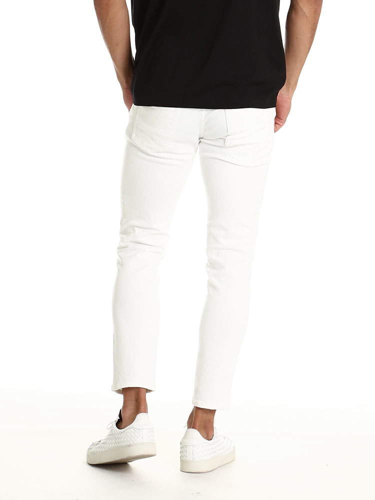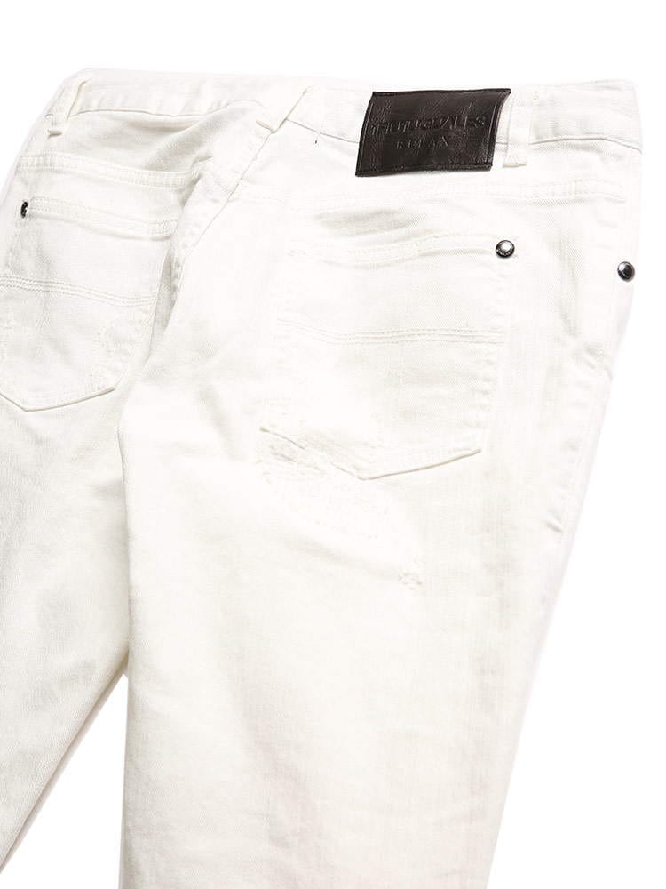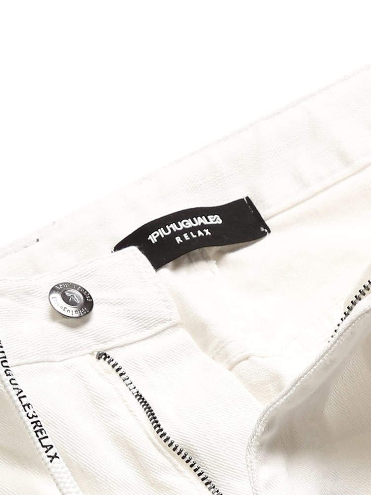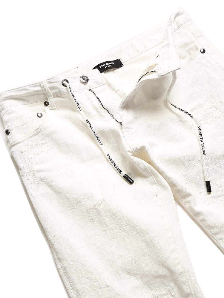 ダメージ加工を施したジップフライ ホワイト ジーンズ JOG。ウエストはドローコード付き。バックウエスト右にブランドパッチ。