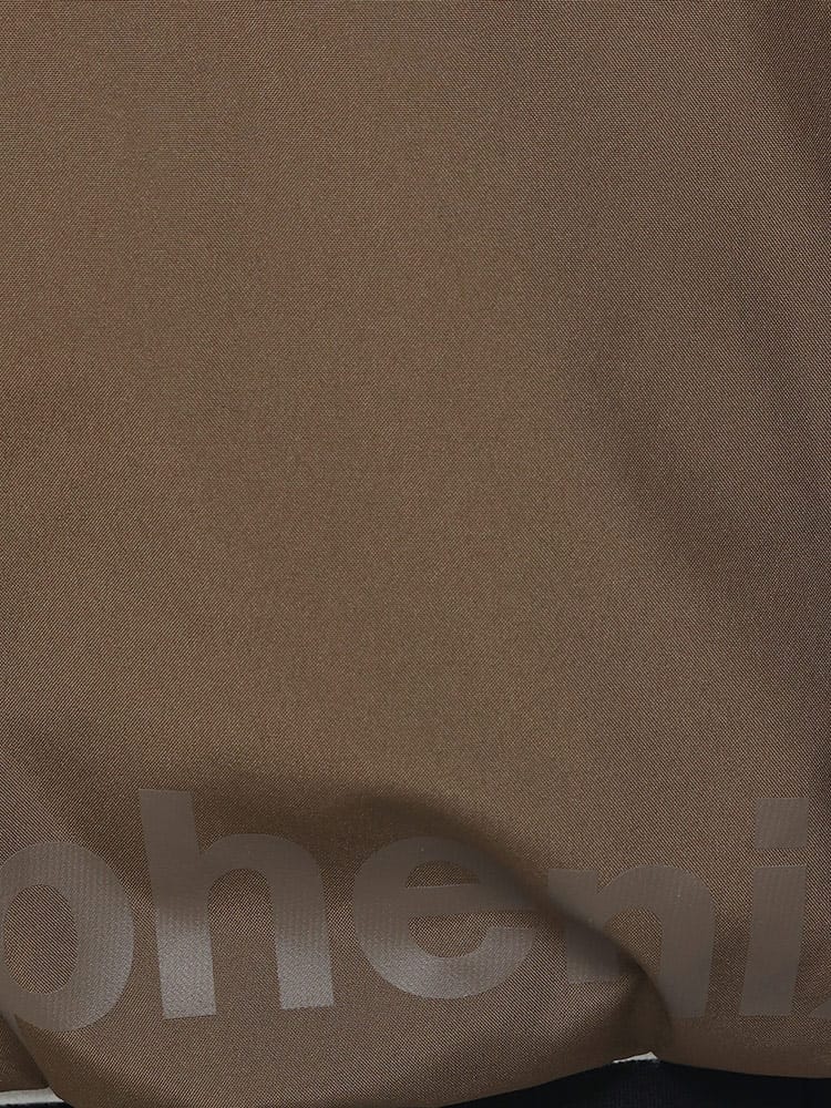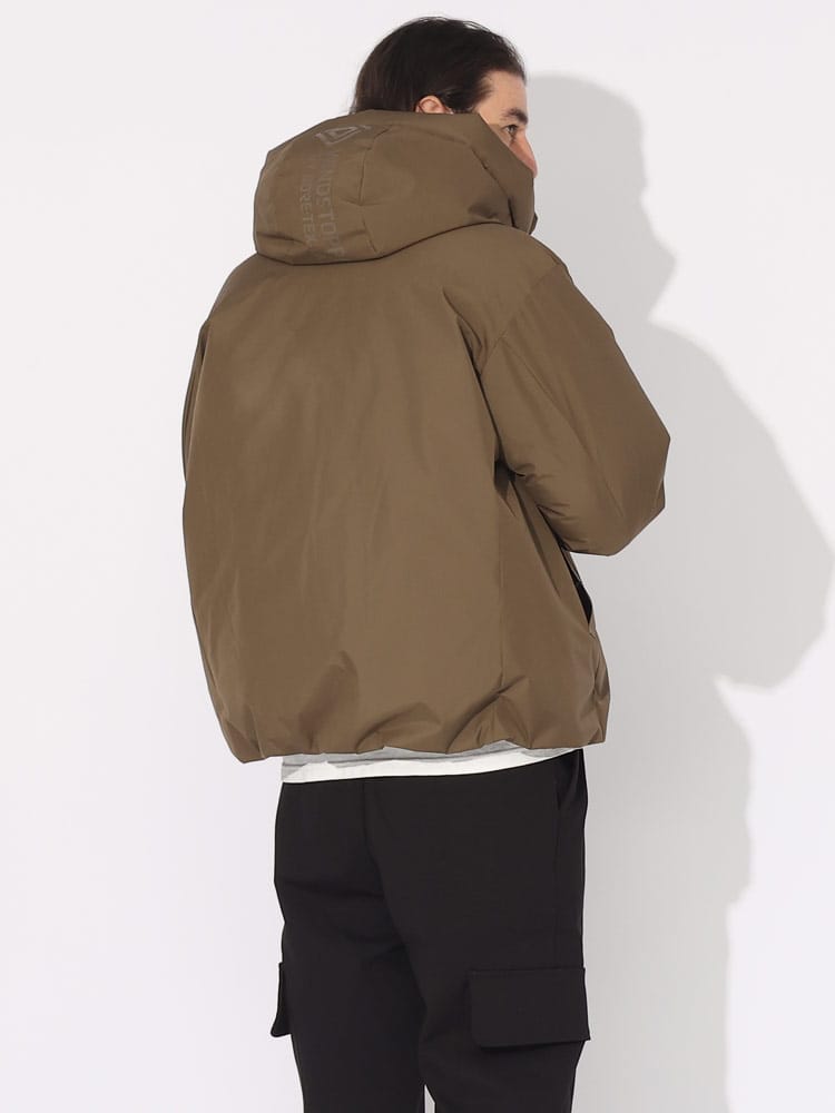 カジュアルな印象になりがちなダウンジャケットですが、フードとフロントの裾部分に同色のロゴをさりげなくプリント。