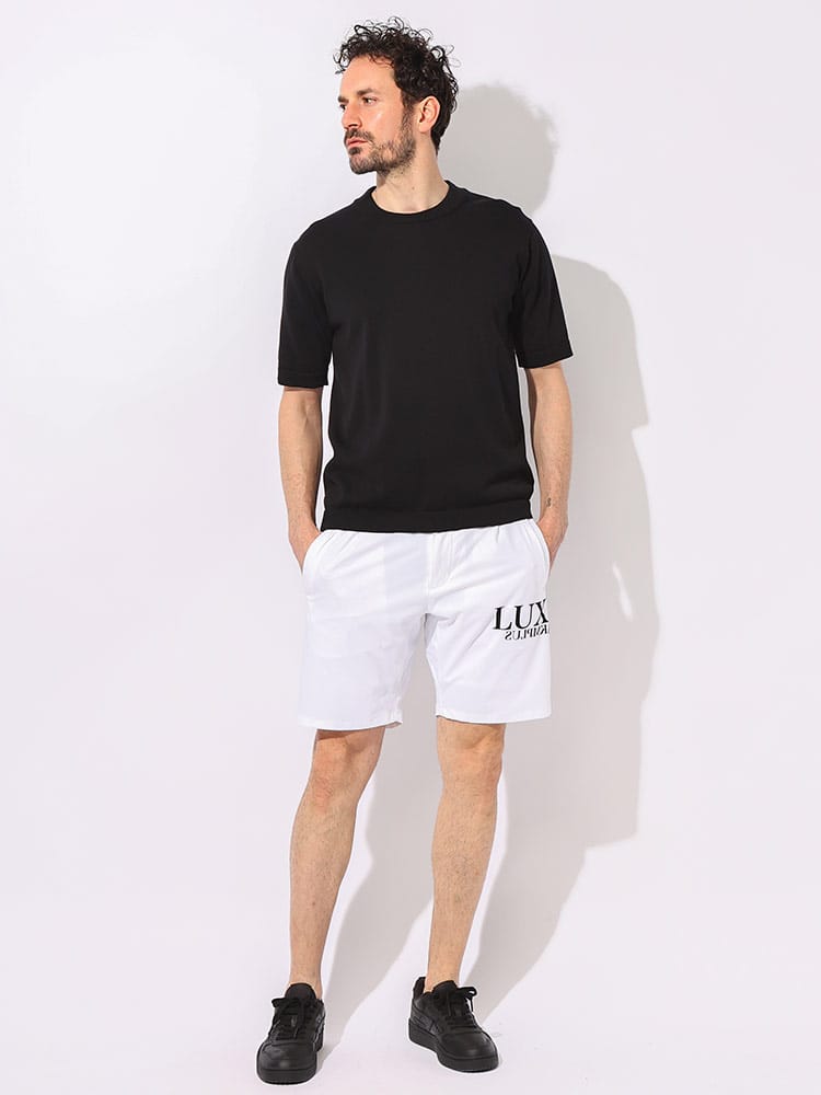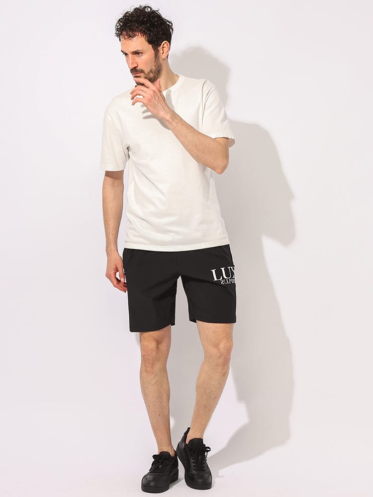サイドラインのブランドロゴがコーディネートに映えるハーフスラックス。