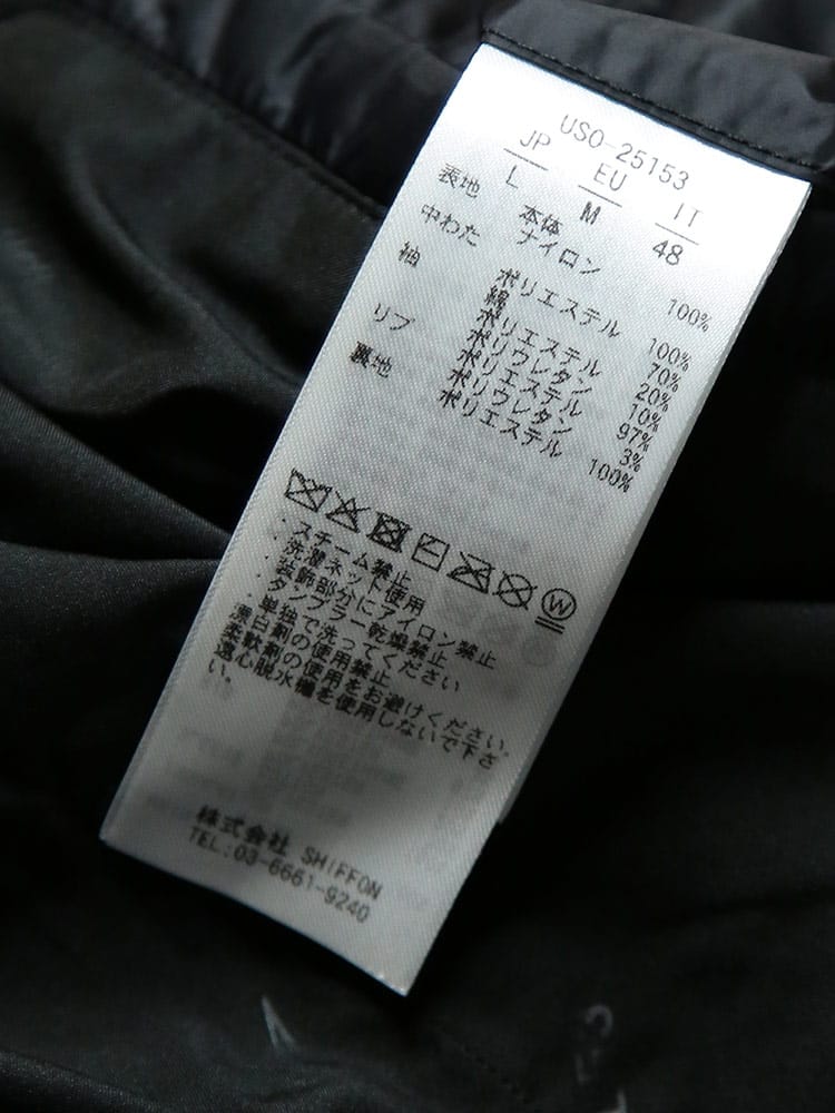 素材 :[表地]ナイロン100% [中綿]ポリエステル100% [袖]綿70% ポリエステル20% ポリウレタン10% [リブ部分]ポリエステル97% ポリウレタン3% [裏地]ポリエステル100%