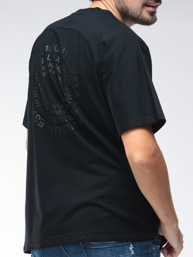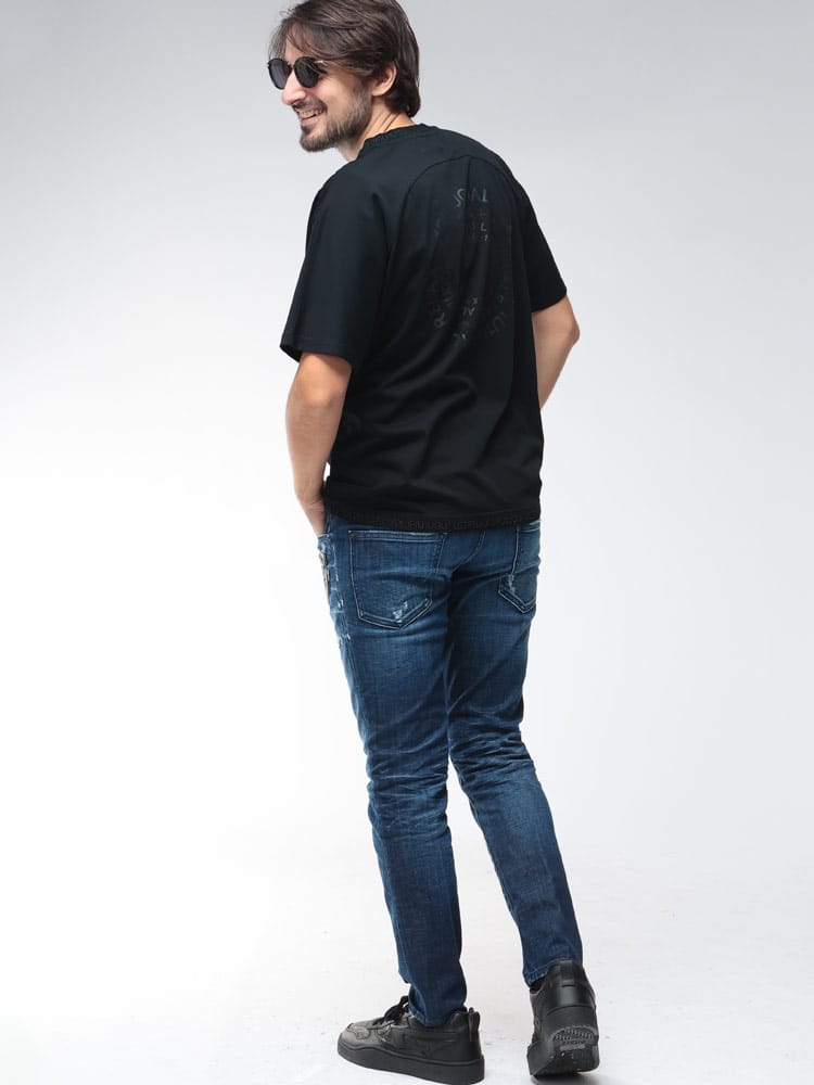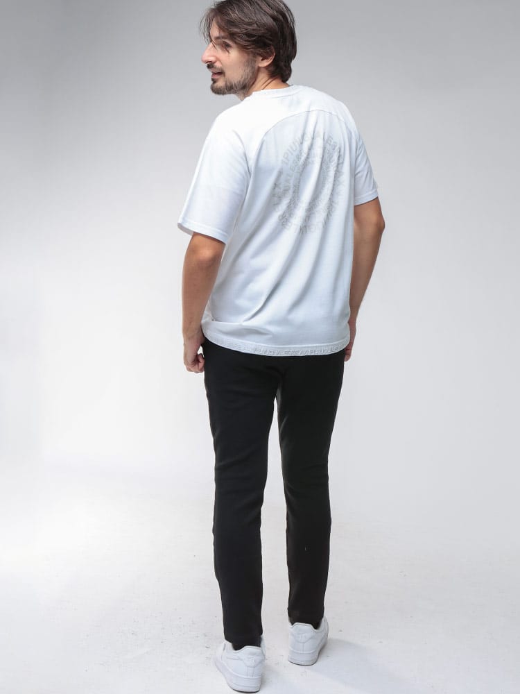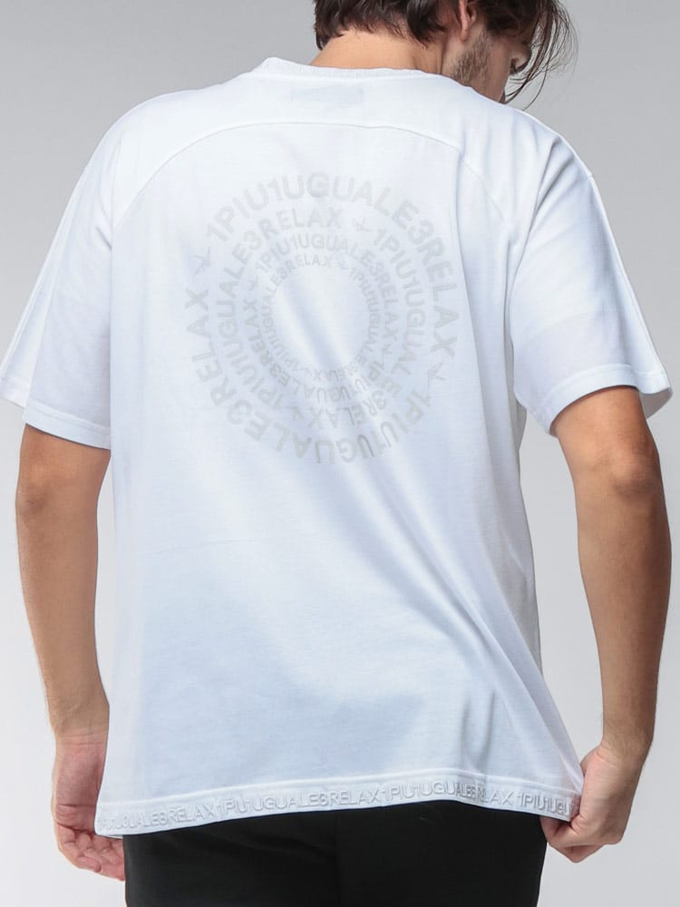 背面にブランドロゴを円型に並べた大胆なデザインプリントが特徴です。フロントはシンプルに仕上げることで、背中のロゴがより際立ちます。上質な素材によるリラックスした着心地と、遊び心あるグラフィカルなデザインが融合した、モダンなストリートスタイルを演出する一枚です。