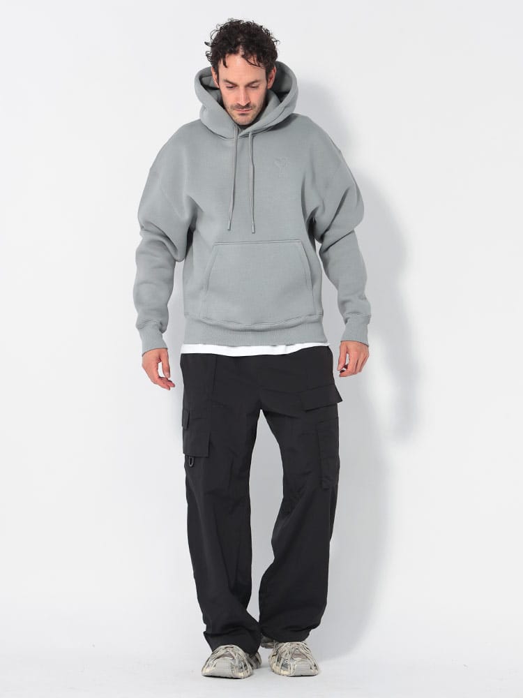 AMI PARISのパーカーは、柔らかく暖かい裏起毛素材が特徴。胸元のロゴがさりげなくアクセントになり、カジュアルながらも上品な印象です。リラックス感のあるシルエットで、デイリーユースに最適。一枚でもレイヤードスタイルにも合わせやすく、秋冬のマストアイテム。
