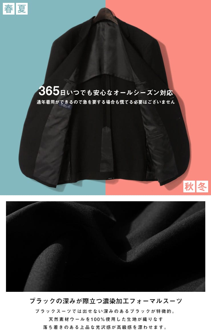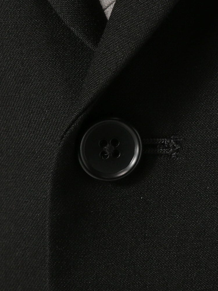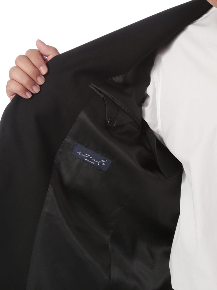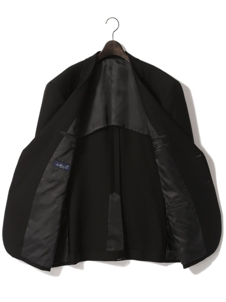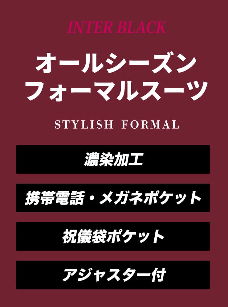 インターブラック シングル 2ツ釦 フォーマルスーツです。パンツは両サイドアジャスターにて調整可能、濃染加工によるしっかりしたブラック、携帯電話・メガネ・祝儀袋ポケット、オールシーズンタイプの多機能礼服となっております。