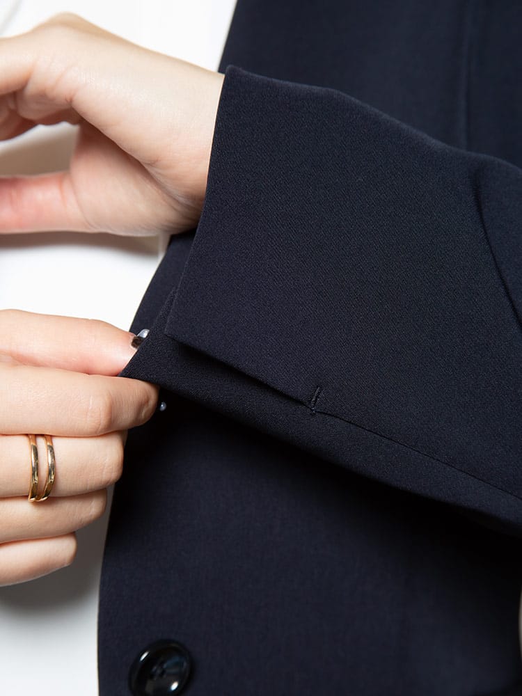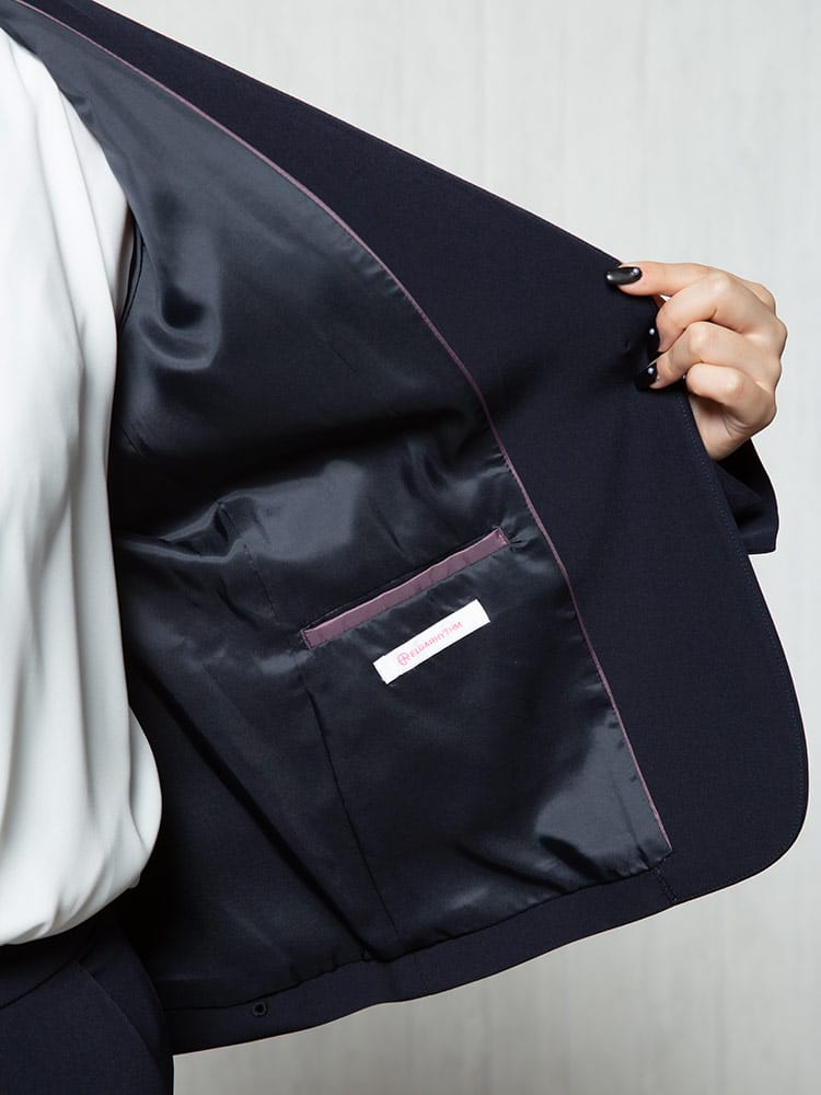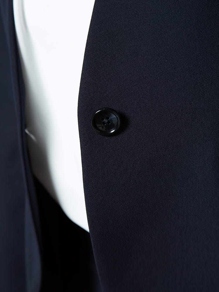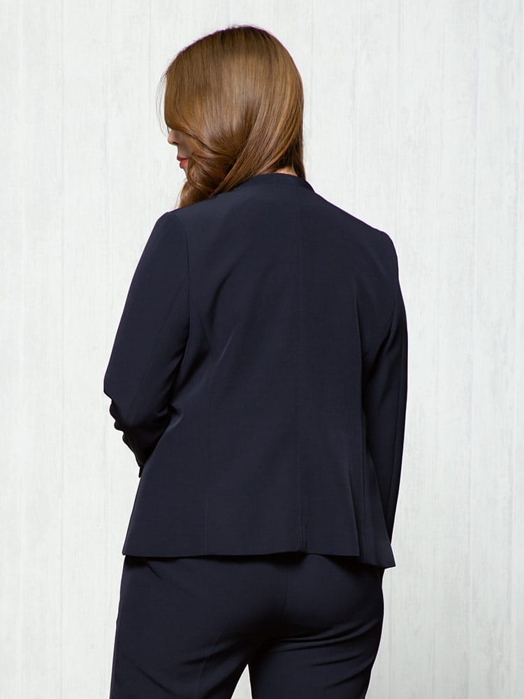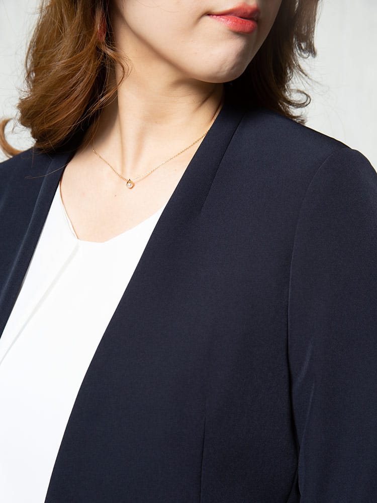 ウォッシャブル機能が付いたシングル ノーカラー ジャケット。無地のデザインでフォーマルやビジネスに◎。ノーカラーデザインでスッキリとした印象のアイテム。ウォッシャブルでご家庭で簡単にお手入れできちゃいます。生地に2WAYストレッチ素材を使用しているのでフィット感ある着心地♪