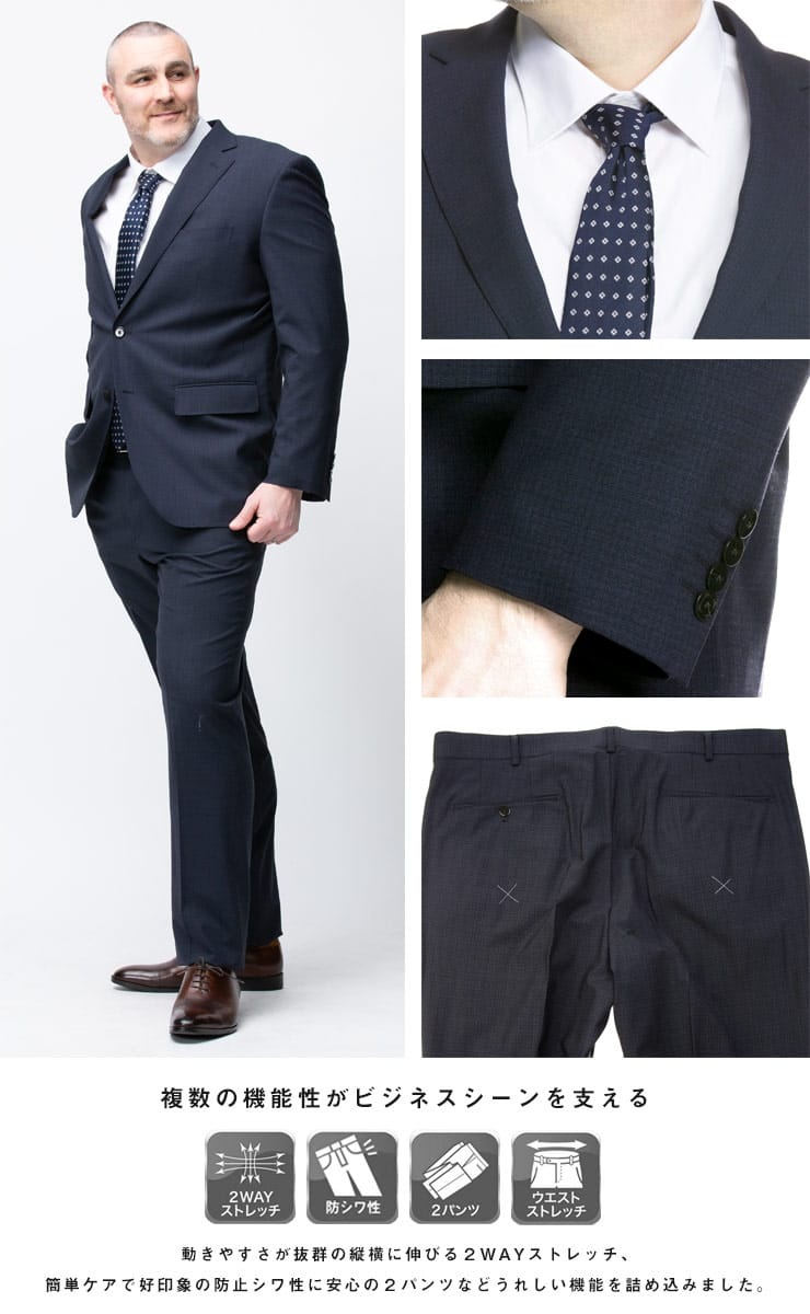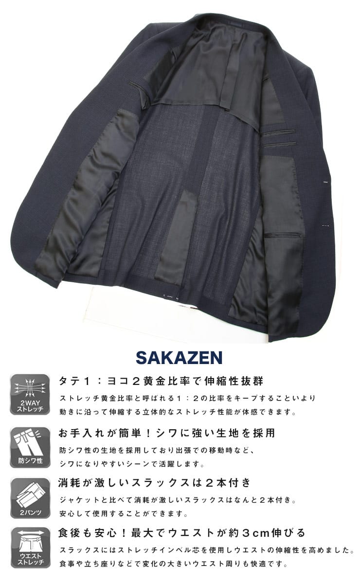 仕様 :ジャケット外側ポケット数×3つ / 内側ポケット数×4つ / パンツ外側ポケット数×4つ / シングル2つボタン / ワンタック / ツーパンツ / 背抜き / センターベント / 額縁無し / セッパタイプ