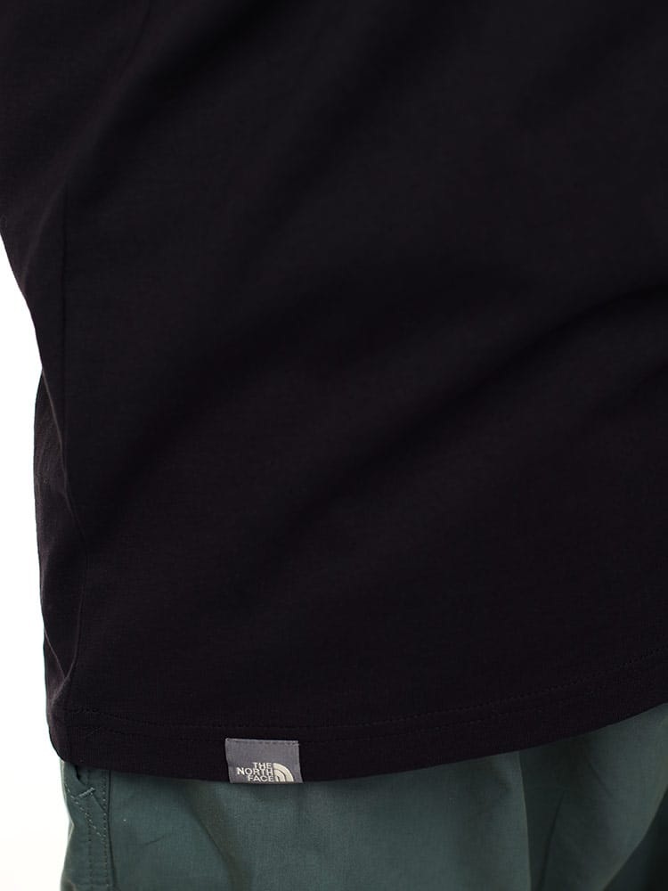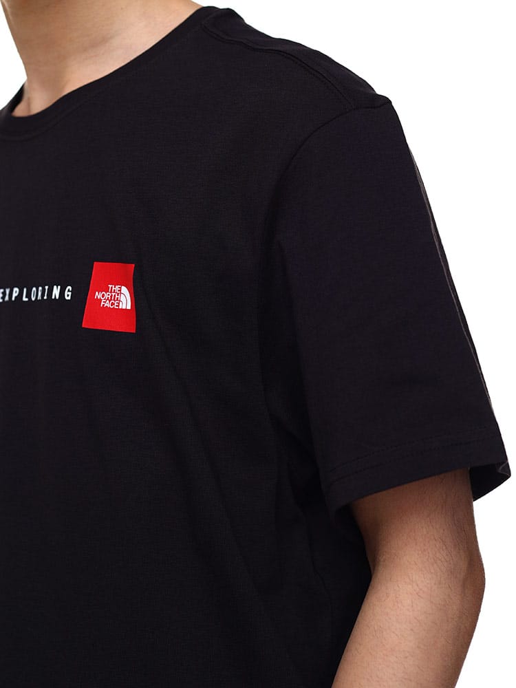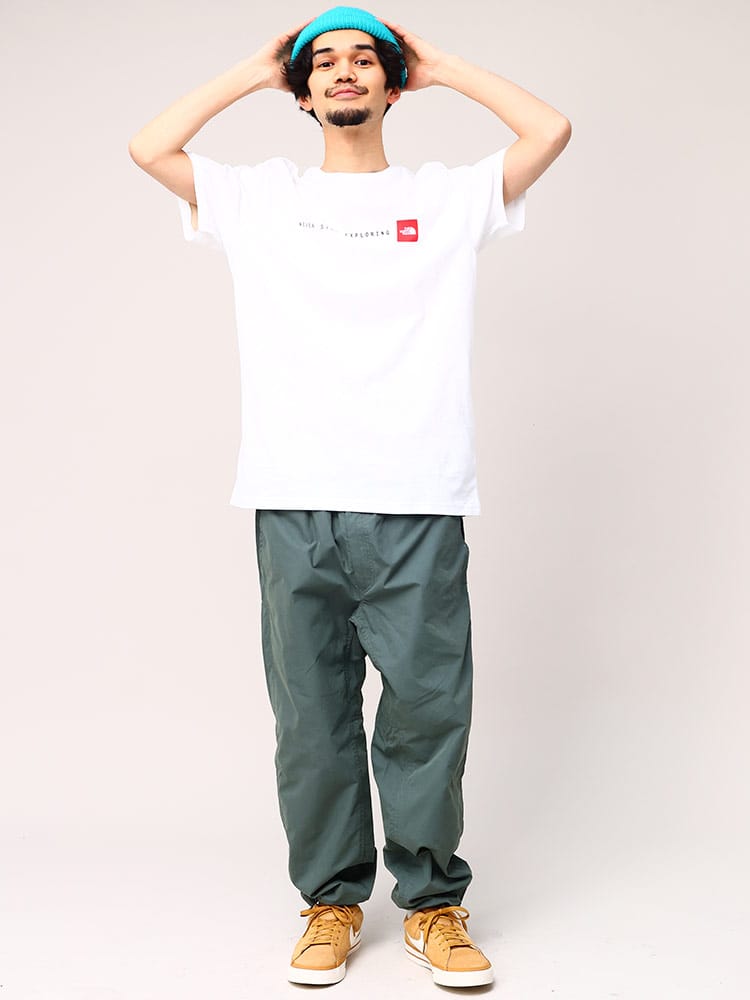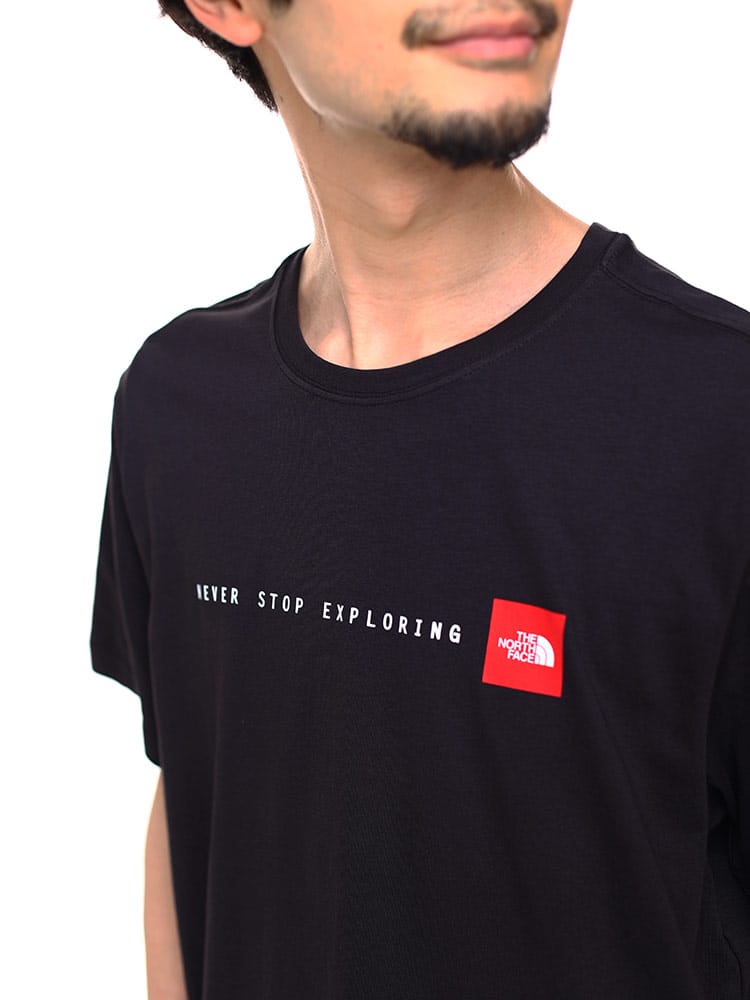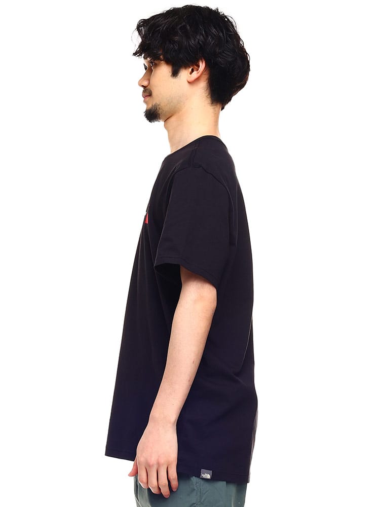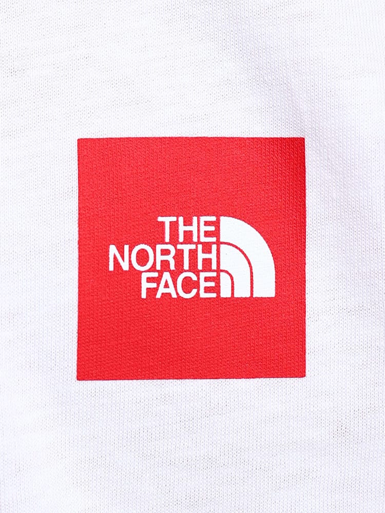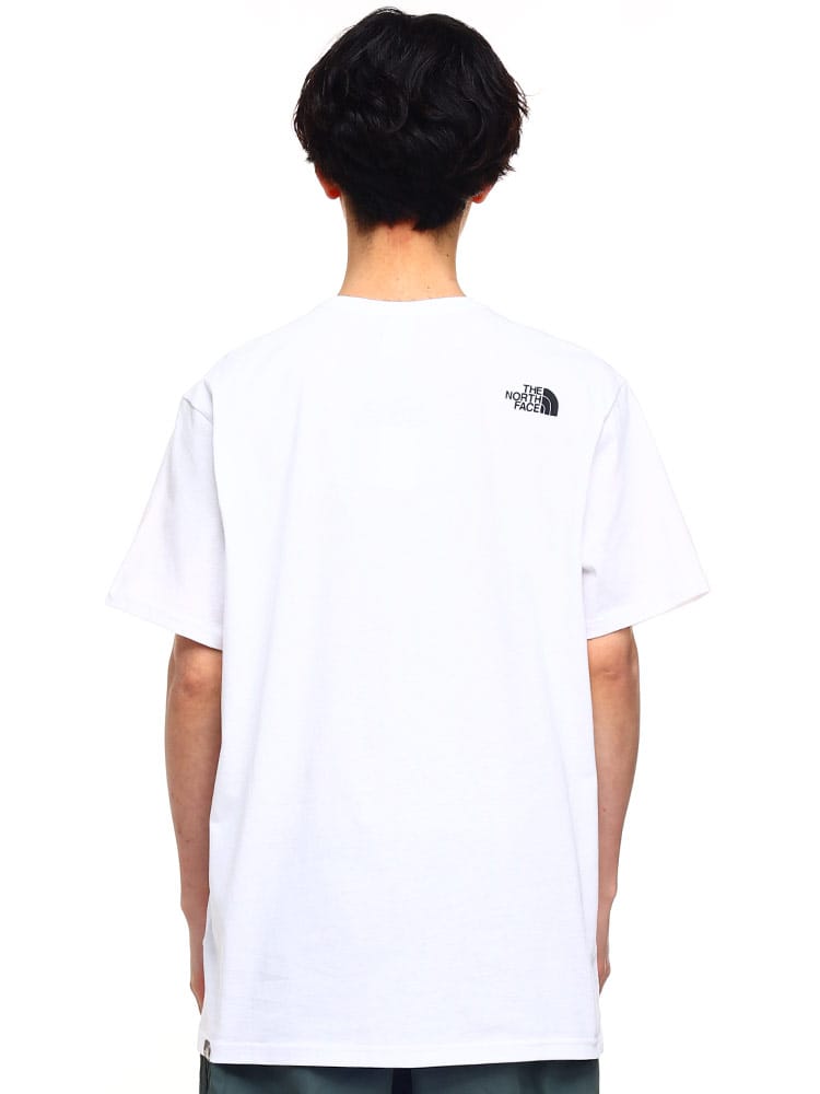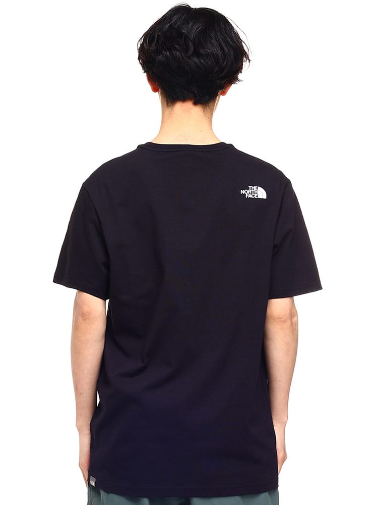 ノースフェイスのプリント半袖Tシャツです。フロントにはノースフェイスのスローガンであるNEVER STOP EXPLORINGの文字と、ボックスロゴがプリントされたシンプルなデザイン。背面右側には小さくブランドロゴプリントが入ります。