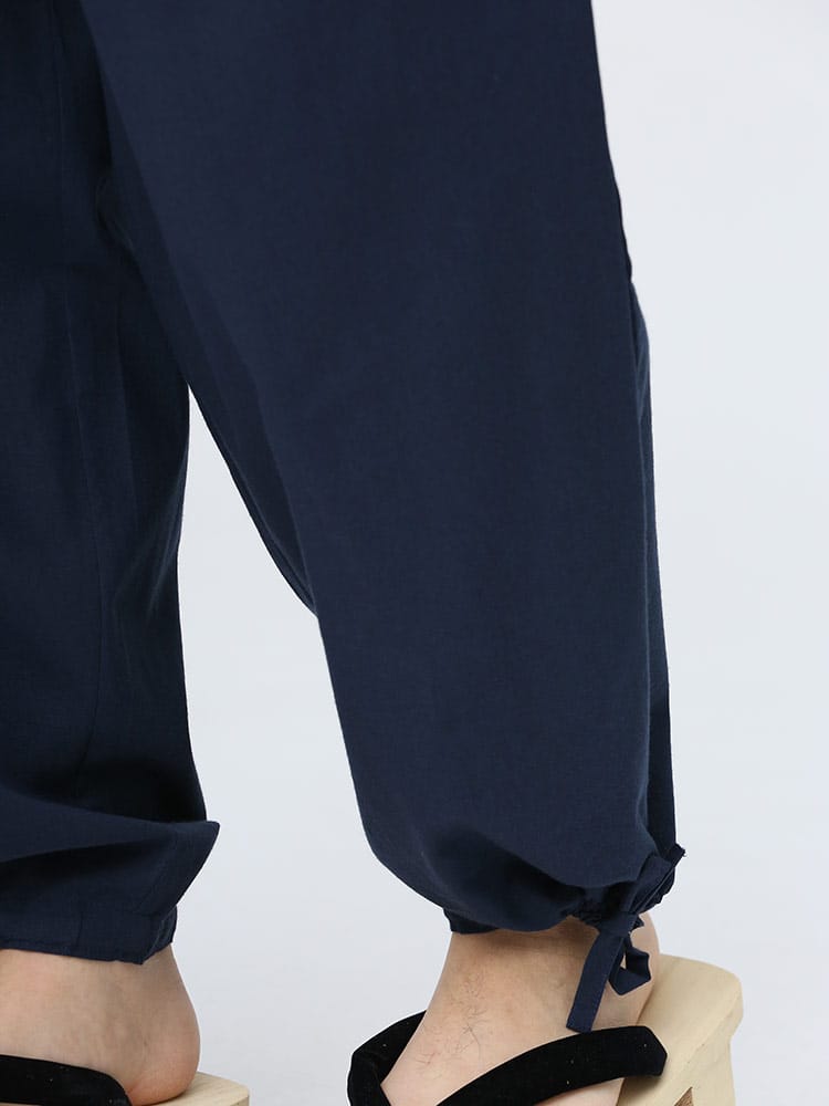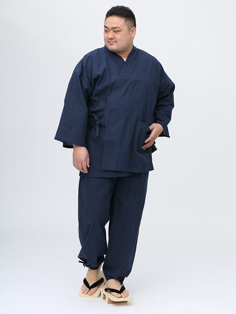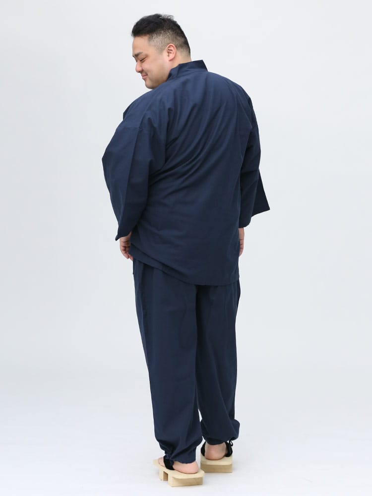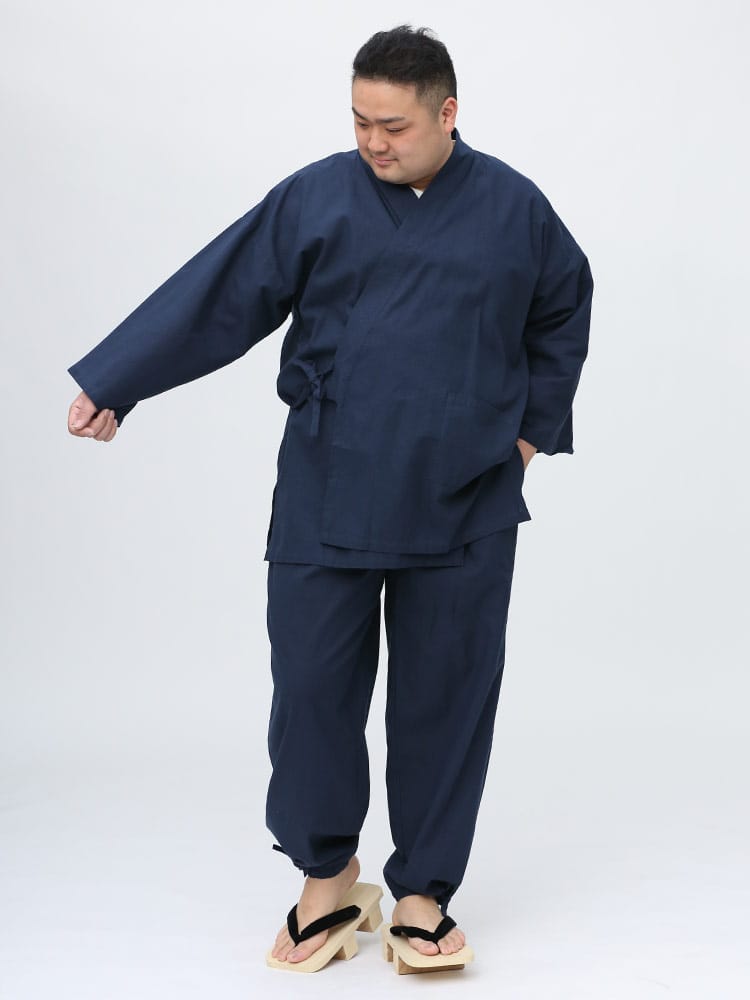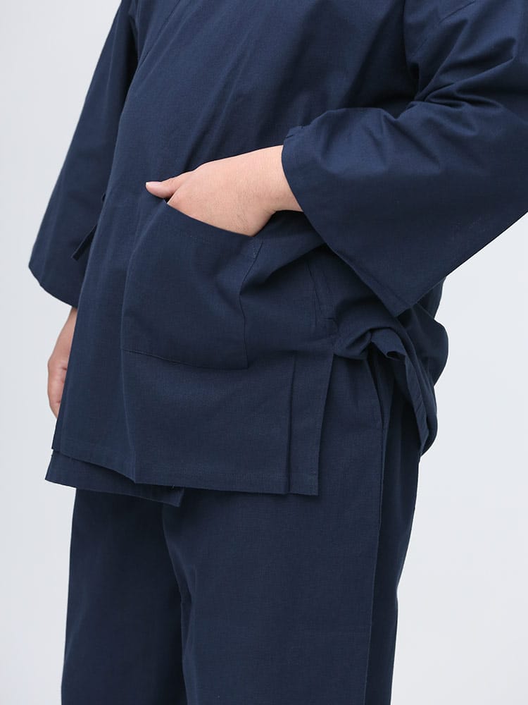 先染めで仕上げたシンプルなデザインの作務衣です。パンツのウエストはゴムとドローコード付きでゆったりとした穿き心地。パンツ裾にはサイズ調整出来るドローコード付き。肌触りの良いコットン生地を使用し、着心地抜群です。ちょっとした庭作業やリラックスタイムにおすすめ一着。