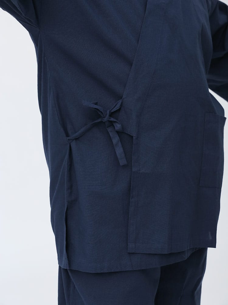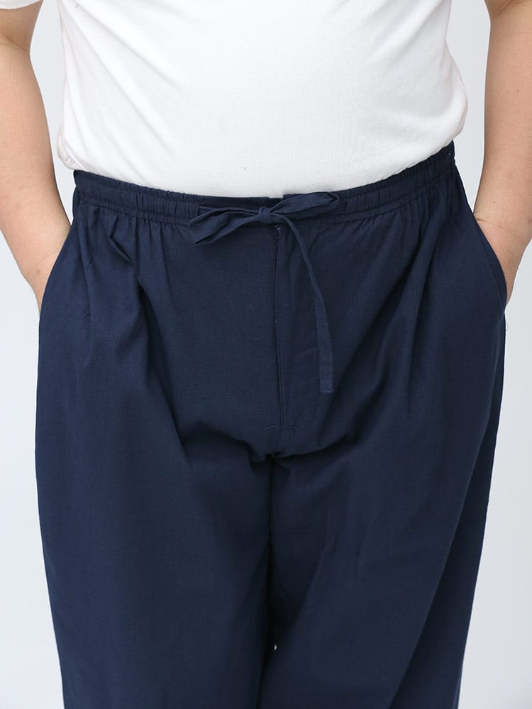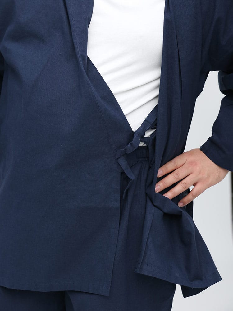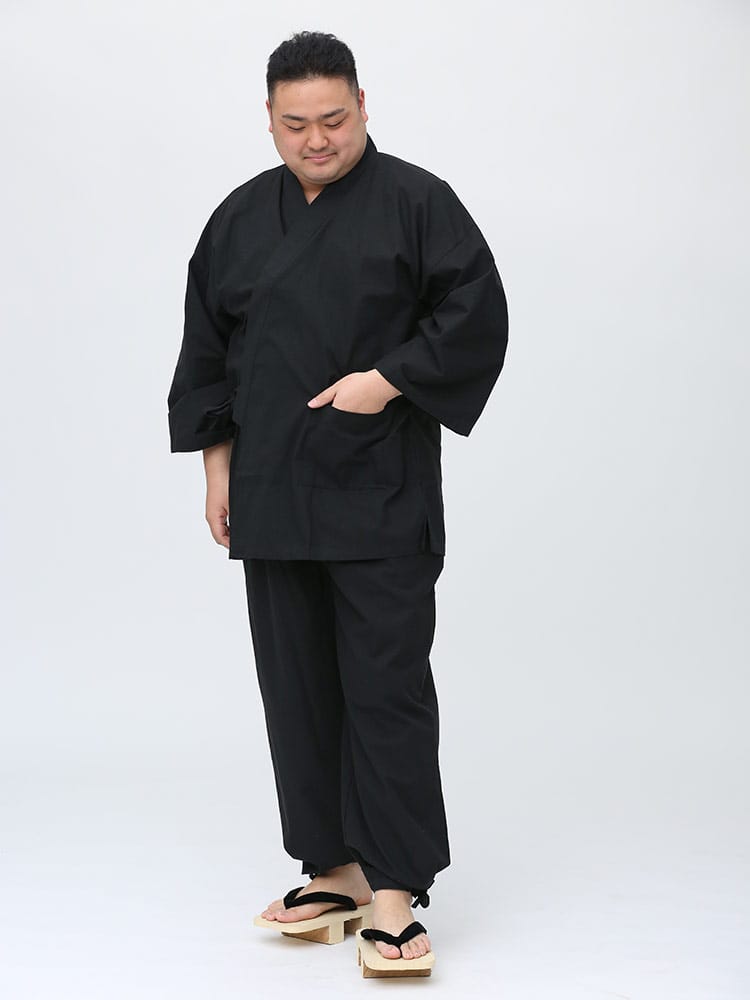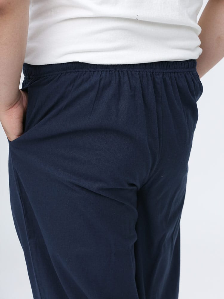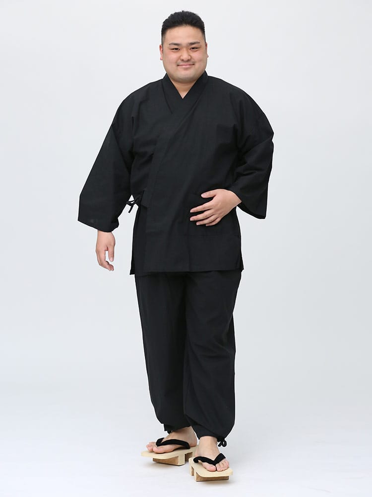 先染めで仕上げたシンプルなデザインの作務衣です。パンツのウエストはゴムとドローコード付きでゆったりとした穿き心地。パンツ裾にはサイズ調整出来るドローコード付き。肌触りの良いコットン生地を使用し、着心地抜群です。ちょっとした庭作業やリラックスタイムにおすすめ一着。