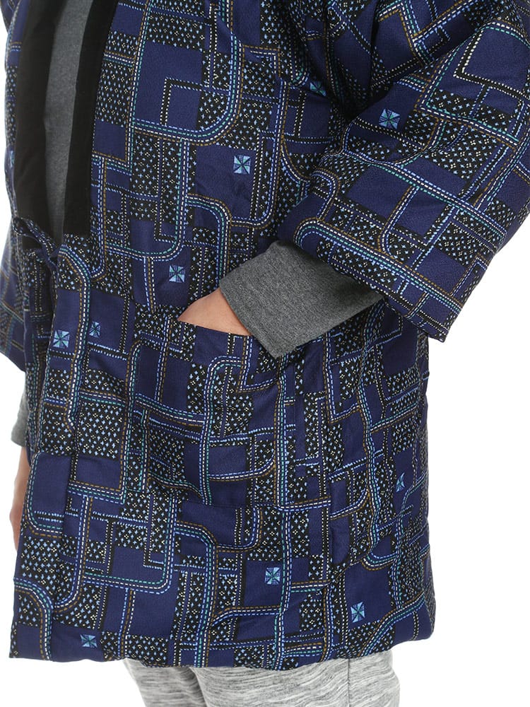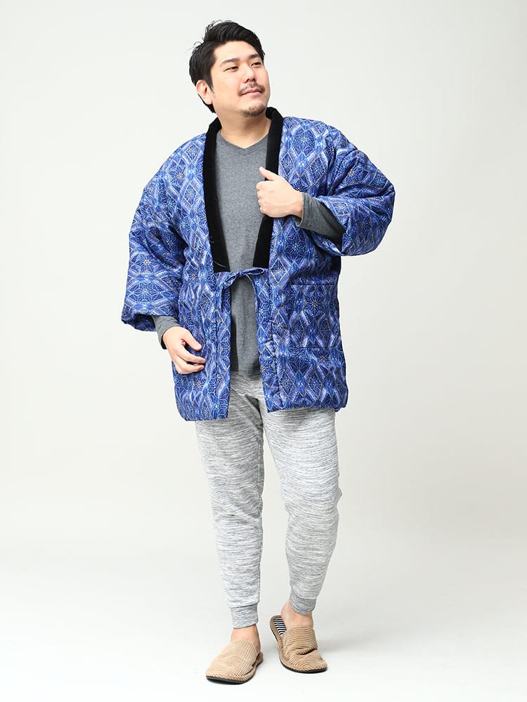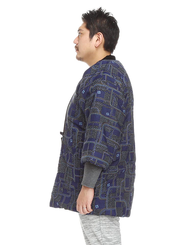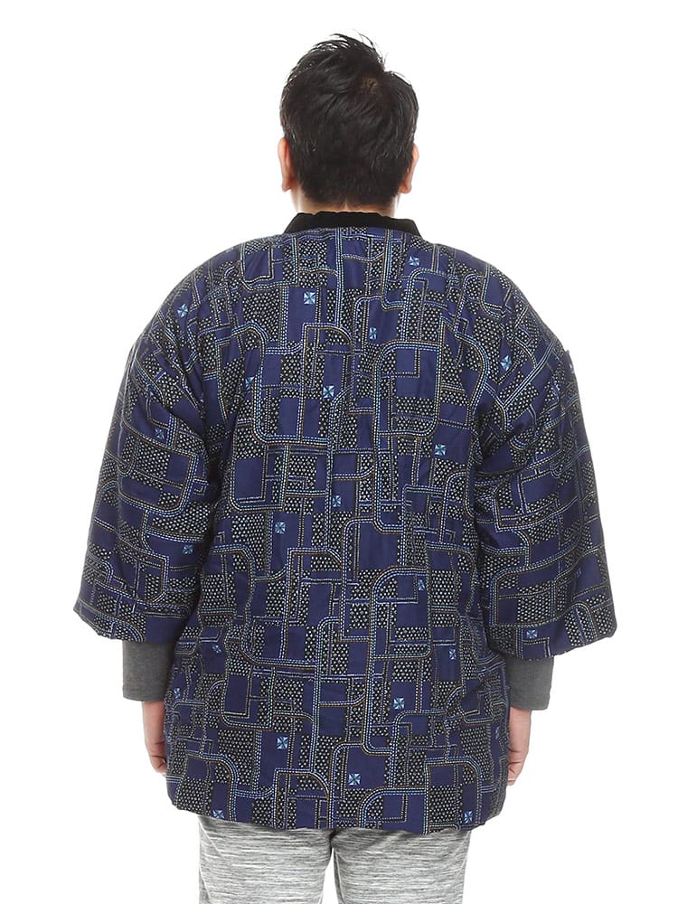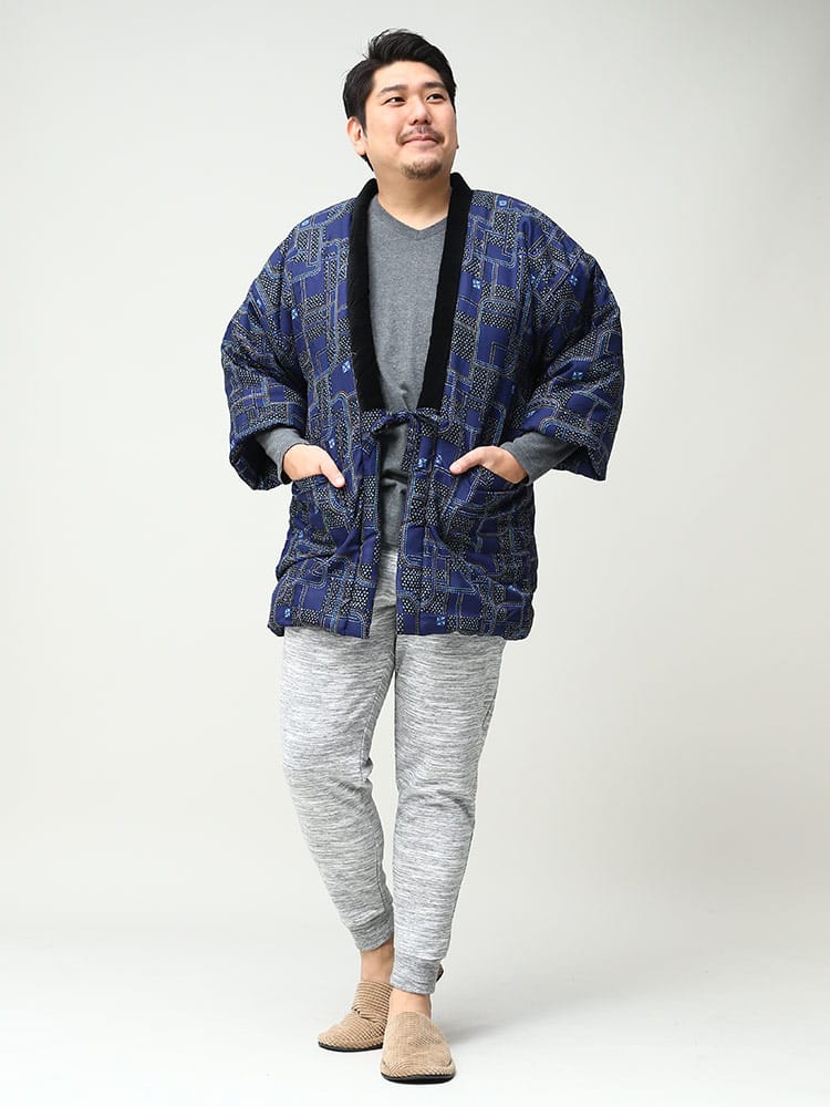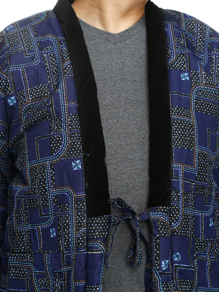 寒い冬も快適に過ごせる裏ボア 総柄 中綿 はんてんです。はんてんらしさのある和風な模様をあしらったデザイン。フロントは紐で結んで留めることができます。裏地にボアを使用しているので、中綿と合わせてさらに温かな着心地で、お家で快適に過ごせるアイテムです。