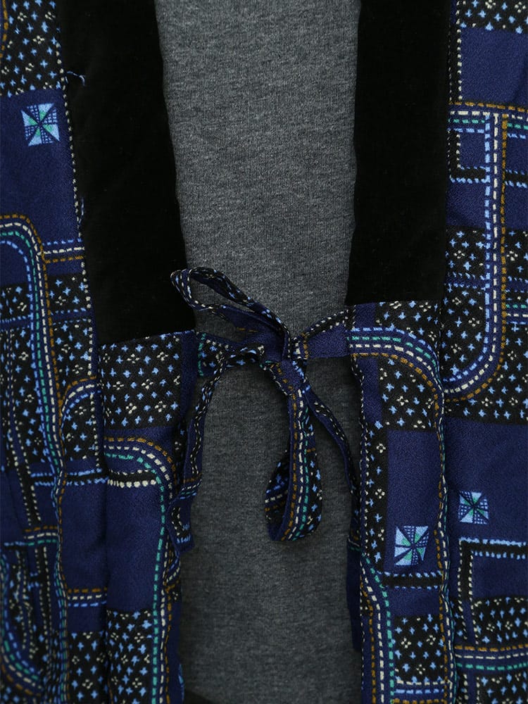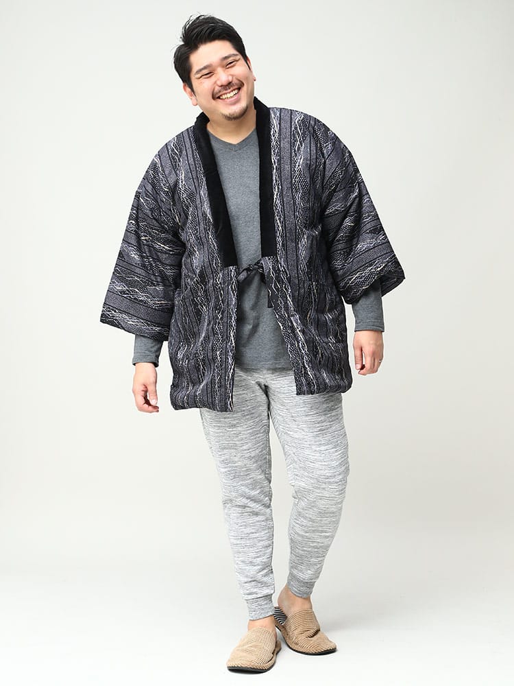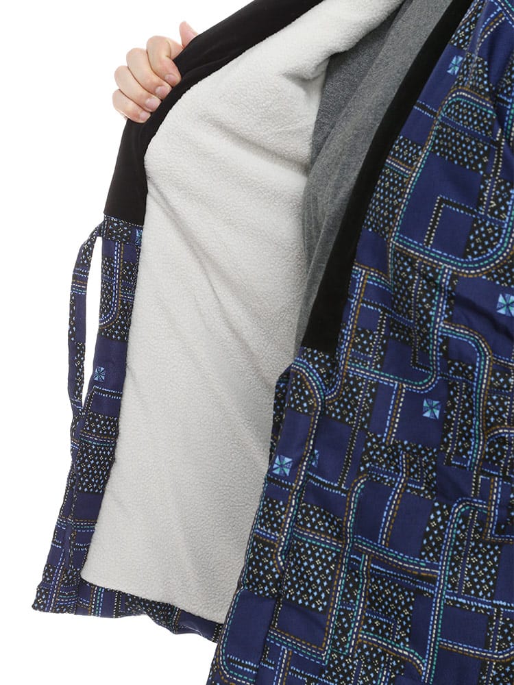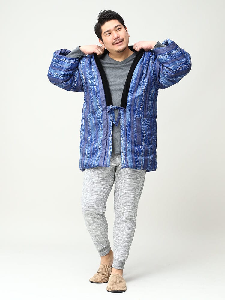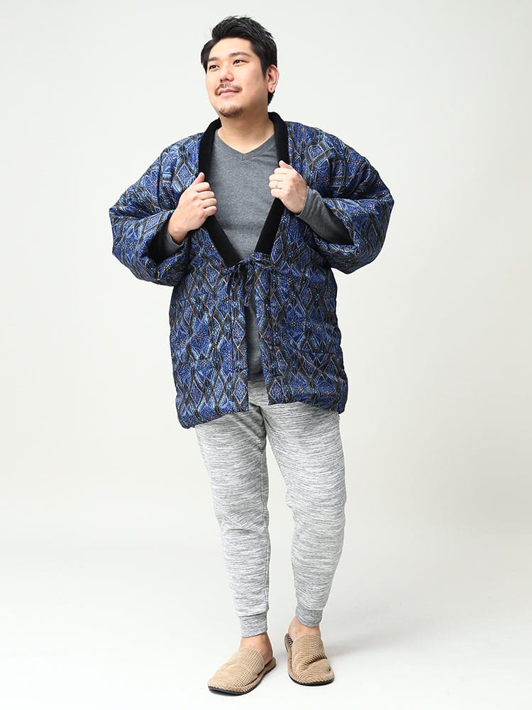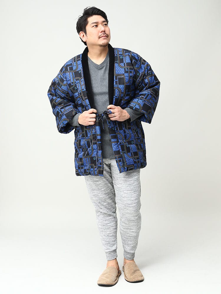 寒い冬も快適に過ごせる裏ボア 総柄 中綿 はんてんです。はんてんらしさのある和風な模様をあしらったデザイン。フロントは紐で結んで留めることができます。裏地にボアを使用しているので、中綿と合わせてさらに温かな着心地で、お家で快適に過ごせるアイテムです。